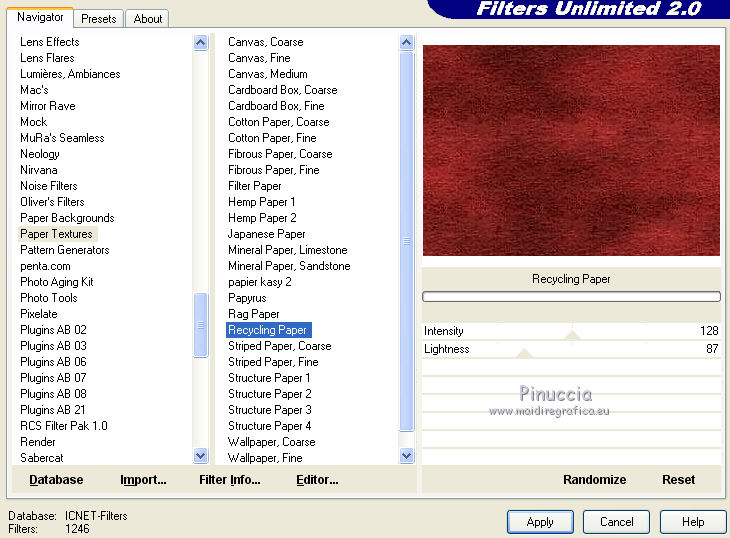 4. Effetti>Plugins>Filters Unlimited 2.0 - Paper Textures - Recycling paper, con i settaggi standard.