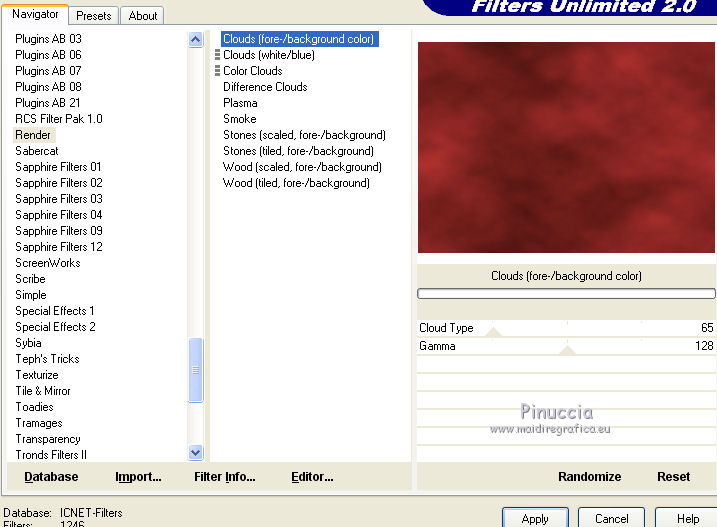 3. Effetti>Plugins>Filters Unlimited 2.0 - Render - Clouds/fore-/background color), con i settaggi standard.
