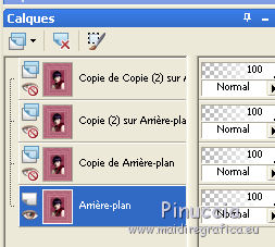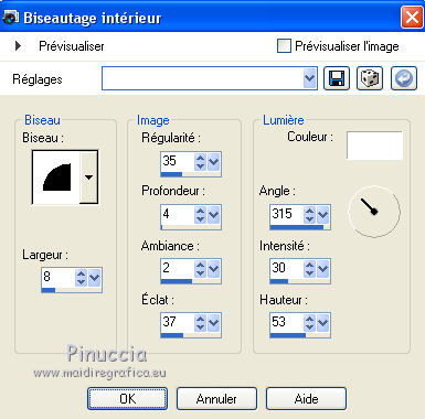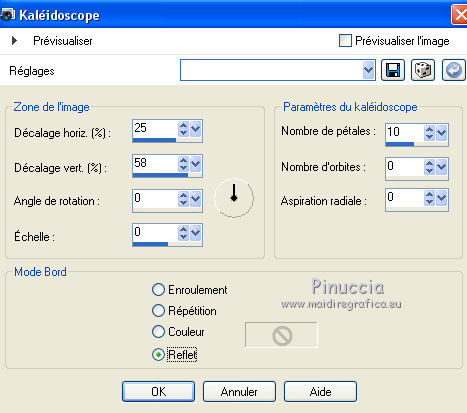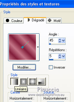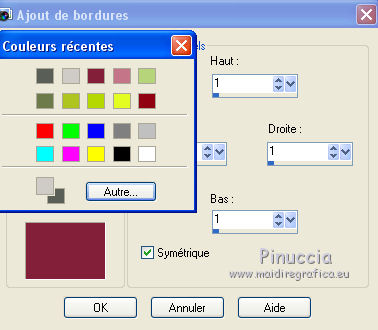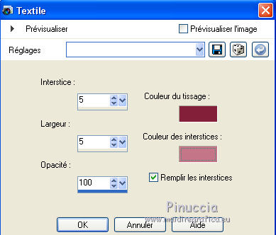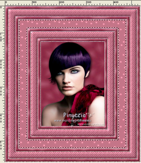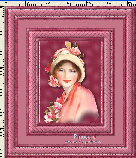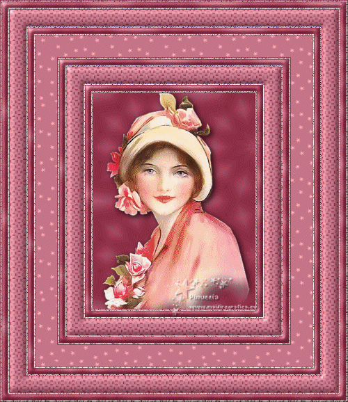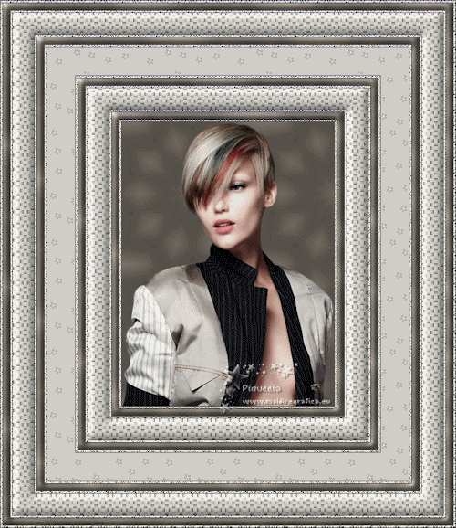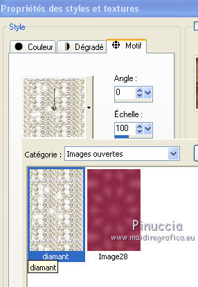 Ce tutoriel a été créé et traduit avec CorelX12, mais il peut également être exécuté avec les autres versions. Suivant la version utilisée, vous pouvez obtenir des résultats différents. Depuis la version X4, la fonction Image>Miroir a été remplacée par Image>Renverser horizontalement, et Image>Renverser avec Image>Renverser verticalement . Dans les versions X5 et X6, les fonctions ont été améliorées par la mise à disposition du menu Objets. Avec la nouvelle version X7, nous avons encore Image>Miroir et Image>Renverser/Retourner, mais avec nouvelles différences. Voir les détails à ce sujet ici Certaines dénominations ont changées entre les versions de PSP. Les plus frequentes dénominations utilisées: ![]() Traduction en italien ici Nécessaire pour réaliser ce tutoriel: Un tube à choix. Le reste du matériel ici Le tube de ma version est de Narah Pamplona Animation Shop ici ![]() Ouvrir la texture "Diamant" in PSP et la minimiser avec le reste du matériel. 1. Ouvrir une nouvelle image transparente 200 x 200 pixels, pour réaliser un motif. 2. Choisir deux couleurs de votre tube. et en arrière plan la couleur foncée. ![]() Préparer en avant plan un dégradé de premier plan/arrière plan, style Linéaire. ![]() Remplir l'image transparente du dégradé.4. Effets>Effets artistiques>Émail. ![]() 5. Effets>Effets de réflexion>Kaléïdoscope. ![]() Minimiser cette image. 6. Placer en avant plan Motif et chercher l'image sous la catégorie Images ouvertes. Sélectionner l'image, qui aura un numéro progressive des images ouverts jusqu'à ce moment, avec ces réglages. ![]() 7. Placer en arrière plan Motif, sous la catégorie Images ouvertes sélectionner le motif "Diamant". ![]() 8. Ouvrir une nouvelle image transparente 300 x 400 pixels, et remplir avec le motif d'avant plan.9. Sélections>Sélectionner tout. Calques>Nouveau calque raster. 10. Ouvrir votre tube et Édition>Copier. Revenir sur votre travail et Édition>Coller dans la sélection. Sélections>Désélectionner tout. 11. Effets>Effets 3D>Ombre portée. ![]() 12. Image>Ajouter des bordures, 1 pixel, symétrique, couleur d'arrière plan. Cliquer avec la touche droite de la souris sur la palette de la couleur, et vous aurez la table des couleurs récentes; en bas à gauche, les petites palettes des vos couleurs d'avant plan et arrière plan. (même si vous avez placé un dégradé ou un motif, sera disponible la couleur pleine) Pour placer la couleur du bord, cliquer sur sa petite palette. ![]() 13. Image>Ajouter des bordures, 2 pixels, symétrique, couleur claire. Activer l'outil Baguette magique ![]() ![]() et cliquer sur le dernier bord pour le sélectionner. Remplir avec le motif d'arrière plan.Effets>Effets de bords>Accentuer. Sélections>Désélectionner tout. 14. Image>Ajouter des bordures, 1 pixel, symétrique, couleur foncée. Image>Ajouter des bordures, 10 pixels, symétrique, couleur claire. Sélectionner ce bord avec la baguette magique ![]() et remplir avec le motif d'avant plan.Effets>Effets de bords>Accentuer. 15. Effets>Effets 3D>Bisautage intérieur. ![]() Sélections>Désélectionner tout. 16. Image>Ajouter des bordures, 1 pixel, symétrique, couleur foncée. Image>Ajouter des bordures, 2 pixels, symétrique, couleur claire. Sélectionner ce bord avec la baguette magique ![]() et remplir avec le motif d'arrière plan (diamant).Effets>Effets de bords>Accentuer. Sélections>Désélectionner tout. 17. Image>Ajouter des bordures, 1 pixel, symétrique, couleur foncée. Image>Ajouter des bordures, 30 pixels, symétrique, couleur claire. Sélectionner ce bord avec la baguette magique ![]() 18. Effets>Effets de textures>Textile. couleur du tissage: couleur foncée - couleur des interstices: couleur claire. ![]() Effets>Effets 3D>Bisautage intérieur, comme précédemment. Sélections>Désélectionner tout. 19. Image>Ajouter des bordures, 1 pixel, symétrique, couleur foncée. Image>Ajouter des bordures, 2 pixels, symétrique, couleur claire. Sélectionner ce bord avec la baguette magique ![]() et remplir avec le motif d'arrière plan (diamant).Effets>Effets de bords>Accentuer. Sélections>Désélectionner tout. 20. Image>Ajouter des bordures, 1 pixel, symétrique, couleur foncée. Image>Ajouter des bordures, 10 pixels, symétrique, couleur claire. Sélectionner ce bord avec la baguette magique ![]() et remplir avec le motif d'avant plan.Effets>Effets de bords>Accentuer. Effets>Effets 3D>Bisautage intérieur, comme précédemment. Sélections>Désélectionner tout. 21. Image>Ajouter des bordures, 1 pixel, symétrique, couleur foncée. Image>Ajouter des bordures, 2 pixels, symétrique, couleur claire. Sélectionner ce bord avec la baguette magique ![]() et remplir avec le motif d'arrière plan (diamant).Effets>Effets de bords>Accentuer. Sélections>Désélectionner tout. 22. Image>Ajouter des bordures, 1 pixel, symétrique, couleur foncée. Image>Ajouter des bordures, 40 pixels, symétrique, couleur claire. Image>Ajouter des bordures, 1 pixel, symétrique, couleur foncée. Image>Ajouter des bordures, 2 pixels, symétrique, couleur claire. Sélectionner le dernier bord avec la baguette magique ![]() et remplir avec le motif d'arrière plan (diamant).Effets>Effets de bords>Accentuer. Sélections>Désélectionner tout. 23. Image>Ajouter des bordures, 1 pixel, symétrique, couleur foncée. Image>Ajouter des bordures, 10 pixels, symétrique, couleur claire. Sélectionner ce bord avec la baguette magique ![]() et remplir avec le motif d'avant plan.Effets>Effets de bords>Accentuer. Effets>Effets 3D>Bisautage intérieur, comme précédemment. Sélections>Désélectionner tout. 24. Image>Ajouter des bordures, 1 pixel, symétrique, couleur foncée. Image>Ajouter des bordures, 2 pixels, symétrique, couleur claire. Sélectionner ce bord avec la baguette magique ![]() et remplir avec le motif d'arrière plan (diamant).Effets>Effets de bords>Accentuer. Sélections>Désélectionner tout. 25. Image>Ajouter