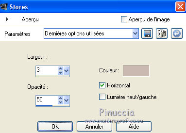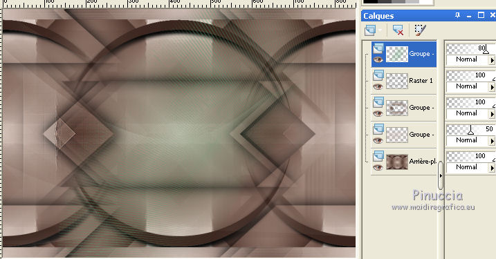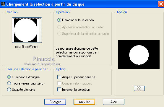J'ai traduit ce tutoriel avec CorelX12, mais il peut également être exécuté avec les autres versions. Suivant la version utilisée, vous pouvez obtenir des résultats différents. Depuis la version X4, la fonction Image>Miroir a été remplacée par Image>Renverser horizontalement, et Image>Renverser avec Image>Renverser verticalement . Dans les versions X5 et X6, les fonctions ont été améliorées par la mise à disposition du menu Objets. Avec la nouvelle version X7, nous avons à nouveau Miroir/Retourner, mais avec nouvelles différences. Consulter, si vouz voulez, mes notes ici Certaines dénominations ont changées entre les versions de PSP. Les plus frequentes dénominations utilisées: ![]() Traduction en italien ici Vos versions ici Nécessaire pour réaliser ce tutoriel: Matériel qui Merci: pour le tube AnaRidzi et pour le masque Narah Garder le nom du tube. Le © appartient à l'artiste original. Garder le crédit de ceux qui ont créé le tube. Modules Externes: consulter, si nécessaire, ma section des filtres ici Filters Unlimited 2.0 ici DC Special ici Simple ici Filtres DC Special et Simple peuvent être utilisés seuls ou importés dans Filters Unlimited. voir comment le faire ici). Si un filtre est fourni avec cette icône, ![]() Si vous voulez utiliser vos propres couleurs, n'hésitez pas à changer le mode et l'opacité des calques Placer les sélections dans le dossier Sélections. Placer le masque 20-20 dans le dossier Masques. Ouvrir le deuxième masque dans PSP et le minimiser avec le reste du matériel. 1. Ouvrir une nouvelle image transparente 650 x 500 pixels. 2. Placer en avant plan la couleur claire #c9b9b1, et en arrière plan la couleur foncée #37211a. ![]() Préparer un dégradé d'avant plan/arrière plan, style Linéaire. ![]() 3. Remplir l'image transparente du dégradé.4. Calques>Dupliquer. Image>Miroir. Réduire l'opacité de ce calque à 50%. Calques>Fusionner>Fusionner le calque de dessous. 5. Effets>Modules Externes>DC Special - Jaggedge. couleur d'avant plan #c9b9b1 ![]() 6. Effets>Effets de bords>Accentuer davantage. Calques>Dupliquer. 7. Effets>Modules Externes>Simple - Blintz. Effets>Modules Externes>Simple - Pizza slice mirror. 8. Placer le calque en mode Lumière douce. ![]() Calques>Fusionner>Fusionner le calque de dessous. 9. Effes>Effets d'image>Mosaïque sans jointures. ![]() 10. Calques>Dupliquer. Image>Miroir. Réduire l'opacité de ce calque à 50%. 11. Image>Ajouter des bordures, symétrique décoché, couleur d'avant plan. ![]() 12. Effets>Effets d'image>Mosaïque sansa jointures, par défaut. ![]() 13. Calques>Nouveau calque raster. Activer l'outil Sélection ![]() (peu importe le type de sélection, parce que avec la sélection personnalisée vous obtenez toujours un rectangle), cliquer sur Sélection personnalisée ![]() et setter ces paramètres. ![]() Remplir la sélection avec la couleur d'arrière plan.Sélections>Désélectionner tout. 14. Effets>Modules Externes>Simple - Half wrap. 15. Effets>Effets géométriques>Cercle. ![]() 16. Effets>Effets 3D>Ombre portée, couleur noire. ![]() 17. Calques>Nouveau calque raster. Sélections>Charger/Enregistrer une sélection>Charger à partir du disque. Chercher et charger la sélection esra-1-cre@nnie. ![]() Placer en avant plan la Couleur, et remplir la sélection avec la couleur d'avant plan.Sélections>Désélectionner tout. 18. Effets>Modules Externes>Dc special - Book. ![]() 19. Placer le calque en mode Lumière douce. 20. Effets>Effets 3D>Ombre portée, comme précédemment. 21. Vous positionner sur le calque du bas de la pile. 22. Sélections>Charger/Enregistrer une sélection>Charger à partir du disque. Chercher et charger la sélection esra-2-cre@nnie. ![]() Sélections>Transformer la sélection en calque. 23. Effets>Effets 3D>Ombre portée, couleur noire. ![]() 24. Sélections>Modifier>Contracter - 25 pixels. 25. Effets>Effets 3D>Ombre portée, comme précédemment. Sélections>Désélectionner tout. 26. Calques>Agencer>Placer en haut de la pile. ![]() 27. Édition>Copie spéciale>Copier avec fusion. éventuellement, pour précaution: Édition>Coller comme nouvelle image, et minimiser cette image que vous pouvez copier si ne la trouvez plus en mémoire 28. Image>Ajouter des bordures, symétrique décoché, comme précédemment. ![]() 29. Effets>Effets d'image>Mosaïque sans jointures. ![]() 30. Sélections>Charger/Enregistrer une sélection>Charger à partir du disque. Chercher et charger la sélection esra-4-cre@nnie. ![]() 31. Sélections>Inverser. Effets>Effets d'image>Mosaïque sans jointures, par défaut. ![]() 32. Sélections>Inverser. Effets>Effets de textures>Stores - couleur d'avant plan. ![]() Sélections>Désélectionner tout. 33. Calques>Nouveau calque raster. Remplir avec la couleur d'avant plan.34. Calques>Nouveau calque de masque>A partir d'une image. Ouvrir le menu deroulant sous la fenêtre d'origine et vous verrez la liste des images ouverts. Charger le masque Narah_mask_0493. ![]() Calques>Fusionner>Fusionner le groupe. Réduire l'opacité de ce calque à 50%. 35. Édition>Coller comme nouveau calque (l'image en mémoire du point 27). 36. Sélections>Charger/Enregistrer une sélection>Charger à partir du disque. Chercher et charger la sélection esra-3-cre@nnie. ![]() Presser CANC sur le clavier ![]() Sélections>Désélectionner tout. 37. Effets>Effets 3D>Ombre portée, comme précédemment. 38. Caques>Charger/Enregistrer un masque>Charger à partir du disque. Chercher et charger le masque 20-20. ![]() Calques>Fusionner>Fusionner le groupe. 39. Image>Miroir. 40. Calques>Nouveau calque raster. Sélections>Charger/Enregistrer une sélection>Charger à partir du disque. Chercher et charger la sélection esra-3-cre@nnie. ![]() 41. Effets>Effets 3D>Ombre portée, comme précédemment. Sélections>Désélectionner tout. 42. Effets>Effets d'image>Mosaïque sans jointures, comme précédemment. 43. Placer en avant plan une couleur contrastante. pour l'e