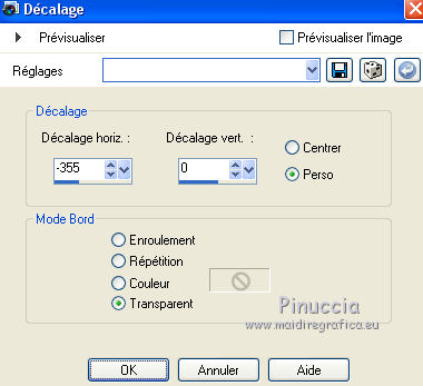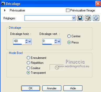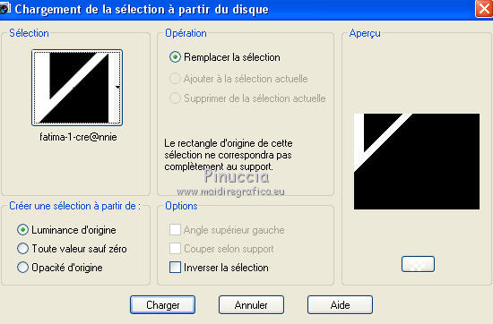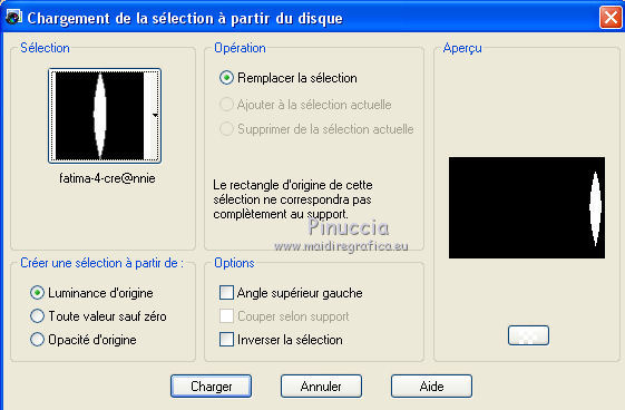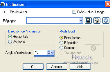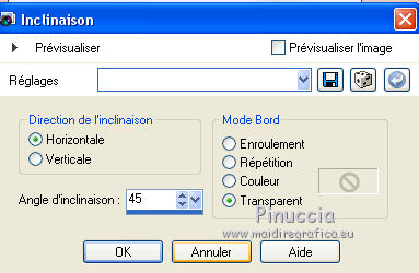 Ce tutoriel a été créé avec CorelX6 et traduit avec CorelX12, mais il peut également être exécuté avec les autres versions. Suivant la version utilisée, vous pouvez obtenir des résultats différents. Depuis la version X4, la fonction Image>Miroir a été remplacée par Image>Renverser horizontalement, et Image>Renverser avec Image>Renverser verticalement. Dans les versions X5 et X6, les fonctions ont été améliorées par la mise à disposition du menu Objets. Avec la nouvelle version X7, nous avons encore Image>Miroir et Image>Renverser/Retourner, mais avec nouvelles différences. Voir les détails à ce sujet ici Certaines dénominations ont changées entre les versions de PSP. Les plus frequentes dénominations utilisées: ![]() Traduction en italien ici Vos versions ici Nécessaire pour réaliser ce tutoriel: Matériel ici Pour le tube merci Min@ et Mou Modules Externes: consulter, si nécessaire, ma section des filtres ici Filters Unlimited 2.0 ici &<Bkg Designer sf10IV> - @Easy Corner UpperLeft (da importare in Unlimited) ici &<Bkg Kaleidoscope> - XTile maker 10 - Kaleidoscope Persian (da importare in Unlimited) ici Richard Rosenman - Pixelate ici ![]() en fonction des couleurs utilisées, vous pouvez changer le mode mélange et l'opacité des calques. Dans les plus récentes versions de PSP, vous ne trouvez pas le dégradé d'avant plan/arrière plan ou Corel_06_029. Vous pouvez utiliser le dégradé des versions antérieures. Ici le dossier Dégradés de CorelX. Placer les preset dans les dossier Paramètres par défaut. Placer le preset Emboss 3 dans le dossier Paramètres par défaut. Placer le masque 20-20 dans le dossier Masques. Placer les sélections dans le dossier Sélections. 1. Ouvrir une nouvelle image transparente 650 x 500 pixels. 2. Placer en avant plan la couleur claire #e7ccba, et en arrière plan la couleur foncée #47496f. ![]() 3. Préparer en avant plan un dégradé de premier plan/arrière plan, style Linéaire. ![]() 4. Remplir l'image transparente du dégradé.5. Effets>Modules Externes>Richard Rosenman - Pixelate. 6. Calques>Dupliquer. 7. Effets>Effets géométriques>Inclinaison. ![]() 8. Calques>Fusionner>Fusionner le calque de dessous. 9. Sélections>Charger/Enregistrer une sélection>Charger à partir du disque. Chercher et charger la sélection fatima-1-cre@nnie. ![]() Sélections>Transformer la sélection en calque. Sélections>Désélectionner tout. 10. Effets>Effets 3D>Ombre portée, couleur noire. ![]() 11. Calques>Dupliquer. Image>Miroir. Image>Renverser. Calques>Fusionner>Fusionner le calque de dessous. 12. Calques>Dupliquer. Image>Miroir. Calques>Fusionner>Fusionner le calque de dessous. 13. Effets>Effets d'image>Mosaïque sans jointures, par défaut. ![]() 14. Image>Ajouter des bordures, symétrique décoché, couleur d'arrière plan. ![]() 15. Effets>Effets d'image>Mosaïque sans jointures. ![]() 16. Effets>Modules Externes>Filters Unlimited 2.0 - &<Bkg Designers sf10IV> - @Easy Corner UpperLeft ![]() 17. Sélections>Charger/Enregistrer une sélection>Charger à partir du disque. Chercher et charger la sélection fatima-2-cre@nnie. ![]() Sélections>Transformer la sélection en calque. Sélections>Désélectionner tout. 18. Effets>Effets de distorsion>Pixelisation. ![]() 19. Effets>Effets de distorsion>Vent - vers la gauche, intensité 100. ![]() 20. Effets>Effets de bords>Accentuer davantage. 21. Effets>Effets de bords>Dilater. 22. Calques>Dupliquer. Image>Miroir. 23. Effets>Effets géométriques,Inclinaison, comme précédemment. 24. Calques>Dupliquer. Image>Renverser. 25. Image>Ajouter des bordures, symétrique décoché, couleur d'avant plan. ![]() 26. Effets>Modules Externes>Filters Unlimited 2.0 - &<Bkg Kaleidoscope> - XTile maker 1.0. ![]() 27. Calques>Dupliquer. 28. Effets>Modules Externes>Filters Unlimited 2.0 - &<Bkg Kaleidoscope> - Kaleidoscope persian. ![]() 29. Calques>Charger/Enregistrer un masque>Charger à partir du disque. Chercher et charger le masque 20-20. ![]() Calques>Fusionner>Fusionner le groupe. 30. Effets>Filtre personnalisé - sélectionner le preset Emboss 3 et ok. ![]() Édition>Répéter Filtre personnalisé. 31. Placer le calque en mode Multiplier et réduire l'opacité à 70%. ![]() 32. Calques>Fusionner>Fusionner le calque de dessous. 33. Calques>Dupliquer. 34. Effets>Effets de distorsion>Distorsion de l'objectif. ![]() 35. Effets>Effets 3D>Ombre portée, comme précédemment. 36. Vous positionner sur le calque du bas de la pile. Réglage>Flou>Moyen. ![]() 37. Image>Rotation à droite. 38. Effets>Effets de distorsion>Pixelisation, comme précédemment. 39. Effets>Effets de bords>Accentuer davantage. Effets>Effets de bords>Dilater. 40. Image>Rotation à gauche. 41. Effets>Effets géométriques>Inclinaison. ![]() 42. Calques>Dupliquer. Image>Miroir. Placer le calque en mode Lumière douce. 43. Image>Ajouter des bordures, comme précédemment. ![]() 44. Effets>Effets d'image>Mosaïque sans jointures. ![]() 45. Calques>Dupliquer. 46. Presser la touche K pour activer l'outil Sélecteur ![]() ouvrir le menu des preset et sélectionner le preset fatima-cre@nnie-1 ![]() Résultat. ![]() Touche M pour désélectioner l'outil. 47. Effets>Effets 3D>Ombre portée, couleur noire. ![]() 48. Calques>Dupliquer. Image>Renverser. 49. Ouvrir le tube deco-1-fatima - Édition>Copier. Revenir sur votre travail et Édition>Coller comme nouveau calque. 50. Image>Rotation libre - 90 degrés à gauche. ![]() 51. Effets>Effets d'image>Décalage. ![]() 52. Touche K pour activer l'outil Sélecteur ![]() Ouvrir le menu des preset et sélectionner le preset fatima-cre@nnie-2 ![]() Résultat. ![]() Touche M pour désélectionner l'outil. 53. Calques>Dupliquer. Image>Miroir. 54. Effets>Effets d'image>Décalage. ![]() 55. Sélections>Charger/Enregistrer une sélection>Charger à partir du disque. Chercher et charger la sélection fatima-3-cre@nnie. ![]() Presser CANC sur le clavier ![]() Sélections>Désélectionner tout. 56. Calques