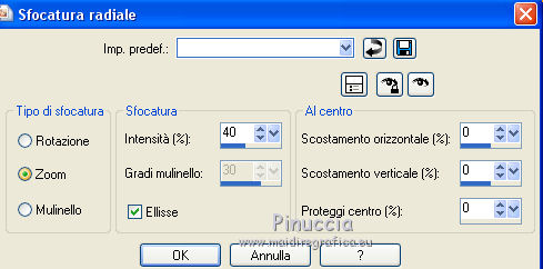 21. Regola>Sfocatura>Sfocatura radiale, con i settaggi precedenti, ma Zoom selezionato.