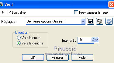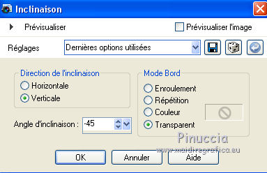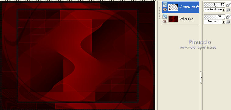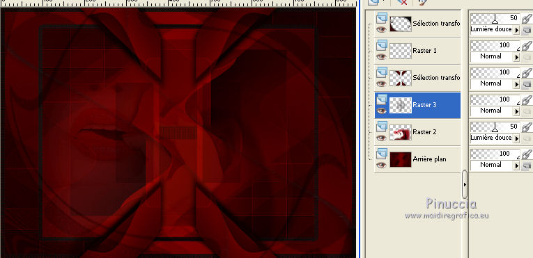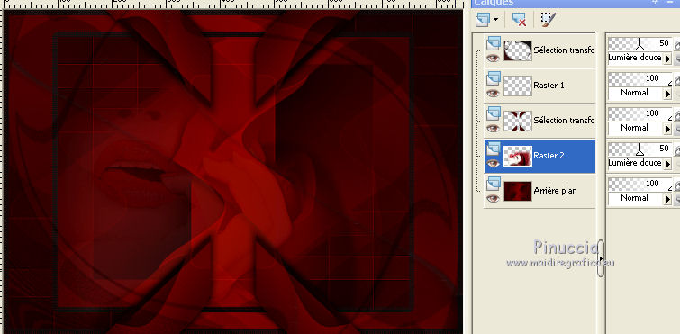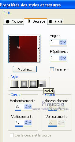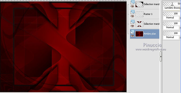 Ce tutoriel a été créé avec CorelX6 et traduit avec CorelX12, mais il peut également être exécuté avec les autres versions. Suivant la version utilisée, vous pouvez obtenir des résultats différents. Depuis la version X4, la fonction Image>Miroir a été remplacée par Image>Renverser horizontalement, et Image>Renverser avec Image>Renverser verticalement. Dans les versions X5 et X6, les fonctions ont été améliorées par la mise à disposition du menu Objets. Avec la nouvelle version X7, nous avons à nouveau Miroir/Retourner, mais avec nouvelles différences. Consulter, si vouz voulez, mes notes ici Certaines dénominations ont changées entre les versions de PSP. Les plus frequentes dénominations utilisées: ![]() Traduction en italien ici Vos versions ici Nécessaire pour réaliser ce tutoriel: Matériel ici Pour le tube merci Jeanne Garder le nom du tube. Le © appartient à l'artiste original. Garder le crédit de ceux qui ont créé le tube. Modules Externes: consulter, si nécessaire, ma section des filtres ici VanDerLee - Unplugged-X ici ![]() Placer les sélections dans le dossier Sélections. 1. Ouvrir une nouvelle image transparente 650 x 500 pixels. 2. Placer en avant plan la couleur claire #7b0a08, et en arrière plan la couleur foncée #111111. ![]() Préparer un dégradé de premier plan/arrière plan, style Radial. ![]() 3. Remplir l'image transparente du dégradé.4. Calques>Dupliquer. Image>Miroir. Image>Renverser. 5. Placer le calque en mode Lumière dure. Calques>Fusionner>Fusionner le calque de dessous. 6. Calques>Dupliquer. Image>Miroir. 7. Image>Redimensionner, à 80%, redimensionner tous les calques décoché. Effets>Effets de bords>Accentuer. Calques>Fusionner>Fusionner le calque de dessous. 8. Calques>Dupliquer. Effets>Modules Externes>VanDerLee - Unplugged-X - Wavemaker. ![]() 8. Placer le calque en mode Écran. ![]() Calques>Fusionner>Fusionner le calque de dessous. 9. Sélections>Charger/Enregistrer une sélection>Charger à partir du disque. Chercher et charger la sélection franzisca-1-cre@nnie. ![]() Sélections>Transformer la sélection en calque. Sélections>Désélectionner tout. 10. Effets>Modules Externes>VanDerLee - Unplugged-X - Defocus. ![]() Effets>Effets de bords>Accentuer davantage. 12. Calques>Dupliquer. Image>Miroir. Image>Renverser. 13. Calques>Fusionner>Tous. Édition>Copier. 14. Sélections>Sélectionner tout. Image>Ajouter des bordures, symétrique décoche, couleur d'arrière plan. ![]() 15. Sélections>Inverser. Sélections>Modifier>Contracter - 10 pixels. 16. Édition>Coller dans la sélection. 17. Image>Miroir. Sélections>Désélectionner tout. 18. Activer l'outil Baguette magique ![]() ![]() et cliquer sur les deux bords foncés pour les sélectionner. ![]() 19. Effets>Effets de textures>Textile couleur du tissage: couleur d'arrière plan - couleur des interstices: couleur d'avant plan. ![]() 20. Sélections>Transformer la sélection en calque. Sélections>Désélectionner tout. 21. Effets>Modules Externes>VanDerLee - Unplugged-X - Spiral. ![]() 22. Placer le calque en mode Lumière douce et réduire l'opacité à 50%. ![]() 23. Vous positionner sur le calque du bas de la pile. Activer l'outil Sélection ![]() (peu importe le type de sélection, parce que avec la sélection personnalisée vous obtenez toujours un rectangle), cliquer sur Sélection personnalisée ![]() et setter ces paramètres. ![]() Sélections>Transformer la sélection en calque. Sélections>Désélectionner tout. 24. Image>Rotation libre - 90 degrés à gauche. ![]() 25. Effets>Effets géometriques>Perspective horizontale. ![]() 26. Effets>Effets d'image>Décalage. ![]() 27. Calques>Dupliquer. Image>Miroir. Image>Renverser. Calques>Fusionner>Fusionner le calque de dessous. 28. Effets>Effets 3D>Ombre portée, couleur noire. ![]() 29. Effets>Modules Externes>VanDerLee - Unplugged-X - Interlace. ![]() 30. Effets>Effets géometriques>Inclinaison. ![]() 31. Calques>Dupliquer. Image>Miroir. Calques>Fusionner>Fusionner le calque de dessous. 32. Calques>Nouveau calque raster. Sélections>Charger/Enregistrer une sélection>Charger à partir du disque. Chercher et charger la sélection franzisca-2-cre@nnie. ![]() Remplir la sélection avec la couleur d'arrière plan.Sélections>Désélectionner tout. 33. Effets>Effets de distorsion>Vagues. ![]() 34. Calques>Dupliquer. Image>Miroir. Image>Renverser. Calques>Fusionner>Fusionner le calque de dessous. 35. Effets>Effets de distorsion>Vent, vers la gauche, intensité 75. ![]() 36. Vous positionner sur le calque du bas de la pile. ![]() Activer le tube JVDE_MondRoos - Édition>Copier. Revenir sur votre travail et Édition>Coller comme nouveau calque. 37. Effets>Effets d'image>Décalage. ![]() Placer le calque en mode Lumière douce, et réduire l'opacité à 50%. ![]() Effets>Effets de bords>Accentuer. 38. Calques>Nouveau calque raster. Sélection personnalisée ![]() ![]() Remplir la sélection avec la couleur d'arrière plan.39. Effets>Effets de textures>Textile, comme précédemment. Sélections>Désélectionner tout. 40. Effets>Modules Externes>VanDerLee - Unplugged-X - Defocus. ![]() Effets>Effets de bords>Accentuer. Vous devriez avoir ce-ci. ![]() 41. Sélections>Sélectionner tout. Image>Ajouter des bordures, 25 pixels, symétrique, couleur d'arrière plan. 42. Sélections>Inverser. Effets>Effets de textures>Textile, comme précédemment. Effets>Effets de bords>Accentuer. 43. Sélections>Inverser. Effets>Effets 3D>Ombre portée, comme précédemment. 44. Sélections>Sélectionner tout. Image>Ajouter des bordures, symétrique décoche, couleur d'arrière plan. ![]() 45. Sélections>Inverser. Effets>Plugins>VanderLee - Unplugged X - Defocus, comme précédemment. Sélections>Inverser. 46. Effets>Effets 3D>Ombre portée, comme précédemment. Sélections>Désélectionner tout. 47. Activer le tube Franzisca - Édition>Copier. Revenir sur votre travail et Édition>coller comme nouveau calque. Déplacer le tube en ba