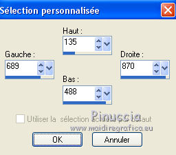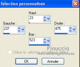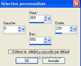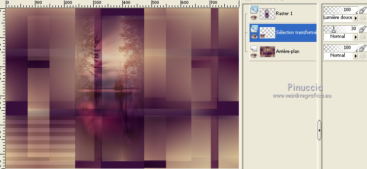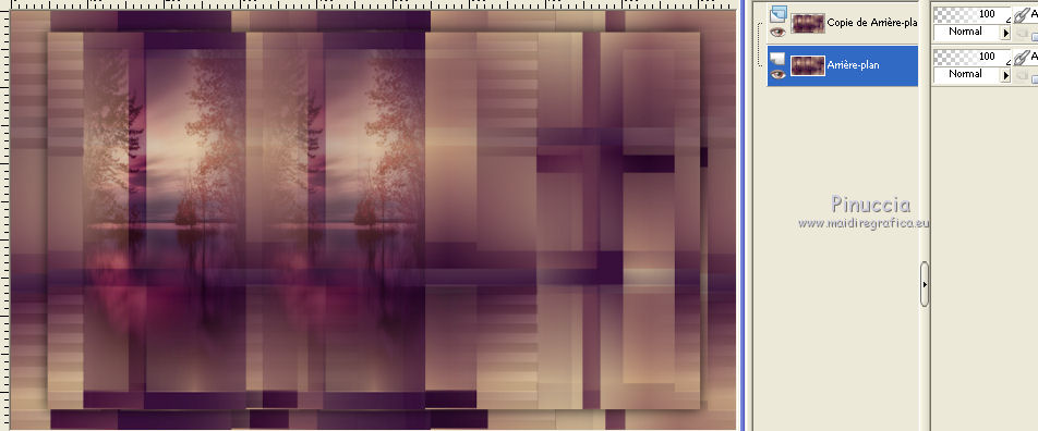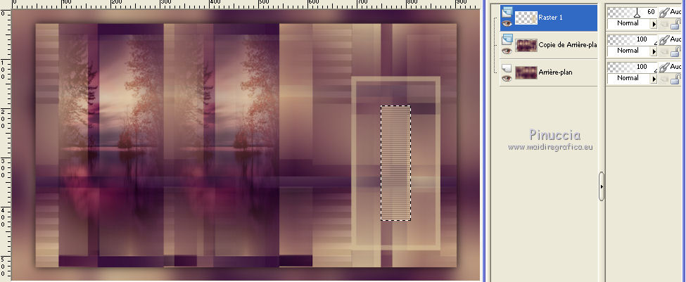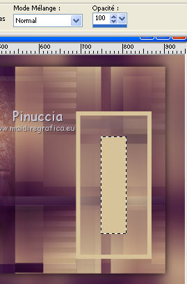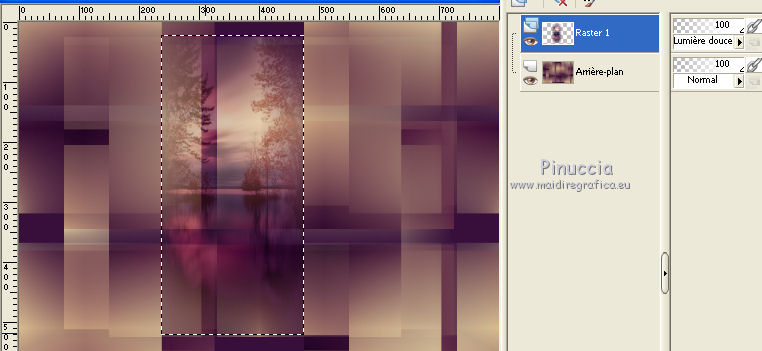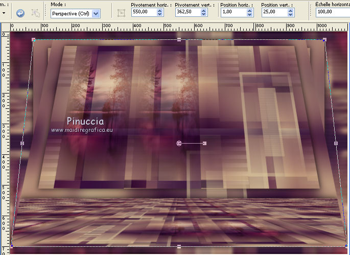Ce tutoriel a été créé avec CorelX6 et traduit avec CorelX12, mais il peut également être exécuté avec les autres versions. Suivant la version utilisée, vous pouvez obtenir des résultats différents. Depuis la version X4, la fonction Image>Miroir a été remplacée par Image>Renverser horizontalement, et Image>Renverser avec Image>Renverser verticalement. Dans les versions X5 et X6, les fonctions ont été améliorées par la mise à disposition du menu Objets. Avec la nouvelle version X7, nous avons encore Image>Miroir et Image>Renverser/Retourner, mais avec nouvelles différences. Voir les détails à ce sujet ici Certaines dénominations ont changées entre les versions de PSP. Les plus frequentes dénominations utilisées: ![]() Traduction en italien ici Vos versions ici Nécessaire pour réaliser ce tutoriel: Matériel ici Merci pour les tubes Gabry Modules Externes: consulter, si nécessaire, ma section des filtres ici Filters Unlimited 2.0 ici VM Extravaganza ici Mura's Meister - Perspective Tiling ici Mura's Meister - Tone ici Filtres VM Extravaganza peuvent être utilisés seuls ou importés dans Filters Unlimited. voir comment le faire ici). Si un filtre est fourni avec cette icône, ![]() en fonction des couleurs utilisées, vous pouvez changer le mode mélange et l'opacité des calques. Dans les plus récentes versions de PSP, vous ne trouvez pas le dégradé d'avant plan/arrière plan ou Corel_06_029. Vous pouvez utiliser le dégradé des versions antérieures. Ici le dossier Dégradés de CorelX. Placer la sélection dans le dossier Sélections. Placer le preset "Preset Pick gabry-cre@nnie" dans le dossier Paramètres par défaut. 1. Ouvrir une nouvelle image transparente 650 x 500 pixels. 2. Placer en avant plan la couleur claire #d7c39a, et en arrière plan la couleur foncée #37113b. ![]() Préparer en avant plan un Dégradé de premier plan/arrière plan, style Linéaire. ![]() 3. Remplir l'image transparente avec la couleur d'arrière plan.4. Calques>Nouveau calque raster. Remplir le calque du dégradé.5. Effets>Modules Externes>VM Extravaganza - Stay in line! ![]() attention: le filtre ne fonctionne pas importé dans Unlimited, et change le résultat en fonction des couleurs utilisées 6. Calques>Dupliquer. Image>Rotation libre - 90 degrés à gauche. ![]() 7. Effets>Effets 3D>Ombre portée, couleur noire. ![]() 8. Édition>Copier. 9. Calques>Fusionner>Calques visibles. 10. Édition>Coller comme nouveau calque. 11. Image>Rotation libre, comme précédemment. ![]() 12. Placer le calque en mode Lumière douce. ![]() 13. Image>Ajouter des bordures, symétrique décoché, couleur d'arrière plan. ![]() 14. Effets>Effets d'image>Mosaïque sans jointures. ![]() 15. Calques>Nouveau calque raster. Activer l'outil Sélection ![]() (peu importe le type de sélection, parce que avec la sélection personnalisée vous obtenez toujours un rectangle), cliquer sur Sélection personnalisée ![]() et setter ces paramètres. ![]() 16. Activer le tube GABRY_PAESAGGIO 112, Édition>Copier. Revenir sur votre travail et Édition>Coller dans la sélection. Placer le calque en mode Lumière douce. ![]() 17. Vous positionner sur le calque du bas de la pile. Sélection personnalisée ![]() ![]() Sélections>Transformer la sélection en calque. 18. Effets>Modules Externes>VM Extravaganza - Transmission. ![]() Sélections>Désélectionner tout. Réduire l'opacité de ce calque à 30%. ![]() 19. Effets>Effets d'image>Mosaïque sans jointures. ![]() 20. Calques>Dupliquer. Image>Renverser. 21. Image>Ajouter des bordures, symétrique décoché, couleur d'arrière plan. ![]() 22. Effets>Effets d'image>Mosaïque sans jointures. ![]() 23. Calques>Dupliquer. Image>Redimensionner, à 90%, redimensionner tous les calques décoché. 24. Effets>Effets 3D>Ombre portée, couleur noire. ![]() 25. Vous positionner sur le calque du bas de la pile. ![]() Réglage>Flou>Flou gaussien - rayon 20. ![]() 26. Image>Miroir. Vous positionner sur le calque du haut de la pile. 27. Calques>Nouveau calque raster. Sélection personnalisée ![]() ![]() 28. Placer en avant plan la Couleur. ![]() Remplir la sélection avec la couleur d'avant plan.Sélections>Modifier>Contracter - 10 pixels. Presser CANC sur le clavier ![]() 29. Réduire l'opacité de l'outil Pot de Peinture à 40. Remplir la sélection avec la couleur d'avant plan.![]() 30. Placer à nouveau l'opacité de l'outil Pot de Peinture à 100. Sélections>Modifier>Contracter - 50 pixels. Remplir la sélection avec la couleur d'avant plan.![]() 31. Effets>Modules Externes>VM Extravaganza - Transmission. ![]() Réduire l'opacité de ce calque à 60%. ![]() Sélections>Désélectionner tout. 32. Effets>Effets d'image>Mosaïque sans jointures. ![]() 33. Calques>Fusionner>Calques visibles. 34. Édition>Copier. 35. Sélections>Sélectionner tout. Image>Ajouter des bordures, symétrique décoché, couleur d'arrière plan. ![]() 36. Sélections>Inverser. Édition>Coller dans la sélection. Image>Miroir. 37. Effets>Modules Externes>Mura's Meister - Perspective Tiling. ![]() 38. Effets>Effets 3D>Ombre portée, comme précédemment. 39. Sélections>Sélectionner tout. Image>Ajouter des bordures, symétrique décoché, couleur d'arrière plan. ![]() 40. Effets>Effets d'image>Mosaïque sans jointures, comme précédemment. Sélections>Inverser. 41. Effets>Modules Externes>VM Extravaganza - Transmission, comme précédemment. ![]() 42. Réglage>Flou>Flou gaussien - rayon 5. ![]() 43. Sélections>Inverser. Effets>Effets 3D>Ombre portée, comme précédemment. Sélections>Transformer la sélection en calque. Sélections>Désélectionner tout. 44. Touche K pour activer l'outil Sélectionner ![]() chercher et sélectionner le preset gabry-cre@nnie. ![]() Résultat: ![]() Touche M pour désélectionner l'outil. 45. Effets>Effets 3D>Ombre portée, comme précédemment. Édition>Répéter Ombre portée. 46. Effets>Effets d'image>Décalage. ![]() 47. Vous positionner sur le calque