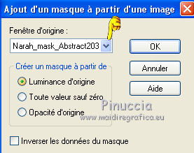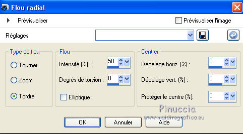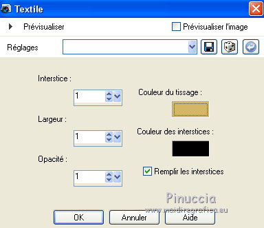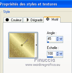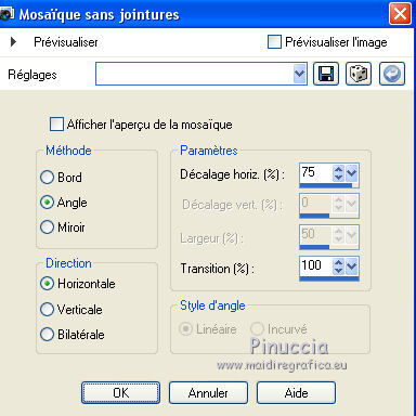 Ce tutoriel a été créé et traduit avec CorelX12, mais peut également être exécuté avec les autres versions. Suivant la version utilisée, vous pouvez obtenir des résultats différents. Depuis la version X4, la fonction Image>Miroir a été remplacée par Image>Renverser horizontalement, et Image>Renverser avec Image>Renverser verticalement. Dans les versions X5 et X6, les fonctions ont été améliorées par la mise à disposition du menu Objets. Avec la nouvelle version X7, nous avons encore Image>Miroir et Image>Renverser/Retourner, mais avec nouvelles différences. Voir les détails à ce sujet ici Certaines dénominations ont changées entre les versions de PSP. Les plus frequentes dénominations utilisées: ![]() Traduction en italien ici Vos versions ici Nécessaire pour réaliser ce tutoriel: Matériel ici Animation Shop ici ![]() en fonction des couleurs utilisées, vous pouvez changer le mode mélange et l'opacité des calques. Ouvrez la police et le minimiser. Vous la trouverez dans la liste des polices disponibles lorsque vous en avez besoin. Avec les nouveaux s.o. ce n'est plus possible. Pour utiliser une police, vous devez le copier dans le dossier Fonts de Windows. Placer la sélection dans le dossier Sélections. Ouvrir le masque dans PSP et le minimiser avec le reste du matériel. 1. Ouvrir une nouvelle image transparente 650 x 500 pixels. 2. Placer en avant plan la couleur claire #d3b764, et en arrière plan la couleur foncée #000000. ![]() 3. Remplir l'image transparente avec la couleur d'arrière plan.4. Calques>Nouveau calque raster. Remplir la sélection avec la couleur d'avant plan.5. Calques>Nouveau calque de masque>A partir d'une image. Ouvrir le menu deroulant sous la fenêtre d'origine et vous verrez la liste des images ouvertes. Sélectionner le masque Narah_mask_Abstract203. ![]() Calques>Fusionner>Fusionner le groupe. Effets>Effets de bords>Accentuer. 6. Calques>Dupliquer. Image>Miroir. Placer le calque en mode Différence. Calques>Fusionner>Fusionner le calque de dessous. 7. Effets>Effets d'image>Mosaïque sans jointures. ![]() 8. Effets>Effets d'image>Décalage. ![]() 9. Calques>Dupliquer. Image>Renverser. Calques>Fusionner>Fusionner le calque de dessous. 10. Effets>Effets d'image>Mosaïque sans jointures, par défaut. ![]() 11. Sélections>Charger/Enregistrer une sélection>Charger à partir du disque. Chercher et charger la sélection hallo2012-cre@nnie. ![]() 12. Sélections>Transformer la sélection en calque. Sélections>Désélectionner tout. 13. Effets>Effets de textures>Textile: couleur du tissage: couleur d'avant plan; couleur des interstices: couleur d'arrière plan. ![]() 14. Effets>Effets de bords>Accentuer. 15. Calques>Dupliquer. Image>Miroir. 16. Activer le tube PatryMists_NewYear01 - Édition>Copier. Revenir sur votre travail et Édition>Coller comme nouveau calque. Réduire l'opacité de ce calque à 40%. 17. Activer le tube AccentStarTrail - Édition>Copier. Revenir sur votre travail et Édition>Coller comme nouveau calque. 18. Image>Rotation libre - 125 degrés à droite. ![]() 19. Effets>Effes d'image>Décalage. ![]() Placer le calque en mode Luminance. Réglage>Netteté>Netteté. 20. Activer le tube PatryMists_NewYear06 - Édition>Copier. Revenir sur votre travail et Édition>Coller comme nouveau calque. Image>Redimensionner, à 90%, redimensionner tous les calques décoché. 21. Déplacer le tube en bas à droite.22. Placer le calque en mode Luminance, et réduire l'opacité à 60%. 23. Signer votre travail sur un nouveau calque. 24. Édition>Copie Spéciale>Copier avec fusion. 25. Image>Ajouter des bordures, 100 pixel, symétrique, couleur d'arrière plan. 26. Activer l'outil Baguette magique ![]() ![]() et cliquer sur le bord pour le sélectionner. 27. Sélection>Modifier>Contracter - 25 pixels. 28. Calques>Nouveau calque raster. Édition>Coller dans la sélection. Sélections>Désélectionner tout. 29. Image>Miroir. Réglage>Flou>Flou radial. ![]() 30. Effets>Effets de bords>Accentuer davantage. 31. Placer en arrière plan Motif, et sélectionner un motif or à choix. ![]() 32. Activer l'outil Texte , font YngreEbStripe.![]() Écrire la première partie du texte: pour moi "Adieu". Calques>Convertir en calque raster. 33. Augmenter la taille du texte à 125 et sélectionner Cursif (I). ![]() Écrire 2015. Calques>Convertir en calque raster. ![]() 34. Édition>Copie Spéciale>Copier avec fusion. Ouvrir Animation Shop et Édition>Coller>Coller comme nouvelle animation. 35. Revenir sur PSP. Écrire en bas à gauche 2016 sur le numéro 2015. 36. Règler à nouveau le texte comme à l'étape 32. ![]() Écrire le mot qui remplacera le premier texte - pour moi "bienvenu". Fermer les calques "adieu" et "2015". ![]() 37. Édition>Copie Spéciale>Copier avec fusion. Revenir sur Animation Shop et Édition>Coller>Coller après l'image active. 38. Édition>Sélectionner tout. Effets>Insérer une transition entre images - Zoom. ![]() 43. Cliquer sur la dernière image pour la sélectionner. Animation>Propriété de l'image et règler la durée à 250. Cliquer sur la première image pour la sélectionner. Animation>Propriété de l'image, et règler la durée à 100. Animation>Redimensionner l'animation - à 650 pixels de largeur. Contrôler le résultat en cliquant sur Visualiser l'animation ![]() et sauvegarder au format gif. L'ancienne version du tutoriel Hallo 2012. ![]() ![]() Si vous avez des problèmes, ou des doutes, ou vous trouvez un link modifié, ou seulement pour me dire que ce tutoriel vous a plu, vous pouvez m'écrire. 11 Décember 2015 |