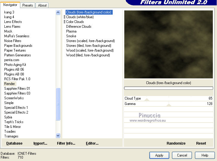 3. Effetti>Plugins>Filters Unlimited 2.0 - Render - Clouds(fore-/background color).