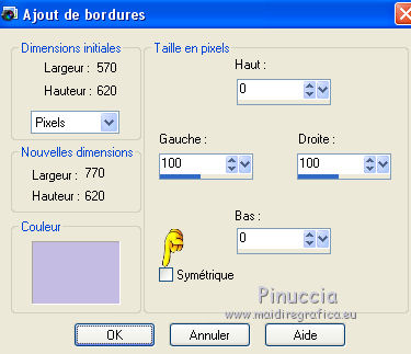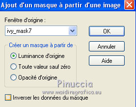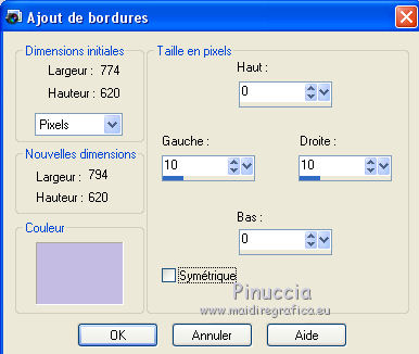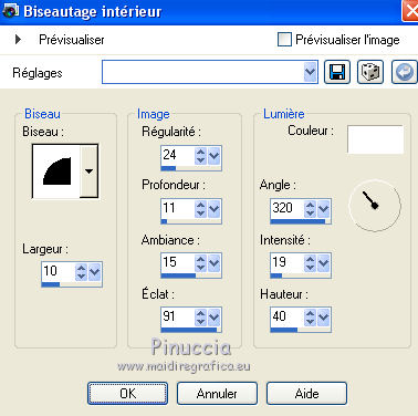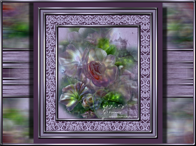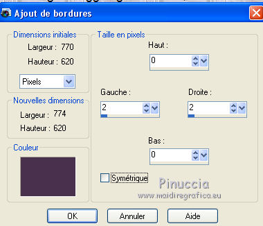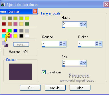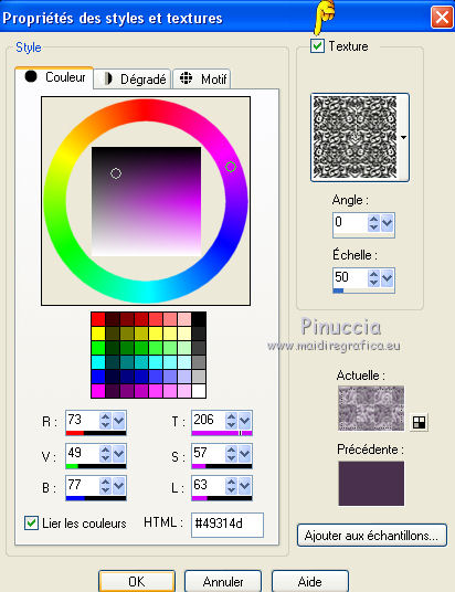 Ce tutoriel a été créé et traduit avec CorelX12, mais peut également être exécuté avec les autres versions. Suivant la version utilisée, vous pouves obtenir des résultats différents. Depuis la version X4, la fonction Image>Miroir a été remplacée par Image>Renverser horizontalement, et Image>Renverser avec Image>Renverser verticalement . Dans les versions X5 et X6, les fonctions ont été améliorées par la mise à disposition du menu Objets. Avec la nouvelle version X7, nous avons encore Image>Miroir et Image>Renverser/Retourner, mais avec nouvelles différences. Voir les détails à ce sujet ici Certaines dénominations ont changées entre les versions de PSP. Les plus frequentes dénominations utilisées: ![]() Traduction en italien ici Nécessaire pour réaliser ce tutoriel: Matériel ici Pour le tube merci Sharlimar Modules Externes: consulter, si nécessaire, ma section des filtres ici Filters Unlimited 2.0 ici Graphics Plus - Cross Shadow ici Cybia - Screenworks ici Filtres Graphics Plus et Cybia peuvent être utilisés seuls ou importés dans Filters Unlimited. voir comment le faire ici). Si un filtre est fourni avec cette icône, ![]() Placer la texture dans le dossier Textures. Ouvrir le masque dans PSP et le minimiser avec le reste du matériel. 1. Ouvrir une nouvelle image transparente 350 x 400 pixels. 2. Placer en avant plan la couleur claire #c4bce3, et en arrière plan la couleur foncée #49314d. ![]() Remplir l'image transparente avec la couleur d'arrière plan.3. Calques>Nouveau calque raster. Remplir avec la couleur d'avant plan.4. Calques>Nouveau calque de masque>A partir d'une image. Ouvrir le menu deroulant sous la fenêtre d'origine et vous verrez la liste des images ouvertes. Sélectionner le masque ivy_mask7,.jpg. ![]() Calques>Fusionner>Tous. 5. Ouvrir le tube de la fleur tube3303_flower_09_10_09_sdt - Édition>Copier. Revenir sur votre travail ete Édition>Coller comme nouveau calque. Réduire l'opacité de ce calque à 55%. 6. Calques>Dupliquer. Image>Miroir. Image>Renverser. 7. Édition>Coller comme nouveau calque (le tube est toujours en mémoire). Image>Redimensionner, à 80%, redimensionner tous les calques décoché. Image>Miroir. Déplacer le tube en bas à gauche.![]() 8. Image>Ajouter des bordures, 2 pixels, symétrique, couleur d'arrière plan. Cliquer avec la touche droite de la souris sur la palette de la couleur, et vous aurez la table des couleurs récentes: en bas à gauche, les petites palettes de vos couleurs d'avant plan et arrière plan; pour placer la couleur du bord, cliquer sur sa petite palette ![]() 9. Image>Ajouter des bordures, 10 pixels, symétrique, couleur d'avant plan. Activer l'outil Baguette magique ![]() ![]() et cliquer sur le bord de 10 pixels pour le sélectionner. 10. Effets>Modules Externes>Graphics Plus - Cross Shadow, par défaut. ![]() 11. Effets>Effets 3D>Bisautage intérieur. ![]() Sélections>Désélectionner tout. 12. Image>Ajouter des bordures, 2 pixels, symétrique, couleur d'arrière plan. Image>Ajouter des bordures, 40 pixels, symétrique, couleur d'avant plan. Sélectionner ce bord avec la baguette magique ![]() 13. Ouvrir la palette de votre couleur d'arrière plan et sélectionner Texture. Chercher et sélectionner la texture 14cre@nnie avec ces réglages. ![]() Remplir la sélection avec cette couleur texturée.Sélections>Désélectionner tout. 14. Image>Ajouter des bordures, 2 pixels, symétrique, couleur d'arrière plan. Image>Ajouter des bordures, 10 pixels, symétrique, couleur d'avant plan. Sélectionner ce bord avec la baguette magique ![]() Effets>Modules Externes>Graphics Plus - Cross Shadow, par défaut. ![]() Effets>Effets 3D>Bisautage intérieur, comme précédemment. Sélections>Désélectionner tout. 15. Image>Ajouter des bordures, 2 pixels, symétrique, couleur d'arrière plan. Image>Ajouter des bordures, 10 pixels, symétrique, couleur d'avant plan. Sélectionner ce bord avec la baguette magique ![]() Effets>Modules Externes>Cybia - Screenworks - Hollow dot. ![]() Sélections>Désélectionner tout. 16. Image>Ajouter des bordures, 2 pixels, symétrique, couleur d'arrière plan. Image>Ajouter des bordures, 10 pixels, symétrique, couleur d'avant plan. Sélectionner ce bord avec la baguette magique ![]() Effets>Modules Externes>Graphics Plus - Cross Shadow, comme précédemment. Effets>Effets 3D>Bisautage intérieur, comme précédemment. Image>Ajouter des bordures, 20 pixels, symétrique, couleur d'arrière plan. Sélections>Désélectionner tout. 17. Édition>Copier. (l'image doit rester en mémoire jusqu'à l'étape 25. Pour précaution, Édition>Coller comme nouvelle image et minimiser cette image). 18. Revenir sur votre travail. Image>Ajouter des bordures, symétrique décoché, couleur d'avant plan. ![]() Sélectionner ces bords avec la baguette magique ![]() ![]() Remplir la sélection avec la couleur d'arrière plan texturée.Sélections>Désélectionner tout. 19. Image>Ajouter des bordures, symétrique décoché, couleur d'arrière plan - 2 pixels à droite et à gauche. ![]() 20. Image>Ajouter des bordures, symétrique décoché, couleur d'avant plan - 10 pixels à droite et à gauche. ![]() Sélectionner les deux bords de 10 pixels avec la baguette magique ![]() Effets>Modules Externes>Graphics Plus - Cross Shadow, par défaut. Effets>Effets 3D>Bisautage intérieur, comme précédemment. Sélections>Désélectionner tout. 21. Image>Ajouter des bordures, symétrique décoché, 2 pixels à droite et à gauche, couleur d'arrière plan. Image>Ajouter des bordures, symétrique décoché, 10 pixels à droite et à gauche, couleur d'avant plan. Sélectionner les bords de 10 pixels avec la baguette magique ![]() Effets>Modules Externes>Cybia - Screenworks - Hollow dot. Sélections>Désélectionner tout. 22. Image>Ajouter des bordures, symétrique décoché, 2 pixels à droite et à gauche, couleur d'arrière plan. Image>Ajouter des bordures, symétrique décoché, 10 pixels à dr