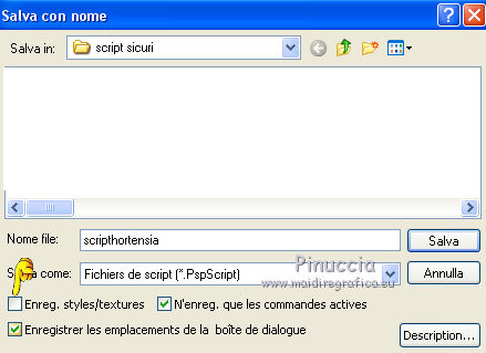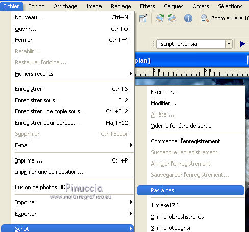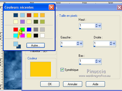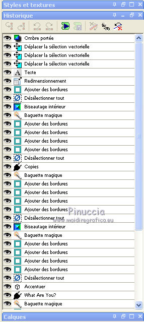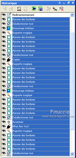 Ce tutoriel a été créé avec CorelX6 et traduit avec CorelX12, mais il peut également être exécuté avec les autres versions. Suivant la version utilisée, vous pouvez obtenir des résultats différents. Depuis la version X4, la fonction Image>Miroir a été remplacée par Image>Renverser horizontalement, et Image>Renverser avec Image>Renverser verticalement . Dans les versions X5 et X6, les fonctions ont été améliorées par la mise à disposition du menu Objets. Avec la nouvelle version X7, nous avons encore Image>Miroir et Image>Renverser/Retourner, mais avec nouvelles différences. Voir les détails à ce sujet ici Certaines dénominations ont changées entre les versions de PSP. Les plus frequentes dénominations utilisées: ![]() Traduction en italien ici Nécessaire pour réaliser ce tutoriel: Matériel ici Modules Externes: consulter, si nécessaire, ma section des filtres ici Filters Unlimited 2.0 ici Toadies ici Mura's Meister - Copies ici Filtres Toadies peuvent être utilisés seuls ou importés dans Filters Unlimited. voir comment le faire ici). Si un filtre est fourni avec cette icône, ![]() 1. Ouvrir votre image dans PSP. Image>Redimensionner, à 450 pixels de largeur, redimensionner tous les calques coché. Activer l'outil Pipette pour choisir deux couleurs de l'image.Cliquer sur la couleur choisie, avec la touche gauche de la souris pour placer en avant plan la couleur claire et avec la touche droite pour placer en arrière plan la couleur foncée. 2. Image>Ajouter des bordures, 2 pixels, symétrique, couleur foncée. cliquer avec la touche droite de la souris sur la palette de la couleur, pour avoir la table des couleurs récentes, en bas à gauche, les petites palettes des vos couleurs d'avant plan et arrière plan; pour placer la couleur du bord, cliquer sur la petite palette correspondante. ![]() Image>Ajouter des bordures, 1 pixel, symétrique, couleur claire. Image>Ajouter des bordures, 2 pixels, symétrique, couleur foncée. 3. Image>Ajouter des bordures, 20 pixels, symétrique, couleur claire. Sélectionner ce bord avec la baguette magique ![]() 4. Effets>Effets 3D>Biseautage intérieur. ![]() Sélections>Désélectionner tout. 5. Image>Ajouter des bordures, 2 pixels, symétrique, couleur foncée. Image>Ajouter des bordures, 1 pixel, symétrique, couleur claire. Image>Ajouter des bordures, 2 pixels, symétrique, couleur foncée. 6. Image>Ajouter des bordures, 35 pixels, symétrique, couleur claire. Sélectionner ce bord avec la baguette magique ![]() 7. Effets>Modules Externes>Toadies - What are you. ![]() 8. Effets>Effets de bords>Accentuer. 9. Image>Ajouter des bordures, 2 pixels, symétrique, couleur foncée. Image>Ajouter des bordures, 1 pixel, symétrique, couleur claire. Image>Ajouter des bordures, 2 pixels, symétrique, couleur foncée. 10. Image>Ajouter des bordures, 20 pixels, symétrique, couleur claire. Sélectionner ce bord avec la baguette magique ![]() 11. Effets>Effets 3D>Biseautage intérieur, comme précédemment. Sélections>Désélectionner tout. 12. Image>Ajouter des bordures, 2 pixels, symétrique, couleur foncée. Image>Ajouter des bordures, 1 pixel, symétrique, couleur claire. Image>Ajouter des bordures, 2 pixels, symétrique, couleur foncée. 13. Image>Ajouter des bordures, 45 pixels, symétrique, couleur claire. Sélectionner ce bord avec la baguette magique ![]() 14. Effets>Modules Externes>Mura's Meister - Copies. ![]() Sélections>Désélectionner tout. 15. Image>Ajouter des bordures, 2 pixels, symétrique, couleur foncée. Image>Ajouter des bordures, 1 pixel, symétrique, couleur claire. Image>Ajouter des bordures, 2 pixels, symétrique, couleur foncée. 16. Image>Ajouter des bordures, 20 pixels, symétrique, couleur claire. Sélectionner ce bord avec la baguette magique ![]() 17. Effets>Effets 3D>Biseautage intérieur, comme précédemment. Sélections>Désélectionner tout. 18. Image>Ajouter des bordures, 2 pixels, symétrique, couleur foncée. 19. Image>Redimensionner, à 500/600 pixels de largeur, à vostre convenance, redimensionner tous les calques coché. 20. Signer votre travail sur un nouveau calque. 21. Calques>Fusionner>Tous et enregistrer en jpg. Script Voulez-vous répéter le tutoriel avec une autre image? Vous pouvez enregistrer le script de toutes les étapes: Préparation: Affichage>Palettes>Historique, pour visualiser la palette des étapes. ![]() Si vous avez annuler des commandes, (vous pouvez voir ces commandes avec la croix rouge): ![]() cliquer sur l'icône ci-dessous pour les remouver. ![]() Répondre oui. ![]() Maintenant, nous pouvons enregistrer le script: sélectionner les commandes relatives aux bords: ![]() Clic droit sur les commandes sélectionées et cliquer sur "Enregistrer dans un script". ![]() Donner un nom au script et décocher "Enreg.styles/textures" (pour pouvoir changer les couleurs) ![]() Exécution Ouvrir votre image. Image>Redimensionner, à 450 pixels de largeur, redimensionner tous les calques coché. Choisir deux couleurs et placer en avant plan la couleur claire, et en arrière plan la couleur foncée. Activer la barre du script; s'elle n'est pas visible: Affichage>Barres d'outils>Script. Ouvrir le menu; chercher et sélectionner votre script ![]() Activer le mode d'exécution, pour contrôler toutes le fenêtres des commandes. ![]() Fichier>Script>Pas à pas et cliquer sur Pas à pas ![]() ![]() Cette option ne serait pas nécessaire pour les commandes de ce script, mais avec ce choix, vous pouvez contrôler toutes les commandes du script. Nous pouvons commencer: Cliquer sur la flèche noire (dans les nouvelles versions de PSP elle est blue) pour exécuter le script. ![]() Répondre "continuer" à la première fenêtre: ![]() Deuxième fenêtre: clic droite sur la palette de la couleur et changer la couleur avec la nouvelle couleur foncée. ![]() troisième fenêtre: clic droite sur la palette et changer la couleur avec la nouvelle couleur claire. ![]() et ainsi de suite jusq