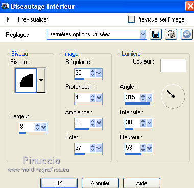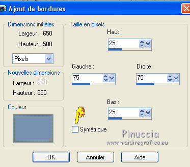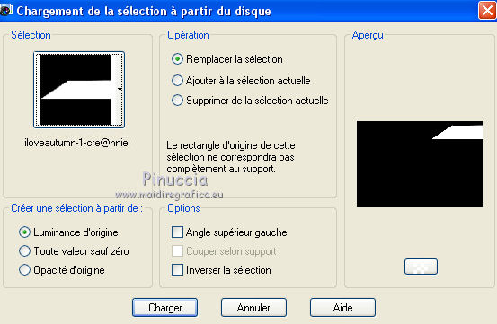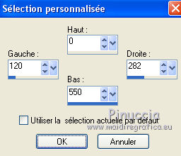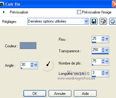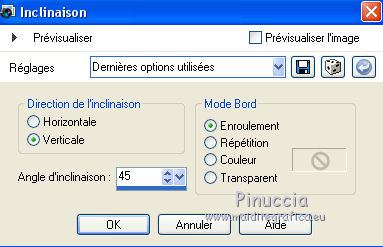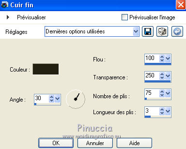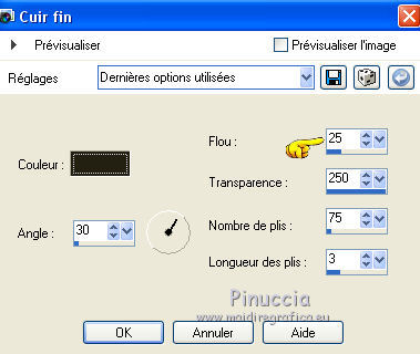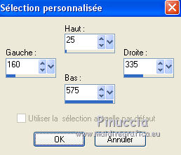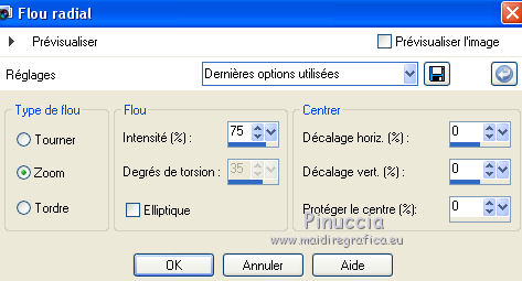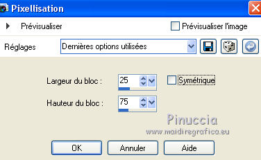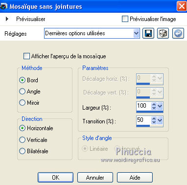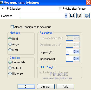 Ce tutoriel a été créé avec CorelX6 et traduit avec CorelX12, mais il peut également être exécuté avec les autres versions. Suivant la version utilisée, vous pouvez obtenir des résultats différents. Depuis la version X4, la fonction Image>Miroir a été remplacée par Image>Renverser horizontalement, et Image>Renverser avec Image>Renverser verticalement. Dans les versions X5 et X6, les fonctions ont été améliorées par la mise à disposition du menu Objets. Avec la nouvelle version X7, nous avons encore Image>Miroir et Image>Renverser/Retourner, mais avec nouvelles différences. Voir les détails à ce sujet ici Certaines dénominations ont changées entre les versions de PSP. Les plus frequentes dénominations utilisées: ![]() Traduction en italien ici Vos versions ici Nécessaire pour réaliser ce tutoriel: Matériel ici Modules Externes: consulter, si nécessaire, ma section des filtres ici Alien Skin Eye Candy 5 Impact ici Mura's Meister - Perspective Tiling ici ![]() en fonction des couleurs utilisées, vous pouvez changer le mode mélange et l'opacité des calques. Placer les presets En cliquant sur le preset une ou deux fois (selon vos réglages) automatiquement il se placera directement dans le dossier Settings de Alien Skin Eye Candy. pourquoi un ou deux clic voir ici Placer les sélections dans le dossier Sélections. 1. Ouvrir une nouvelle image transparente 650 x 500 pixels. 2. Placer en avant plan la couleur claire #7893b1, et en arrière plan la couleur foncée #242112. ![]() 3. Remplir l'image transparente avec la couleur d'arrière plan.4. Sélections>Sélectionner tout. Ouvrir le tube lady14 Édition>Copier. ne pas fermer le tube; on va s'en servir plus tard Revenir sur votre travail et Édition>Coller dans la sélection. Sélections>Désélectionner tout. 5. Effets>Effets d'image>Mosaïque sans jointures, par défaut. ![]() 6. Réglage>Flou>Flou radial. ![]() 7. Effets>Effets de distorsion>Coordonnées polaires. ![]() 8. Effets>Effets de bords>Accentuer davantage. 9. Effets>Effets géométriques>Inclinaison. ![]() 10. Calques>Dupliquer. Image>Miroir. Image>Renverser. 11. Image>Redimensionner, à 65%, redimensionner tous les calques décoché. Effets>Effets 3D>Ombre portée, couleur noire. ![]() 12. Image>Ajouter des bordures, symétrique décoché, couleur d'avant plan. ![]() 13. Effets>Effets d'image>Mosaïque sans jointures. ![]() 14. Activer l'outil Sélection ![]() (peu importe le type de sélection, parce que avec la sélection personnalisée vous obtenez toujours un rectangle), cliquer sur Sélection personnalisée ![]() et setter ces paramètres. ![]() 15. Effets>Effets d'image>Mosaïque sans jointures. ![]() 16. Effets>Effets 3D>Ombre portée, comme précédemment. 17. Sélection personnalisée ![]() la nouvelle sélection remplacera la précédente ![]() 18. Effets>Effets de distorsion>Pixellisation. ![]() 19. Effets>Effets de bords>Accentuer davantage. Effets>Effets 3D>Ombre portée, comme précédemment. 20. Sélections>Transformer la sélection en calque. 21. Vous positionner sur le calque du bas de la pile. 22. Sélections>Charger/Enregistrer une sélection>Charger à partir du disque. Chercher et charger la sélection iloveautumn-1-cre@nnie. ![]() 23. Sélections>Transformer la sélection en calque. Effets>Effets de bords>Accentuer davantage. Sélections>Désélectionner tout. 24. Effets>Effets de distorsion>Torsion - degrés 720. ![]() 25. Effets>Effets 3D>Ombre portée, couleur noire. ![]() 26. Calques>Dupliquer. Image>Miroir. 27. Effets>Effets d'image>Décalage. ![]() 28. Calques>Fusionner>Fusionner le calque de dessous. 29. Calques>Nouveau calque raster. Calques>Agencer>Déplacer vers le bas. 30. Sélections>Charger/Enregistrer une sélection>Charger à partir du disque. Chercher et charger la sélection iloveautumn-2-cre@nnie. ![]() 31. Ouvrir le tube herfst, Édition>Copier. ne pas fermer le tube; on va s'en servir plus tard Revenir sur votre travail et Édition>Coller dans la sélection. Placer le calque en mode Lumière dure. 32. Effets>Modules Externes>Alien Skin Eye Candy 5 Impact - Glass. Sélectionner le preset iloveautumn-cre@nnie et ok. ![]() Ci-dessous les règlages en cas de problèmes avec le preset. ![]() 33. Sélections>Désélectionner tout. 34. Image>Ajouter des bordures, 25 pixels, symétrique, couleur d'avant plan. 35. Effets>Effets d'image>Mosaïque sans jointures. ![]() 36. Sélection personnalisée ![]() la nouvelle sélection remplacera la précédente ![]() Sélections>Transformer la sélection en calque. Sélections>Désélectionner tout. 37. Image>Rotation libre - 90 degrés à gauche. ![]() 38. Image>Redimensionner, à 65%, redimensionner tous les calques décoché. 39. Effets>Effets d'image>Décalage. ![]() 40. Effets>Modules Externes>Alien Skin Eye Candy 5 Impact - Extrude. Sélectionner le preset iloveautumn-extrude-cre@nnie et ok. ![]() 41. Effets>Effets 3D>Ombre portée, couleur noire. ![]() 42. Sélections>Charger/Enregistrer une sélection>Charger à partir du disque. Chercher et charger la sélection iloveautumn-3-cre@nnie. ![]() 43. Effets>Effets de textures>Cuir fin, couleur d'arrière plan. ![]() Sélections>Désélectionner tout. 44. Vous positionner sur le calque du bas de la pile. 45. Activer l'outil Baguette magique ![]() ![]() cliquer sur les bords en haut et en bas pour les sélectionner. ![]() 46. Effets>Effets de textures>Cuir fin, couleur d'arrière plan. ![]() 47. Sélections>Sélectionner tout. Image>Ajouter des bordures, 75 pixels, symétrique, couleur d'avant plan. 48. Effets>Effets d'image>Mosaïque sans jointures, par défaut. ![]() 49. Sélection>Inverser. Réglage>Flou>Flou gaussien - rayon 50. ![]() 50. Effets>Effets de textures>Cuir fin, comme précédemment. 51. Sélections>Inverser. 52. Effets>Effets 3D>Ombre portée, couleur noire. ![]() Sélections>Désélectionner tout. 53. Calques>Dupliquer. Effets>Modules Externes>Mura's Meister - Perspective Tiling. ![]() 54. Effets>Effets 