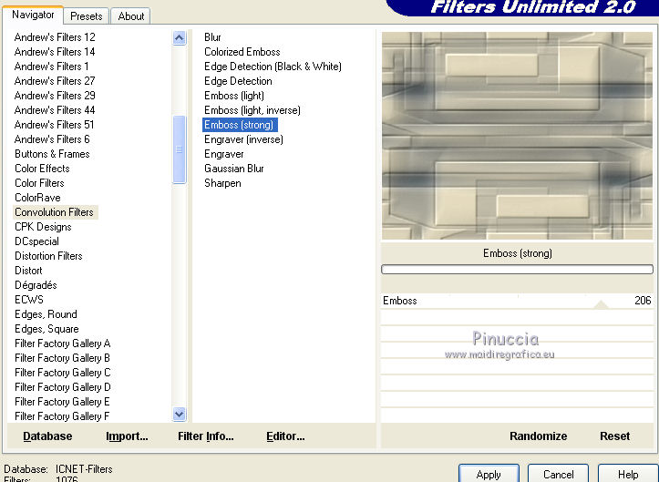 Effetti>Plugins>Filters Unlimited 2.0 - Convolution filters - Emboss(strong), con i settaggi standard.