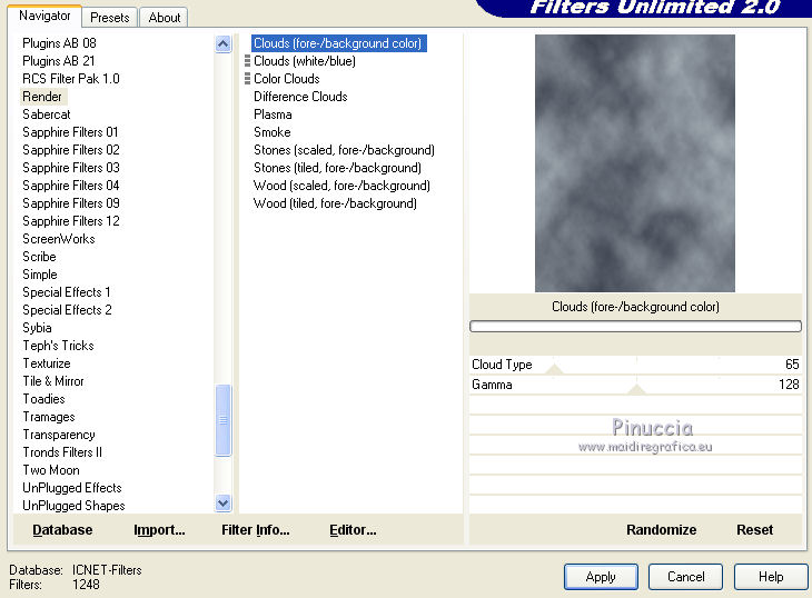 3. Effetti>Plugins>Filters Unlimited 2.0 - Render - Clouds (fore-/background color).