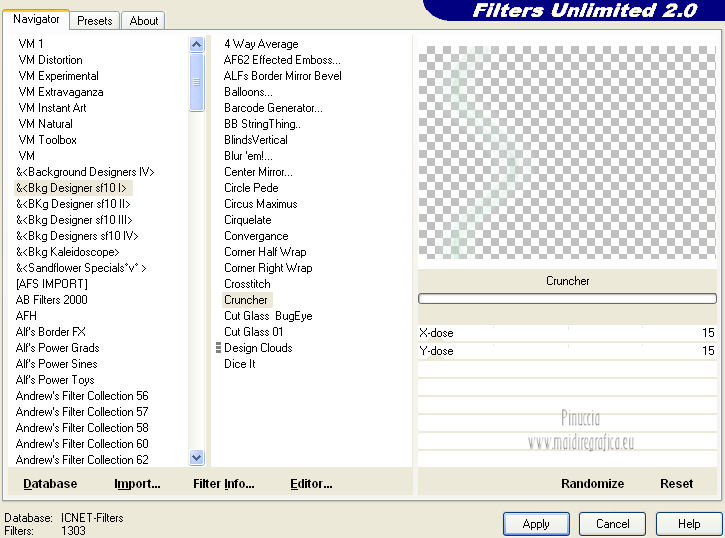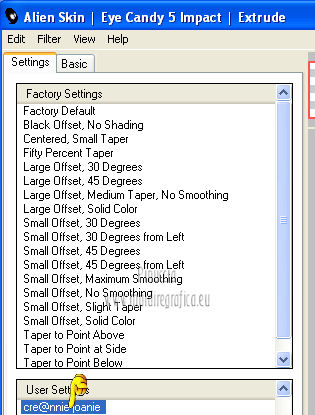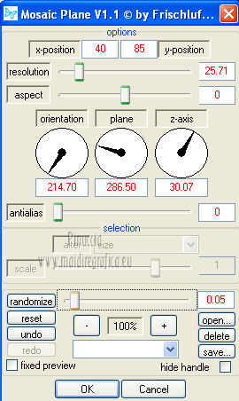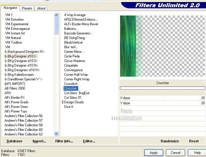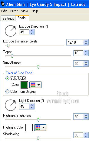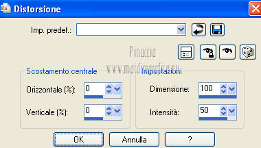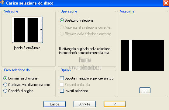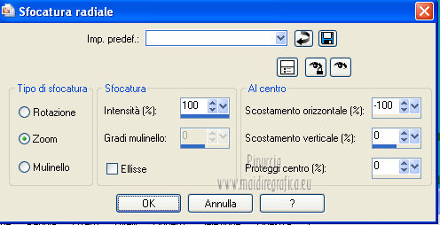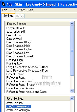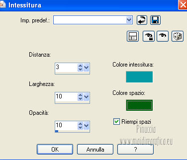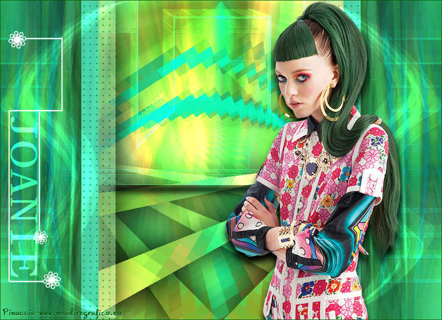 Le vostre versioni qui Occorrente: Materiale qui Per il tube della donna grazie Joanie. Filtri: vedi la mia sezione filtri qui Filters Unlimited qui &<Bkg Designer sf10I> (da importare in Unlimited) qui Alien Skin Eye Candy 5 Impact qui Frischluft - Mosaic Plan qui ![]() non esitare a cambiare modalità di miscelatura e opacità secondo i colori utilizzati. Metti i preset Cliccando sul file una o due volte (a seconda delle tue impostazioni), automaticamente il preset si installerà nella cartella corretta. perchè uno o due clic vedi qui Metti le selezioni nella cartella Selezioni. Apri la maschera in PSP e minimizzala con il resto del materiale. 1. Imposta il colore di primo piano con il colore chiaro #059aa5, e il colore di sfondo con il colore scuro #00600d. ![]() 2. Apri una nuova immagine trasparente 650 x 500 pixels, e riempila con il colore di primo piano.3. Livelli>Nuovo livello raster. Selezione>Seleziona tutto. Apri il tube "Joanie_woman_11_03_2012" e vai a Modifica>Copia. non chiuderlo perchè ti servirà ancora Torna al tuo lavoro e vai a Modifica>Incolla nella selezione. Selezione>Deseleziona. 4. Effetti>Effetti di immagine>Motivo unico, con i settaggi standard. ![]() 5. Regola>Sfocatura>Sfocatura radiale. ![]() 6. Livelli>Duplica. Immagine>Rifletti. Abbassa l'opacità di questo livello al 50%. Livelli>Unisci>Unisci visibile. 7. Effetti>Plugins>Frischluft - Mosaic plane . ![]() 8. Livelli>Duplica. Cambia la modalità di miscelatura di questo livello in Sovrapponi, e abbassa l'opacità al 50%. Livelli>Unisci>Unisci giù. 9. Selezione>Carica/Salva selezione>Carica selezione da disco. Cerca e carica la selezione joanie-1-cre@nnie. ![]() Selezione>Innalza selezione a livello. Selezione>Deseleziona. 10. Effetti>Effetti 3D>Sfalsa ombra, con il colore nero. ![]() 11. Livelli>Duplica. Immagine>Capovolgi. Livelli>Unisci>Unisci giù. 12. Selezione>Carica/Salva selezione>Carica selezione da disco. Carica nuovamente la selezione joanie-1-cre@nnie. ![]() 13. Livelli>Nuovo livello raster. Riempi con il colore di primo piano.Selezione>Deseleziona. 14. Effetti>Effetti di distorsione>Distorsione. ![]() 15. Effetti>Effetti geometrici>Cerchio. ![]() 16. Effetti>Plugins>Frischluft - Mosaic plane, con i settaggi precedenti. 17. Immagine>Rifletti. Immagine>Capovolgi. Livelli>Unisci>Unisci visibile. 18. Livelli>Nuovo livello raster. Riempi con il colore di primo piano.19. Livelli>Nuovo livello maschera>Da immagine. Apri il menu sotto la finestra di origine e vedrai la lista dei files aperti. Seleziona la maschera cre@nnie-39, con i seguenti settaggi: ![]() Livelli>Unisci>Unisci gruppo. 20. Immagine>Rifletti. Effetti>Effetti di immagine>Scostamento. ![]() 21. Selezione>Carica/Salva selezione>Carica selezione da disco. Cerca e carica la selezione joanie-2-cre@nnie. ![]() Premi sulla tastiera il tasto CANC ![]() Selezione>Deseleziona. Effetti>Effetti di bordo>Aumenta di più. 22. Attiva lo strumento Bacchetta magica ![]() e clicca nello spazio verde per selezionarlo. ![]() Premi sulla tastiera il tasto CANC. Selezione>Deseleziona. 23. Effetti>Plugins>Alien Skin Eye Candy 5 Impact - Extrude. Seleziona il preset cre@nnie-joanie e ok. ![]() Questi i settaggi che, in caso di problemi con il preset, puoi impostare manualmente. ![]() Cambia la modalità di miscelatura di questo livello in Indebolisci, e abbassa l'opacità al 60%. ![]() 24. Livelli>Unisci>Unisci visibile. 25. Modifica>Copia. 26. Immagine>Ruota a sinistra se stai usando PSP 9: Immagine>Ruota>90 gradi in senso antiorario 27. Immagine>Aggiungi bordatura, simmetriche non selezionato, con il colore di primo piano. ![]() Seleziona il bordo a sinistra con la bacchetta magica ![]() ![]() 28. Livelli>Nuovo livello raster. Modifica>Incolla nella selezione. 29. Immagine>Rifletti. Selezione>Deseleziona. 30. Effetti>Plugins>Filters Unlimited 2.0 - &<Bkg Designer sf10I> - Cruncher. ![]() 31. Selezione>Carica/Salva selezione>Carica selezione da disco. Cerca e carica la selezione joanie-3-cre@nnie. ![]() 32. Effetti>Effetti di trama>Intessitura colore intessitura: primo piano - colore spazio: colore di sfondo. ![]() Selezione>Deseleziona. 33. Livelli>Duplica. Immagine>Rifletti. Livelli>Unisci>Unisci giù. 34. Seleziona la parte centrale con la bacchetta magica ![]() ![]() Selezione>Inverti. 35. Effetti>Plugins>Alien Skin Eye Candy 5 Impact - Perspective Shadow. Seleziona il preset cre@nnie-joanie-ps e ok. ![]() Questi i settaggi che, in caso di problemi, puoi impostare manualmente ![]() 36. Selezione>Carica/Salva selezione>Carica selezione da disco. Carica nuovamente la selezione joanie-3-cre@nnie. ![]() Selezione>Innalza selezione a livello. Selezione>Deseleziona. 37. Effetti>Effetti di distorsione>Onda. ![]() 38. Effetti>Plugins>Filters Unlimited 2.0 - &<Bkg Designer sf10I> - Cruncher. ![]() 39. Effetti>Effetti geometrici>Cerchio, con i settaggi precedenti. ![]() 40. Effetti>Effetti di immagine>Scostamento. ![]() Cambia la modalità di miscelatura di questo livello in Indebolisci. 41. Livelli>Duplica. Immagine>Rifletti. 42. Livelli>Nuovo livello raster. Selezione>Carica/Salva selezione>Carica selezione da disco. Cerca e carica la selezione joanie-4-cre@nnie. ![]() 43. Effetti>Effetti 3D>Sfalsa ombra, con il colore nero. ![]() Selezione>Deseleziona. 44. Apri deco-cre@nnie e vai a Modifica>Copia. Torna al tuo lavoro e vai a Modifica>Incolla come nuovo livello. Spostalo a sinistra (vedi il mio esempio).45. Apri tekst-cre@nnie e vai a Modifica>Copia. Torna al tuo lavoro e vai a Modifica>Incolla come nuovo livello. Spostalo a sinistra tra le linee.![]() Cambia la modalità di miscelatura di questo livello in Sovrapponi. 46. Attiva nuovamente il tube "Joanie_woman_11_03_2012" e vai a Modifica>Copia. Torna al tuo lavoro e vai a Modifica>Incolla come nuovo livello. Immagine>Ridimensiona, al 71%, tutti i livelli non selezionato. Spostalo a destra (vedi il mio esempio).47. Effetti>Effetti 3D>Sfalsa ombra, con i settaggi precedenti. 48. Livelli>Nuovo livello raster