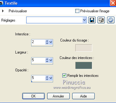Ce tutoriel a été créé avec CorelX6 et traduit avec CorelX12, mais il peut également être exécuté avec les autres versions. Suivant la version utilisée, vous pouvez obtenir des résultats différents. Depuis la version X4, la fonction Image>Miroir a été remplacée par Image>Renverser horizontalement, et Image>Renverser avec Image>Renverser verticalement. Dans les versions X5 et X6, les fonctions ont été améliorées par la mise à disposition du menu Objets. Avec la nouvelle version X7, nous avons encore Image>Miroir et Image>Renverser/Retourner, mais avec nouvelles différences. Voir les détails à ce sujet ici Certaines dénominations ont changées entre les versions de PSP. Les plus frequentes dénominations utilisées: ![]() Traduction en italien ici Vos versions ici Nécessaire pour réaliser ce tutoriel: Matériel ici Pour le tube merci Jeanne Modules Externes: consulter, si nécessaire, ma section des filtres ici Filters Unlimited 2.0 ici Toadies - What are you ici DSB Flux ici Simple ici AAA Frames - Foto Frame ici Alien Skin Eye Candy 5 Impact - Glass, Perspective Shadow ici Filtres Toadies et Simple peuvent être utilisés seuls ou importés dans Filters Unlimited. voir comment le faire ici). Si un filtre est fourni avec cette icône, ![]() en fonction des couleurs utilisées, vous pouvez changer le mode mélange et l'opacité des calques. Dans les plus récentes versions de PSP, vous ne trouvez pas le dégradé d'avant plan/arrière plan ou Corel_06_029. Vous pouvez utiliser le dégradé des versions antérieures. Ici le dossier Dégradés de CorelX. Placer le preset En cliquant sur le preset une ou deux fois (selon vos réglages) automatiquement il se placera directement dans le dossier Settings de Alien Skin Eye Candy. pourquoi un ou deux clic voir ici Placer les sélections dans le dossier Sélections. 1. Ouvrir une nouvelle image transparente 650 x 500 pixels. 2. Placer en avant plan la couleur claire #e6e1d4, et en arrière plan la couleur foncée #566d6b. ![]() 3. Remplir l'image transparente avec la couleur d'arrière plan.4. Sélections>Sélectionner tout. Ouvrir le tube Jeanne_Woman_Lady_05-03-2016 - effacer le watermark - Édition>Copier. Revenir sur votre travail et Édition>Coller dans la sélection. Sélections>Désélectionner tout. 5. Effets>Effets d'image>Mosaïque sans jointures, par défaut. ![]() 6. Réglage>Flou>Flou gaussien - rayon 20. ![]() 7. Effets>Modules Externes>DSB Flux - Linear Transmission. ![]() 8. Effets>Effets géométriques>Perspective verticale. ![]() Effets>Effets de bords>Accentuer davantage. Effets>Effets de bords>Éroder. 9. Image>Ajouter des bordures, symétrique décoché, couleur d'arrière plan. ![]() 10. Effets>Effets d'image>Mosaïque sans jointures ![]() 11. Sélections>Charger/Enregistrer une sélection>Charger à partir du disque. Chercher et charger la sélection kaitlin-1-cre@nnie. ![]() Sélections>Transformer la sélection en calque. 12. Effets>Effets de textures>Stores, couleur noire. ![]() Sélections>Désélectionner tout. 13. Effets>Effets 3D>Ombre portée, couleur noire. ![]() 14. Image>Renverser. Calques>Dupliquer. Image>Miroir. Calques>Fusionner>Fusionner le calque de dessous. 15. Calques>Dupliquer. Effets>Modules Externes>DSB Flux - Blast. ![]() 16. Calques>Agencer>Déplacer vers le bas. 17. Image>Ajouter des bordures, symétrique décoché, couleur d'avant plan. ![]() 18. Effets>Effets d'image>Mosaïque sans jointures, comme précédemment. 19. Calques>Nouveau calque raster. Sélections>Charger/Enregistrer une sélection>Charger à partir du disque. Chercher et charger la sélection kaitlin-2-cre@nnie. ![]() 20. Remplir la sélection avec la couleur d'avant plan.Réduire l'opacité de ce calque à 25%. Sélections>Désélectionner tout. 21. Effets>Effets de distorsion>Vagues. ![]() 22. Effets>Effets de textures>Textile. Couleur du tissage: couleur d'avant plan couleur des interstices: couleur d'arrière plan. ![]() 23. Effets>Modules Externes>Toadies - What are you. ![]() Effets>Effets de bords>Accentuer. 24. Sélections>Charger/Enregistrer une sélection>Charger à partir du disque. Chercher et charger la sélection kaitlin-3-cre@nnie. ![]() Presser CANC sur le clavier ![]() 25. Sélections>Modifier>Sélectionner les bordures de la sélection. ![]() 26. Effets>Modules Externes>Alien Skin Eye Candy 5 Impact - Glass. Sélectionner le preset Clear et ok. ![]() Sélections>Transformer la sélection en calque. 27. Effets>Effets 3D>Ombre portée, couleur noire. ![]() 28. Effets>Modules Externes>DSB Flux - Bright Noise. ![]() 29. Vous positionner sur le calque de dessous - raster 1. ![]() Activer l'outil Sélection ![]() (peu importe le type de sélection, parce que avec la sélection personnalisée vous obtenez toujours un rectangle), cliquer sur Sélection personnalisée ![]() et setter ces paramètres. ![]() Presser CANC sur le clavier. 30. Sélections>Modifier>Sélectionner les bordures de la sélection, comme précédemment. 31. Effets>Modules Externes>Alien Skin Eye Candy 5 Impact - Glass, comme précédemment. 32. Sélections>Transformer la sélection en calque. Effets>Effets 3D>Ombre portée, comme précédemment. 33. Effets>Modules Externes>DSB Flux - Bright Noise, comme précédemment. Sélections>Désélectionner tout. 34. Vous positionner sur le calque du haut de la pile. ![]() Calques>Fusionner>Fusionner le calque de dessous. 35. Calques>Dupliquer. Effets>Effets d'image>Mosaïque sans jointures, par défaut. ![]() 36. Image>Renverser. Effets>Effets de bords>Éroder. 37. Vous positionner sur le calque de dessous de l'original (sélection transformée 1). ![]() Effets>Modules Externes>Alien Skin Eye Candy 5 Impact - Perspective Shadow sélectionner le preset kaitlin-cre@nnie et ok. Ci-dessous les réglages en cas de problèmes avec le preset. ![]() 38. Calques>Fusionner>Calques visibles. 39. Effets>Modules Externes>Toadies - Sucking Toad Bevel II.2. ![]() 40. Calques>Dupliquer. Effets>Modules Exte