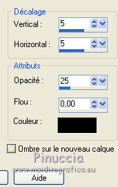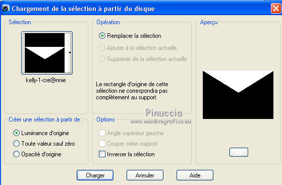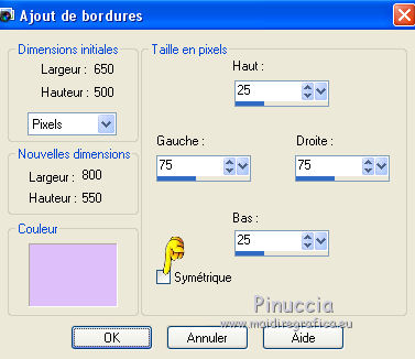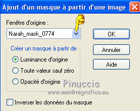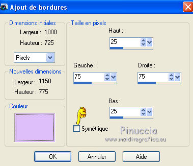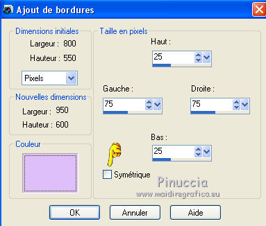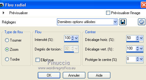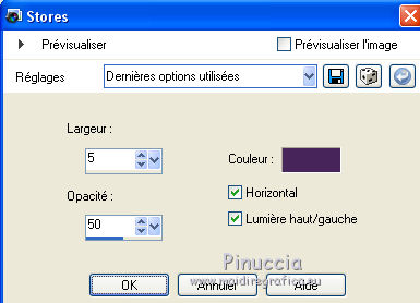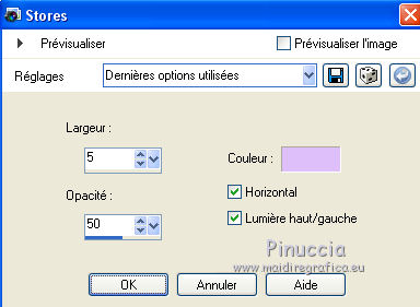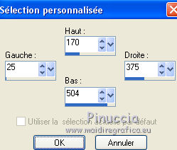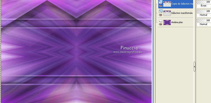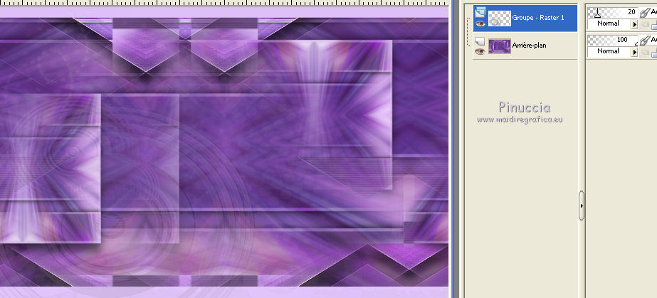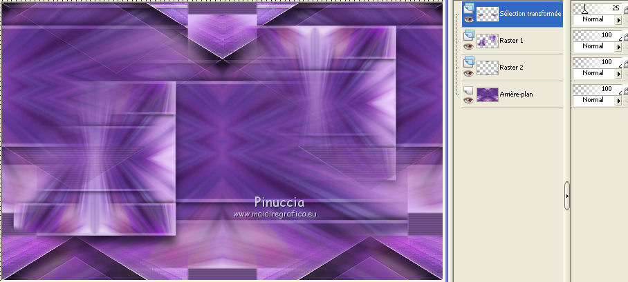 Ce tutoriel a été créé avec CorelX6 et traduit avec CorelX12, mais il peut également être exécuté avec les autres versions. Suivant la version utilisée, vous pouvez obtenir des résultats différents. Depuis la version X4, la fonction Image>Miroir a été remplacée par Image>Renverser horizontalement, et Image>Renverser avec Image>Renverser verticalement. Dans les versions X5 et X6, les fonctions ont été améliorées par la mise à disposition du menu Objets. Avec la nouvelle version X7, nous avons encore Image>Miroir et Image>Renverser/Retourner, mais avec nouvelles différences. Voir les détails à ce sujet ici Certaines dénominations ont changées entre les versions de PSP. Les plus frequentes dénominations utilisées: ![]() Traduction en italien ici Vos versions ici Nécessaire pour réaliser ce tutoriel: Matériel ici Pour le tube merci Gabry et pour le masque Narah Modules Externes: consulter, si nécessaire, ma section des filtres ici Filters Unlimited 2.0 ici Graphics Plus - Cross shadow, Horizontal Mirror, Quick Tile I, Quick Tile II ici Mura's Meister - Perspective Tiling ici Filtres Graphics Plus peuvent être utilisés seuls ou importés dans Filters Unlimited. voir comment le faire ici). Si un filtre est fourni avec cette icône, ![]() en fonction des couleurs utilisées, vous pouvez changer le mode mélange et l'opacité des calques. Placer les sélections dans le dossier Sélections. Ouvrir le masque dans PSP et le minimiser avec le reste du matériel. 1. Ouvrir une nouvelle image transparente 650 x 500 pixels. 2. Placer en avant plan la couleur claire #debffa, et en arrière plan la couleur foncée #47265b. ![]() 3. Remplir l'image transparente avec la couleur de premier plan.4. Sélections>Sélectionner tout. Activer le tube gabry-woman947, Édition>Copier. ne pas fermer le tube: on va s'en servir plus tard Revenir sur votre travail et Édition>Coller dans la sélection. Sélections>Désélectionner tout. 5. Effets>Modules Externes>Graphics Plus - Horizontal mirror. ![]() 6. Réglage>Flou>Flou radial. ![]() 7. Calques>Dupliquer. Placer le calque en mode Lumière dure. Calques>Fusionner>Fusionner le calque de dessous. 8. Effets>Modules Externes>Graphics Plus - Quick Tile I. ![]() 9. Activer l'outil Sélection ![]() (peu importe le type de sélection, parce que avec la sélection personnalisée vous obtenez toujours un rectangle), cliquer sur Sélection personnalisée ![]() et setter ces paramètres. ![]() 10. Sélections>Transformer la sélection en calque. 11. Effets>Effets 3D>Ombre portée, couleur noire. ![]() 12. Sélections>Modifier>Sélectionner les bordures de la sélection. ![]() 13. Réduire l'opacité de l'outil Pot de peinture à 40, et remplir la sélection avec la couleur d'avant plan.![]() Sélections>Désélectionner tout. 14. Effets>Effets d'image>Mosaïque sans jointures, par défaut. ![]() Placer le calque en mode Luminance. ![]() 15. Effets>Effets de bords>Dilater. Calques>Fusionner>Fusionner le calque de dessous. 16. Édition>Copier. l'image sera en mémoire jusqu'à point 27. Si vous voulez, par précaution, Édition>coller comme nouvelle image et la minimiser 17. Image>Ajouter des bordures, symétrique décoché, couleur d'avant plan. ![]() 18. Effets>Modules Externes>Graphics Plus - Quick Tile II. ![]() 19. Sélections>Charger/Enregistrer une sélection>Charger à partir du disque. Chercher et charger la sélection kelly-1-cre@nnie. ![]() Sélections>Transformer la sélection en calque. 20. Effets>Effets 3D>Ombre portée, couleur noire. ![]() Sélections>Désélectionner tout. 21. Effets>Modules Externes>Graphics Plus - Horizontal mirror. ![]() 22. Calques>Dupliquer. Placer le calque en mode Écran. ![]() 23. Calques>Fusionner>Fusionner le calque de dessous. Effets>Effets de bords>Accentuer davantage. 24. Image>Ajouter des bordures, comme précédemment. ![]() 25. Effets>Effets d'image>Mosaïque sans jointures. ![]() 26. Calques>Nouveau calque raster. Sélection personnalisée ![]() ![]() 27. Édition>Coller dans la sélection (l'image en mémoire du point 16). ![]() 28. Effets>Effets 3D>Ombre portée, comme précédemment. 29. Sélections>Modifier>Sélectionner les bordures de la sélection, comme précédemment. 30. Remplir la sélection avec la couleur d'avant plan,opacité toujours à 40. ![]() Sélections>Désélectionner tout. 31. Effets>Effets d'image>Mosaïque sans jointures, comme précédemment. 32. Vous positionner sur le calque du bas de la pile. Calques>Nouveau calque raster. 33. Sélections>Charger/Enregistrer une sélection>Charger à partir du disque. Chercher et charger la sélection kelly-2-cre@nnie. ![]() 34. Placer à nouveau à 100 l'opacité de l'outil Pot de peinture, et remplir la sélection avec la couleur d'arrière plan.Sélections>Désélectionner tout. 35. Effets>Effets de textures>Stores - couleur d'avant plan. ![]() 36. Réglage>Flou>Flou. 37. Vous positionner sur le calque du bas de la pile. Sélections>Charger/Enregistrer une sélection>Charger à partir du disque. Chercher et charger la sélection kelly-3-cre@nnie. ![]() Sélections>Transformer la sélection en calque. Sélections>Désélectionner tout. 38. Image>Renverser. Effets>Effets d'image>Décalage. ![]() 39. Effets>Effets de textures>Stores, comme précédemment. 40. Réduire l'opacité de ce calque à 25%. Calques>Agencer>Placer en haut de la pile. ![]() 41. Image>Ajouter des bordures, 25 pixels, symétrique, couleur d'avant plan. 42. Effets>Effets d'image>Mosaïque sans jointures. ![]() 43. Calques>Nouveau calque raster. Remplir avec la couleur d'avant plan.44. Calques>Nouveau calque de masque>A partir d'une image. Ouvrir le menu deroulant sous la fenêtre d'origine et vous verrez la liste des images ouverts. Sélectionner le masque Narah_mask_0774. ![]() Calques>Fusionner>Fusionner le groupe. 45. Effets>Effets de textures>Gaufrage. Réduire l'opacité de ce calque à 20%. ![]() 46. Vous positionner sur le calque du bas de la pile. Activer l