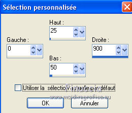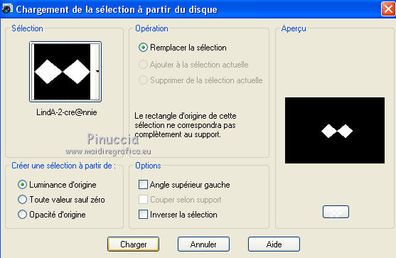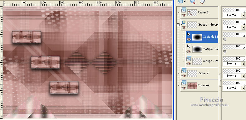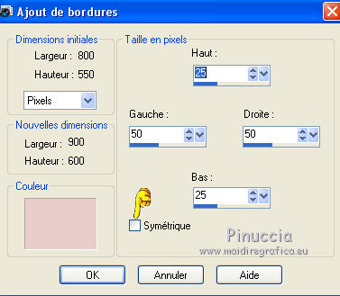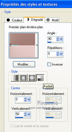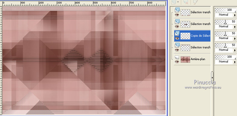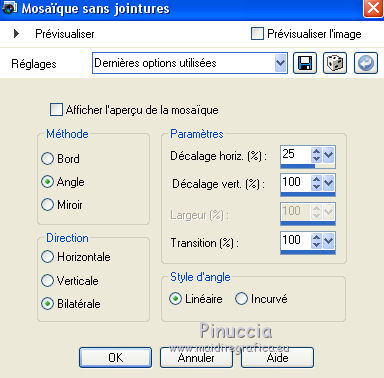 Ce tutoriel a été créé avec CorelX6 et traduit avec CorelX12, mais il peut également être exécuté avec les autres versions. Suivant la version utilisée, vous pouvez obtenir des résultats différents. Depuis la version X4, la fonction Image>Miroir a été remplacée par Image>Renverser horizontalement, et Image>Renverser avec Image>Renverser verticalement. Dans les versions X5 et X6, les fonctions ont été améliorées par la mise à disposition du menu Objets. Avec la nouvelle version X7, nous avons encore Image>Miroir et Image>Renverser/Retourner, mais avec nouvelles différences. Voir les détails à ce sujet ici Certaines dénominations ont changées entre les versions de PSP. Les plus frequentes dénominations utilisées: ![]() Traduction en italien ici Vos versions ici Nécessaire pour réaliser ce tutoriel: Matériel ici Pour le tube et le masque merci Linda Modules Externes: consulter, si nécessaire, ma section des filtres ici Filters Unlimited 2.0 ici &<Bkg Kaleidoscope> - @BlueBerry Pie (à importer dans Unlimited) ici Tramages - Tow the line ici Toadies ici Alien Skin Eye Candy 5 Impact - Glass ici Filtres Toadies et Tramages peuvent être utilisés seuls ou importés dans Filters Unlimited. voir comment le faire ici). Si un filtre est fourni avec cette icône, ![]() en fonction des couleurs utilisées, vous pouvez changer le mode mélange et l'opacité des calques. Dans les plus récentes versions de PSP, vous ne trouvez pas le dégradé d'avant plan/arrière plan ou Corel_06_029. Vous pouvez utiliser le dégradé des versions antérieures. Ici le dossier Dégradés de CorelX. Placer le preset En cliquant sur le preset une ou deux fois (selon vos réglages) automatiquement il se placera directement dans le dossier Settings de Alien Skin Eye Candy. pourquoi un ou deux clic voir ici Placer les sélections dans le dossier Sélections. Placer le masque 20-20 dans le dossier Masque. Ouvrir le masque de Linda dans PSP et le minimiser aver le reste du matériel. 1. Ouvrir une nouvelle image transparente 650 x 500 pixels. 2. Placer en avant plan la couleur claire #e8cdca, et en arrière plan la couleur foncée #a17b73. ![]() 3. Préparer en avant plan un dégradé de premier plan/arrière plan, style Radial. ![]() Remplir l'image transparente du dégradé.4. Calques>Dupliquer. Effets>Effets de distorsion>Coordonnées polaires. ![]() 5. Placer le calque en mode Lumière douce et réduire l'opacité à 50%. 6. Calques>Fusionner>Fusionner le calque de dessous. 7. Calques>Dupliquer. Image>Renverser. 8. Image>Redimensionner, à 65%, redimensionner tous les calques décoché. 9. Image>Ajouter des bordures, symétrique décoché, couleur d'avant plan. ![]() 10. Effets>Effets d'image>Mosaïque sans jointures. ![]() 11. Calques>Dupliquer. 12. Effets>Modules Externes>Filters Unlimited 2.0 - [AFS IMPORT] - sqborder2, par défaut. ![]() 13. Placer le calque en mode Multiplier. 14. Calques>Fusionner>Fusionner le calque de dessous. 15. Effets>Effets d'image>Mosaïque sans jointures, par défaut. ![]() 16. Effets>Modules Externes>Filters Unlimited 2.0 - &<Bkg Kaleidoscope> - @BlueBerry pye. ![]() 17. Image>Ajouter des bordures, symétrique décoché, couleur d'avant plan. ![]() 18. Effets>Effets d'image>Mosaïque sans jointures. ![]() 19. Activer l'outil Sélection ![]() (peu importe le type de sélection, parce que avec la sélection personnalisée vous obtenez toujours un rectangle), cliquer sur Sélection personnalisée ![]() et setter ces paramètres. ![]() Sélectionner>Transformer la sélection en calque. 20. Effets>Effets 3D>Ombre portée, couleur noire. ![]() 21. Calques>Fusionner>Fusionner le calque de dessous. 22. Sélections>Charger/Enregistrer une sélection>Charger à partir du disque. Chercher et charger la sélection lindA-1-cre@nnie. ![]() Sélectionner>Transformer la sélection en calque. 23. Effets>Modules Externes>Tramages - Tow the line. ![]() Sélectionner>Désélectionner tout. 24. Calques>Dupliquer. Image>Miroir. Calques>Fusionner>Fusionner le calque de dessous. 25. Vous positionner sur le calque du bas de la pile. Sélections>Charger/Enregistrer une sélection>Charger à partir du disque. Chercher et charger la sélection lindA-2-cre@nnie. ![]() Sélectionner>Transformer la sélection en calque. 26. Effets>Modules Externes>Tramages - TeeWee. ![]() 27. Effets>Effets 3D>Ombre portée, comme précédemment. Réduire l'opacité de ce calque à 50%. 28. Vous positionner sur le calque du bas de la pile. Sélection personnalisée ![]() ![]() Sélectionner>Transformer la sélection en calque. Sélectionner>Désélectionner tout. 29. Effets>Modules Externes>Toadies - What are you. ![]() 30. Effets>Modules Externes>Tramages, TeeWee, comme précédemment. 31. Réduire l'opacité de ce calque à 50%. 32. Calques>Dupliquer. Image>Renverser. Vous devriez avoir ce-ci. ![]() Calques>Fusionner>Calques visibles. 33. Édition>Copier. 34. Calques>Nouveau calque raster. 35. Sélection personnalisée ![]() ![]() 36. Édition>Coller dans la sélection. Effets>Effets de bords>Accentuer. 37. Effets>Modules Externes>Alien Skin Eye Candy 5 Impact - Glass. Sélectionner le preset LindA-cre@nnie et ok. ![]() Ci-dessous les règlages en cas de problèmes avec le preset. ![]() 38. Sélectionner>Désélectionner tout. 39. Calques>Dupliquer. Effets>Effets d'image>Décalage. ![]() 40. Calques>Dupliquer. Effets>Effets d'image>Décalage, comme précédemment. ![]() 41. Calques>Fusionner>Fusionner le calque de dessous. Édition>Répéter Fusionner le calque de dessous. 42. Effets>Effets 3D>Ombre portée, couleur noire. ![]() 43. Calques>Nouveau calque raster. Placer en avant plan la Couleur. 44. Sélections>Charger/Enregistrer une sélection>Charger à partir du disque. Chercher et charger la sélection lindA-3-cre@nnie. ![]() Remplir la sélection avec la couleur d'avant plan.Sélectionner>Désélectionner tout. 45. Effets>Effets de bords>Accentuer davantage. Édition>Répéter Accentuer davantage. 