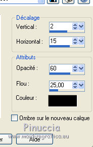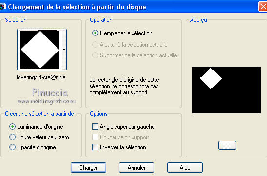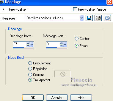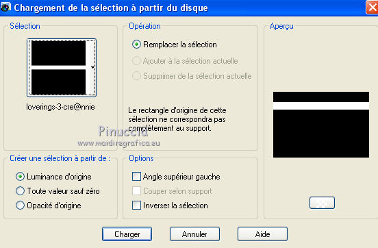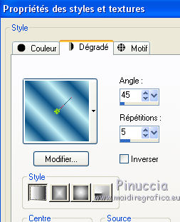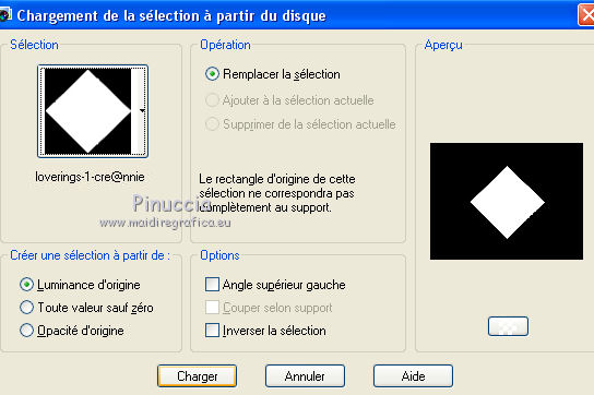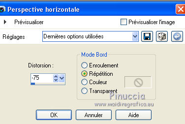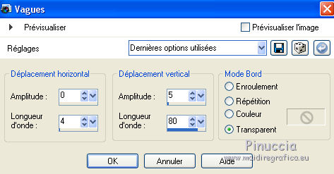 Ce tutoriel a été créé avec CorelX6 et traduit avec CorelX12, mais peut également être exécuté avec les autres versions. Suivant la version utilisée, vous pouvez obtenir des résultats différents. Depuis la version X4, la fonction Image>Miroir a été remplacée par Image>Renverser horizontalement, et Image>Renverser avec Image>Renverser verticalement. Dans les versions X5 et X6, les fonctions ont été améliorées par la mise à disposition du menu Objets. Avec la nouvelle version X7, nous avons encore Image>Miroir et Image>Renverser/Retourner, mais avec nouvelles différences. Voir les détails à ce sujet ici Certaines dénominations ont changées entre les versions de PSP. Les plus frequentes dénominations utilisées: ![]() Traduction en italien ici Vos versions ici Nécessaire pour réaliser ce tutoriel: Matériel ici Pour le tube de la femme merci AnaRidzi Modules Externes: consulter, si nécessaire, ma section des filtres ici Filters Unlimited 2.0 ici Mura's Meister - Copies ici Tramages ici Alf's Power Toys ici Alien Skin Xenofex 2.0 ici Alien Skin Eye Candy 5 Impact - Perspective Shadow ici Filtres Tramages et Alf's Power Toys peuvent être utilisés seuls ou importés dans Filters Unlimited. voir comment le faire ici). Si un filtre est fourni avec cette icône, ![]() en fonction des couleurs utilisées, vous pouvez changer le mode mélange et l'opacité des calques. Dans les plus récentes versions de PSP, vous ne trouvez pas le dégradé d'avant plan/arrière plan ou Corel_06_029. Vous pouvez utiliser le dégradé des versions antérieures. Ici le dossier Dégradés de CorelX. Placer le preset En cliquant sur le preset une ou deux fois (selon vos réglages) automatiquement il se placera directement dans le dossier Settings de Alien Skin Eye Candy. pourquoi un ou deux clic voir ici Placer les sélections dans le dossier Sélections. 1. Ouvrir une nouvelle image transparente 650 x 500 pixels. 2. Placer en avant plan la couleur claire #c4f1f7, et en arrière plan la couleur foncée #0a5185. ![]() 3. Préparer en avant plan un dégradé de premier plan/arrière plan, style Linéaire. ![]() Remplir l'image transparente avec la couleur d'arrière plan.4. Effets>Modules Externes>Tramages - Tow the line. ![]() 5. Calques>Dupliquer. Image>Miroir. Réduire l'opacité de ce calque à 50%. Calques>Fusionner>Fusionner le calque de dessous. 6. Effets>Modules Externes>Alf's Power Toys - Mirror Offset. ![]() 7. Calques>Nouveau calque raster. Remplir le calque du dégradé.8. Effets>Modules Externes>Alf's Power Toys - Split Distortion. ![]() Placer le calque en mode Lumière dure. 9. Réglage>Flou>Flou gaussien - rayon 15. ![]() Réduire l'opacité de ce calque à 70%. Calques>Fusionner>Fusionner le calque de dessous. 10. Sélections>Charger/Enregistrer une sélection>Charger à partir du disque. Chercher et charger la sélection loverings-1-cre@nnie. ![]() Sélections>Transformer la sélection en calque. 11. Effets>Effets 3D>Ombre portée, couleur noire. ![]() Sélections>Désélectionner tout. 12. Image>Rotation libre - 90 degrés à gauche. ![]() 13. Effets>Modules Externes>Mura's Meister - Copies. ![]() Calques>Fusionner>Fusionner le calque de dessous. 14. Effets>Effets d'image>Mosaïque sans jointures, par défaut. ![]() 15. Image>Ajouter des bordures, symétrique décoché, couleur blanche. ![]() 16. Effets>Effets d'image>Mosaïque sans jointures. ![]() 17. Image>Rotation à droite. Si vous utilisez PSP 9: Image>Rotation - Rotation de 90 degrés dans le sens horaire 18. Effets>Effets d'image>Mosaïque sans jointures, comme précédemment. Image>Rotation à gauche. Avec PSP 9: Image>Rotation - Rotation de 90 degrés dans le sens anti-joraire 19. Sélections>Charger/Enregistrer une sélection>Charger à partir du disque. Chercher et charger la sélection loverings-2-cre@nnie. ![]() Sélections>Transformer la sélection en calque. Sélections>Désélectionner tout. 20. Effets>Effets de distorsion>Miroir déformant. ![]() 21. Calques>Dupliquer. Image>Miroir. Calques>Fusionner>Fusionner le calque de dessous. 22. Effets>Effets géométriques>Perspective horizontale. ![]() 23. Effets>Effets 3D>Ombre portée, couleur noire. ![]() À nouveau Effets>Effets 3D>Ombre portée, couleur noire. ![]() 24. Calques>Nouveau calque raster. Sélections>Charger/Enregistrer une sélection>Charger à partir du disque. Chercher et charger la sélection loverings-3-cre@nnie. ![]() 25. Placer en avant plan la Couleur. Remplir la sélection avec la couleur d'avant plan.Réduire l'opacité de ce calque à 25%. Sélections>Désélectionner tout. 26. Effets>Modules Externes>Alien Skin Xenofex 2.0 - Shatter. ![]() Effets>Effets de bords>Accentuer davantage. Placer le calque en mode Multiplier. 27. Effets>Effets de distorsion>Vagues. ![]() 28. Vous positionner sur le calque du bas de la pile. Calques>Nouveau calque raster. Sélections>Charger/Enregistrer une sélection>Charger à partir du disque. Chercher et charger la sélection loverings-4-cre@nnie. ![]() 29. Ouvrir l'image "ringen" - Édition>Copier. Revenir sur votre travail et Édition>Coller dans la sélection. Sélections>Désélectionner tout. 30. Calques>Dupliquer. Image>Miroir. 31. Effets>Effets d'image>Décalage. ![]() 32. Calques>Fusionner>Fusionner le calque de dessous. Placer le calque en mode Éclaircir et réduire l'opacité à 60%. 33. Ouvrir le tube ring3 - Édition>Copier. Revenir sur votre travail et Édition>Coller comme nouveau calque. Calques>Agencer>Déplacer vers le haut. Image>Redimensionner, à 35%, redimensionner tous les calques décoché. Image>Miroir. 34. Effets>Effets d'image>Décalage. ![]() 35. Réduire pour le moment l'opacité de ce calque à 50%. Activer l'outil Sélection au lasso , point à point,et sélectionner la partie du bague qui devrait être couverte par le ruban. ![]() Presser CANC sur le clavier ![]() Sélections>Désélectionner tout. Placer à nouveau l'opacité du calque à 100. ![]() 36. Effets>Modules Ext