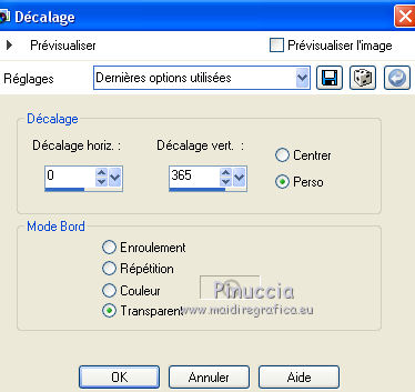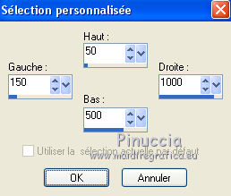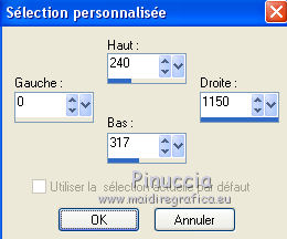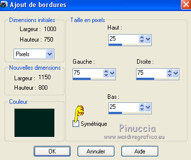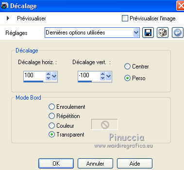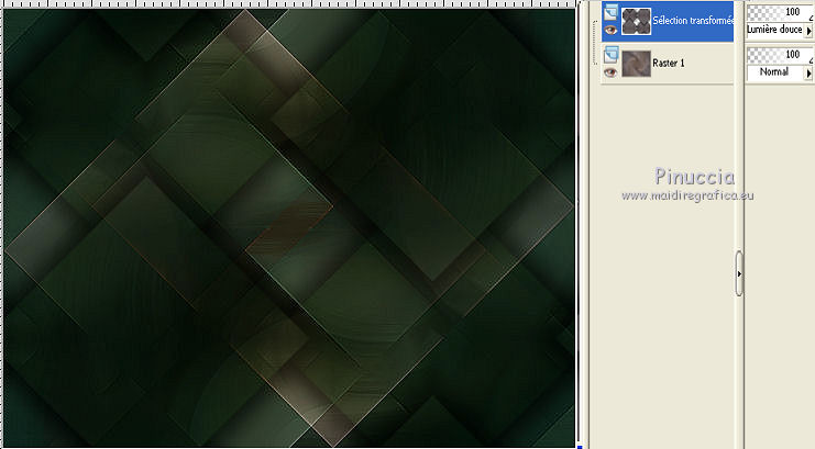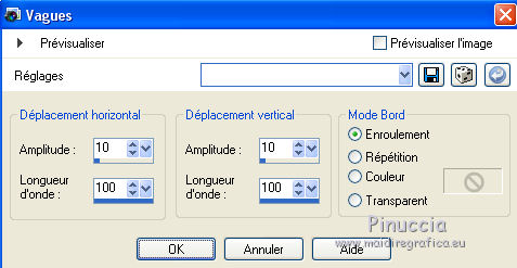 Ce tutoriel a été créé avec CorelX6 et traduit avec CorelX12, mais il peut également être exécuté avec les autres versions. Suivant la version utilisée, vous pouvez obtenir des résultats différents. Depuis la version X4, la fonction Image>Miroir a été remplacée par Image>Renverser horizontalement, et Image>Renverser avec Image>Renverser verticalement. Dans les versions X5 et X6, les fonctions ont été améliorées par la mise à disposition du menu Objets. Avec la nouvelle version X7, nous avons encore Image>Miroir et Image>Renverser/Retourner, mais avec nouvelles différences. Voir les détails à ce sujet ici Certaines dénominations ont changées entre les versions de PSP. Les plus frequentes dénominations utilisées: ![]() Traduction en italien ici Vos versions ici Nécessaire pour réaliser ce tutoriel: Matériel ici Pour le matériel merci Thafs Garder le nom du tube. Le © appartient à l'artiste original. Garder le crédit de ceux qui ont créé le tube. Modules Externes: consulter, si nécessaire, ma section des filtres ici Filters Unlimited 2.0 ici Toadies - What are you ici &<Background Designer IV - @lakeside reflection mmmm (da importare in Unlimited) ici Simple - Centre Tile ici Mehdi - Sorting Tiles ici AAA Frames - Foto Frame ici Filtres Toadies peuvent être utilisés seuls ou importés dans Filters Unlimited. voir comment le faire ici). Si un filtre est fourni avec cette icône, ![]() Placer les sélections dans le dossier Sélections. La texture Corel15_032 est standard dans les versions plus récentes de PSP, et correspond à la texture Mur de briques des versions précédentes. Si vous ne la trouvez pas dans votre PSP, placer la texture fournie dans le dossier Textures. 1. Ouvrir une nouvelle image transparente 650 x 500 pixels. 2. Placer en avant plan la couleur claire #87a689, et en arrière plan la couleur foncée #01241d. ![]() 3. Remplir l'image transparente avec la couleur d'arrière plan.4. Sélections>Sélectionner tout. Activer tube absinthe_fairy_by_ophelias..._thafs, - Édition>Copier. ne pas fermer le tube: on va s'en servir plus tard Revenir sur votre travail et Édition>Coller dans la sélection. Sélections>Désélectionner tout. 5. Réglage>Flou>Flou radial. ![]() 6. Effets>Modules Externes>Mehdi - Sorting Tiles. ![]() 7. Effets>Effets de bords>Accentuer davantage. 8. Calques>Dupliquer. Image>Miroir. Image>Renverser. Réduire l'opacité de ce calque à 50%. Calques>Fusionner>Fusionner le calque de dessous. 9. Sélections>Charger/Enregistrer une sélection>Charger à partir du disque. Chercher et charger la sélection mila-1-cre@nnie. ![]() Sélections>Transformer la sélection en calque. Sélections>Désélectionner tout. 10. Effets>Effets d'image>Décalage. ![]() 11. Effets>Effets 3D>Ombre portée, couleur noire. ![]() 12. Calques>Dupliquer. Image>Miroir. Image>Renverser. Calques>Fusionner>Fusionner le calque de dessous. 13. Calques>Dupliquer. Image>Miroir. Calques>Fusionner>Fusionner le calque de dessous. 14. Effets>Modules Externes>Simple - Centre Tile. Placer le calque en mode Lumière douce. ![]() Calques>Fusionner>Fusionner le calque de dessous. 15. Édition>Copier. 16. Image>Ajouter des bordures, symétrique décoché, couleur d'avant plan. ![]() 17. Effets>Modules Externes>Simple - Centre Tile. 18. Calques>Nouveau calque raster. Remplir avec la couleur d'arrière plan.Réduire l'opacité de ce calque à 50%. 19. Effets>Effets de textures>Stores, couleur noire. ![]() 20. Édition>Coller comme nouveau calque. 21. Effets>Effets 3D>Ombre portée, couleur noire. ![]() 22. Image>Ajouter des bordures, 50 pixels, symétrique, couleur d'avant plan. 23. Effets>Effets 3D>Bouton, couleur d'arrière plan. ![]() 24. Sélections>Sélectionner tout. Image>Ajouter des bordures, 25 pixels, symétrique, couleur d'arrière plan. Sélections>Inverser. 25. Effets>Effets 3D>Bouton, comme précédemment. Sélections>Désélectionner tout. 26. Édition>Copier. 27. Image>Ajouter des bordures, symétrique décoché, couleur d'arrière plan. ![]() 28. Effets>Modules Externes>Toadies - What are you. ![]() Effets>Effets de bords>Accentuer davantage. 29. Effets>Modules Externes>Filters Unlimited 2.0 - &<Background Designers IV> - @Lakeside Reflection mmmm ![]() si vous utilisez autres couleurs, jouer avec les paramètres Red, Green et Blue. Pour la version en bas, par exemple: ![]() 30. Calques>Nouveau calque raster. Activer l'outil Sélection ![]() (peu importe le type de sélection, parce que avec la sélection personnalisée vous obtenez toujours un rectangle), cliquer sur Sélection personnalisée ![]() et setter ces paramètres. ![]() Édition>Coller dans la sélection. Sélections>Désélectionner tout. 31. Activer le tube deco-1-mila-cre@nnie - Édition>Copier. Revenir sur votre travail et Édition>Coller comme nouveau calque. 32. Effets>Effets d'image>Décalage. ![]() Effets>Effets de bords>Accentuer davantage. 33. Calques>Agencer>Déplacer vers le bas. Vous positionner sur le calque du haut de la pile. Calques>Fusionner>Fusionner le calque de dessous. 34. Effets>Effets 3D>Ombre portée, comme précédemment. Édition>Répéter Ombre portée. 35. Activer le tube deco-2-mila-cre@nnie - Édition>Copier. Revenir sur votre travail et Édition>Coller comme nouveau calque. 36. Effets>Effets d'image>Décalage. ![]() Effets>Effets de bords>Eroder. 37. Activer le tube L&K_boom - Édition>Copier. Revenir sur votre travail et Édition>Coller comme nouveau calque. Image>Redimensionner, à 125%, redimensionner tous les calques décoché. 38. Effets>Effets d'image>Décalage. ![]() 39. Calques>Dupliquer. Image>Miroir. Déplacer ce tube en bas.![]() 40. Vous positionner sur le calque du bas de la pile. Sélection personnalisée ![]() ![]() Sélections>Transformer la sélection en calque. Sélections>Désélectionner tout. 41. Effets>Effets de distorsions>Vagues. ![]() 42. Effets>Effets d'image>Décalage. ![]() 43. Effets>Effets 3D>Ombre portée, comme précédemment