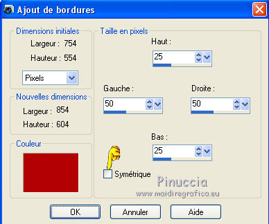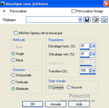 Ce tutoriel a été créé avec CorelX6 et traduit avec CorelX12, mais il peut également être exécuté avec les autres versions. Suivant la version utilisée, vous pouvez obtenir des résultats différents. Depuis la version X4, la fonction Image>Miroir a été remplacée par Image>Renverser horizontalement, et Image>Renverser avec Image>Renverser verticalement. Dans les versions X5 et X6, les fonctions ont été améliorées par la mise à disposition du menu Objets. Avec la nouvelle version X7, nous avons encore Image>Miroir et Image>Renverser/Retourner, mais avec nouvelles différences. Voir les détails à ce sujet ici Certaines dénominations ont changées entre les versions de PSP. Les plus frequentes dénominations utilisées: ![]() Traduction en italien ici Vos versions ici Nécessaire pour réaliser ce tutoriel: Matériel ici Merci pour les tubes Joanie Pour le tube utilisé pour la traduction en français merci K@rine Modules Externes: consulter, si nécessaire, ma section des filtres ici Filters Unlimited 2.0 ici Toadies - What are you ici AP 01 [Innovations] - Lines SilverLining ici Mehdi - Sorting Tiles ici Mehdi - Kaleidoscope 2.1 ici FM Tile Tools - Blend Emboss ici ![]() en fonction des couleurs utilisées, vous pouvez changer le mode mélange et l'opacité des calques. Placer les sélections dans le dossier Sélections. 1. Ouvrir une nouvelle image transparente 650 x 500 pixels. 2. Placer en avant plan la couleur claire #b30005, et en arrière plan la couleur foncée #0b0908. ![]() 3. Remplir l'image transparente avec la couleur d'arrière plan.4. Sélections>Sélectionner tout. Ouvrir le tube Joanie_Woman_30-05-2012 - Édition>Copier. ne pas fermer le tube: on va s'en servir plus tard Revenir sur votre travail et Édition>Coller dans la sélection. Sélections>Désélectionner tout. 5. Effets>Modules Externes>Mehdi - Kaleidoscope 2.1. ![]() 6. Réglage>Flou>Flou radial. ![]() 7. Effets>Effets de distorsion>Coordonnées polaires. ![]() 8. Calques>Dupliquer. Image>Miroir. Image>Renverser. Placer le calque en mode Luminance (héritée). Calques>Fusionner>Fusionner le calque de dessous. 9. Sélections>Sélectionner tout. Sélections>Modifier>Sélectionner les bordures de la sélection. ![]() 10. Remplir la sélection avec la couleur d'arrière plan.Sélections>Désélectionner tout. 11. Calques>Dupliquer. Image>Redimensionner, 75 x 50%, verrouiller les proportions et redimensionner tous les calques décoché. ![]() 12. Calques>Dupliquer. Effets>Modules Externes>Mehdi - Sorting Tiles. ![]() 13. Effets>Modules Externes>Toadies - What are you. ![]() Effets>Effets de bords>Accentuer. 14. Activer l'outil Baguette magique ![]() ![]() cliquer dans la partie transparente pour la sélectionner. ![]() 15. Vous positionner sur le calque du bas de la pile. Sélections>Transformer la sélection en calque. Sélections>Désélectionner tout. 16. Effets>Modules Externes>Toadies - What are you, comme précédemment. Placer le calque en mode Différence. 17. Image>Ajouter des bordures, 2 pixels, symétrique, couleur d'avant plan. 18. Image>Ajouter des bordures, symétrique décoché, couleur d'arrière plan. ![]() 19. Image>Ajouter des bordures, comme précédemment, mais couleur d'avant plan. ![]() 20. Sélectionner le dernier bord avec la baguette magique ![]() Sélections>Inverser. 21. Effets>Effets d'image>Mosaïque sans jointures. ![]() Sélections>Inverser. Sélections>Transformer la sélection en calque. Sélections>Désélectionner tout. 22. Effets>Modules Externes>Toadies - What are you, comme précédemment. Calques>Fusionner>Fusionner le calque de dessous. 23. Sélections>Charger/Enregistrer une sélection>Charger à partir du disque. Chercher et charger la sélection myheart-1-cre@nnie. ![]() Sélections>Transformer la sélection en calque. 24. Effets>Modules Externes>Toadies - What are you, comme précédemment. Sélections>Désélectionner tout. 25. Effets>Effets 3D>Ombre portée, couleur noire. ![]() 26. Calques>Dupliquer. Placer le calque en mode Lumière dure et réduire l'opacité à 50%. ![]() 27. Vous positionner sur le calque du bas de la pile. Calques>Nouveau calque raster. 28. Activer l'outil Sélection ![]() (peu importe le type de sélection, parce que avec la sélection personnalisée vous obtenez toujours un rectangle), cliquer sur Sélection personnalisée ![]() et setter ces paramètres. ![]() Remplir la sélection avec la couleur d'avant plan.Sélections>Désélectionner tout. 29. Effets>Modules Externes>AP 01 [Innovations] - Lines SilverLining. ![]() Placer le calque en mode Assombrir davantage. 30. Calques>Dupliquer. Image>Miroir. Calques>Fusionner>Calques visibles. 31. Sélections>Charger/Enregistrer une sélection>Charger à partir du disque. Chercher et charger la sélection myheart-2-cre@nnie. ![]() 32. Effets>Effets 3D>Bouton, couleur d'arrière plan. ![]() Sélections>Désélectionner tout. 33. Ouvrir le tube takken1, Édition>Copier. Revenir sur votre travail et Édition>Coller comme nouveau calque. Image>Redimensionner, à 75%, redimensionner tous les calques décoché ne pas oublier de cocher Verouiller les proportions. ![]() 34. Effets>Effets d'image>Décalage. ![]() 35. Ouvrir le tube deco-myheart - Édition>Copier. Revenir sur votre travail et Édition>Coller comme nouveau calque. 36. Effets>Effets d'image>Décalage. ![]() Réduire l'opacité de ce calque à 65%. 37. Ouvrir le tube harten. Vous positionner sur le calque raster 2 et Édition>Copier. Revenir sur votre travail et Édition>Coller comme nouveau calque. Image>Redimensionner, à 60%, redimensionner tous les calques décoché. Positionner le coeur sous la branche (voir mon exemple).38. Répéter l'étape 37 avec les autres 3 calques du tube harten. 39. Fermer le calque du bas de la pile. Calques>Fusionner>Calques visibles. Effets>Effets 3D>Ombre portée, comme précédemment. 40. Re-ouvrir le calque du bas de la pile et rester positionné sur le calque du haut. Activer à nouveau le tub