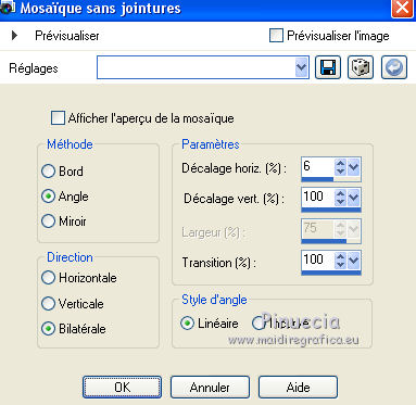 Ce tutoriel a été créé avec CorelX6 et traduit avec CorelX12, mais il peut également être exécuté avec les autres versions. Suivant la version utilisée, vous pouvez obtenir des résultats différents. Depuis la version X4, la fonction Image>Miroir a été remplacée par Image>Renverser horizontalement, et Image>Renverser avec Image>Renverser verticalement. Dans les versions X5 et X6, les fonctions ont été améliorées par la mise à disposition du menu Objets. Avec la nouvelle version X7, nous avons encore Image>Miroir et Image>Renverser/Retourner, mais avec nouvelles différences. Voir les détails à ce sujet ici Certaines dénominations ont changées entre les versions de PSP. Les plus frequentes dénominations utilisées: ![]() Traduction en italien ici Vos versions ici Nécessaire pour réaliser ce tutoriel: Matériel ici Merci pour le tube Gabry Pour le tube utilisé pour la traduction en français merci Min@. Modules Externes: consulter, si nécessaire, ma section des filtres ici Filters Unlimited 2.0 ici Toadies - What are you ici AAA Frames - Foto Frame ici Mura's Meister - Perspective Tiling ici L&K's - L&K's Adonis ici Simple - Pizza slice mirror ici Filtres Toadies et Simple peuvent être utilisés seuls ou importés dans Filters Unlimited. voir comment le faire ici). Si un filtre est fourni avec cette icône, ![]() Si vous ne voulez pas écuter la musique, presser la touche ESC |