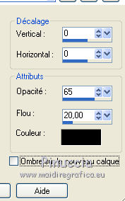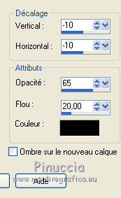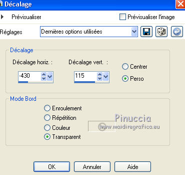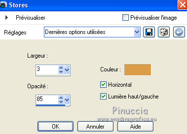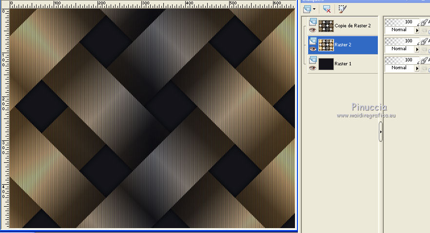 Ce tutoriel a été créé avec CorelX6 et traduit avec CorelX12, mais il peut également être exécuté avec les autres versions. Suivant la version utilisée, vous pouvez obtenir des résultats différents. Depuis la version X4, la fonction Image>Miroir a été remplacée par Image>Renverser horizontalement, et Image>Renverser avec Image>Renverser verticalement. Dans les versions X5 et X6, les fonctions ont été améliorées par la mise à disposition du menu Objets. Avec la nouvelle version X7, nous avons encore Image>Miroir et Image>Renverser/Retourner, mais avec nouvelles différences. Voir les détails à ce sujet ici Certaines dénominations ont changées entre les versions de PSP. Les plus frequentes dénominations utilisées: ![]() Traduction en italien ici Vos versions ici Nécessaire pour réaliser ce tutoriel: Matériel ici Pour le tube merci Maryse Modules Externes: consulter, si nécessaire, ma section des filtres ici Filters Unlimited 2.0 ici Carolaine and Sensibility - CS-LDots ici Flaming Pear - Flood ici Toadies - What are you ici VM Natural - Cross Weave ici Filtres Toadies et VM Natural peuvent être utilisés seuls ou importés dans Filters Unlimited. voir comment le faire ici). Si un filtre est fourni avec cette icône, ![]() en fonction des couleurs utilisées, vous pouvez changer le mode mélange et l'opacité des calques. Dans les plus récentes versions de PSP, vous ne trouvez pas le dégradé d'avant plan/arrière plan ou Corel_06_029. Vous pouvez utiliser le dégradé des versions antérieures. Ici le dossier Dégradés de CorelX. 1. Ouvrir une nouvelle image transparente 650 x 500 pixels. 2. Placer en avant plan la couleur claire #db9d48, et en arrière plan la couleur foncée #14151a. ![]() 3. Préparer en avant plan un dégradé de premier plan/arrière plan, style Linéaire. ![]() Remplir l'image transparente avec la couleur d'arrière plan.4. Calques>Nouveau calque raster. Remplir le calque du dégradé.5. Effets>Modules Externes>VM Natural - Cross Weave. ![]() 6. Calques>Dupliquer. Effets>Effets de textures>Stores, couleur d'arrière plan. ![]() 7. Effets>Effets 3D>Ombre portée, couleur noire. ![]() 8. Vous positionner sur le calque de dessous - Raster 2. ![]() 9. Calques>Fusionner>Fusionner le calque de dessous. 10. Réglage>Flou>Flou gaussien - rayon 35. ![]() 11. Effets>Modules Externes>Carolaine and Sensibility - CS-LDots ![]() 12. Image>Ajouter des bordures, symétrique décoché, couleur d'arrière plan. ![]() 13. Effets>Effets d'image>Mosaïque sans jointures, par défaut. ![]() 14. Calques>Nouveau calque raster. Placer en avant plan la Couleur, et remplir le calque avec la couleur d'avant plan.15. Image>Redimensionner, 50%, redimensionner tous les calques décoché. 16. Image>Rotation libre - 45 degrés à droite. ![]() Placer le calque en mode Lumière douce. 17. Sélections>Sélectionner tout. Image>Ajouter des bordures, symétrique décoché, comme précédemment, couleur d'avant plan. ![]() 18. Effets>Effets d'image>Mosaïque sans jointures, comme précédemment. 19. Sélections>Inverser. Réglage>Flou>Flou gaussien, comme précédemment. 20. Effets>Modules Externes>Toadies - What are you. ![]() Sélections>Désélectionner tout. 21. Effets>Effets d'image>Mosaïque sans jointures. ![]() 22. Calques>Nouveau calque raster. Activer l'outil Sélection ![]() (peu importe le type de sélection, parce que avec la sélection personnalisée vous obtenez toujours un rectangle), cliquer sur Sélection personnalisée ![]() et setter ces paramètres. ![]() Remplir la sélection avec la couleur d'avant plan.23. Ouvrir le tube MR_Nadja, effacer le watermark, et Édition>Copier. ne pas fermer le tube; on va s'en servir plus tard Revenir sur votre travail et Édition>Coller comme nouveau calque. Positionner le tube sur la sélection.![]() 24. Sélections>Inverser. Presser CANC sur le clavier ![]() 25. Sélections>Inverser. Calques>Fusionner>Fusionner le calque de dessous. 26. Calques>Nouveau calque raster. Remplir la sélection avec la couleur d'arrière plan.27. Sélections>Modifier>Contracter - 15 pixels. Presser CANC sur le clavier. 28. Réduire l'opacité de l'outil Pot de peinture à 50, ![]() Remplir la sélection avec la couleur d'arrière plan.ne pas oublier de placer à nouveau l'opacité à 100 28. Effets>Effets de textures>Stores - couleur d'avant plan. ![]() Sélections>Désélectionner tout. 29. Calques>Fusionner>Fusionner le calque de dessous. 30. Calques>Dupliquer. Vous positionner sur le calque de dessous de l'original. 31. Effets>Modules Externes>Toadies - What are you, comme précédemment. Effets>Effets 3D>Ombre portée, comme précédemment. 32. Vous positionner sur le calque du haut de la pile. Édition>Répéter Ombre portée. 33. Calques>Fusionner>Fusionner le calque de dessous. Calques>Dupliquer. 34. Effets>Effets d'image>Mosaïque sans jointures. ![]() 35. Calques>Fusionner>Calques visibles. 36. Édition>Copier. 37. Image>Ajouter des bordures, symétrique décoché, comme précédemment. ![]() 38. Effets>Modules Externes>Toadies - What are you, comme précédemment. Effets>Effets de bords>Accentuer davantage. 39. Édition>Coller comme nouveau calque. Image>Redimensionner, à 80%, redimensionner tous les calques décoché. 40. Vous positionner sur le calque du bas de la pile. Effets>Modules Externes>Flaming Pear - Flood. ![]() 41. Vous positionner sur le calque du haut de la pile. Effets>Modules Externes>Flaming Pear - Flood, comme précédemment. 42. Effets>Effets 3D>Ombre portée, comme précédemment. 43. Calques>Dupliquer. Effets>Effets de distorsion>Bombage. ![]() 44. Image>Miroir. Calques>Agencer>Déplacer vers le bas. 45. Ouvrir le tube chain, Édition>Copier. Revenir sur votre travail et Édition>Coller comme nouveau calque. 46. Effets>Effets d'image>Décalage. ![]() 47. Effets>Effets 3D>Ombre portée, comme précédemment. Placer le calque en mode Lumière dure. 48. Calques>Dupliquer. Image>Miroir. 49. Image>Ajouter des bor