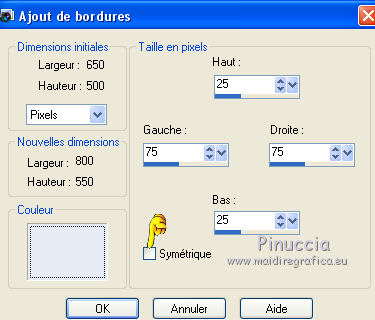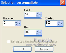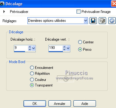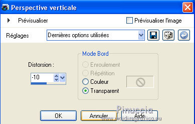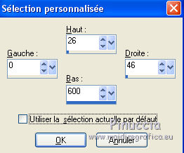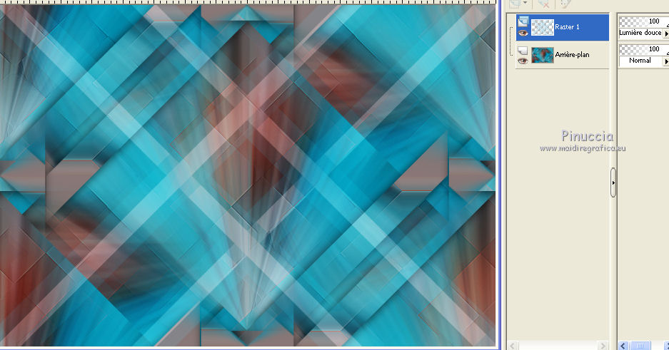 Ce tutoriel a été créé avec CorelX6 et traduit avec CorelX12, mais il peut également être exécuté avec les autres versions. Suivant la version utilisée, vous pouvez obtenir des résultats différents. Depuis la version X4, la fonction Image>Miroir a été remplacée par Image>Renverser horizontalement, et Image>Renverser avec Image>Renverser verticalement. Dans les versions X5 et X6, les fonctions ont été améliorées par la mise à disposition du menu Objets. Avec la nouvelle version X7, nous avons encore Image>Miroir et Image>Renverser/Retourner, mais avec nouvelles différences. Voir les détails à ce sujet ici Certaines dénominations ont changées entre les versions de PSP. Les plus frequentes dénominations utilisées: ![]() Traduction en italien ici Vos versions ici Nécessaire pour réaliser ce tutoriel: Matériel ici Pour le tube merci Maryse Modules Externes: consulter, si nécessaire, ma section des filtres ici Filters Unlimited 2.0 ici Carolaine and Sensibility - CS-LDots ici Mehdi - Sorting Tiles ici Simple - Blintz ici Simple - Left Right Wrap (bonus) ici Toadies - What are you ici Filtres Simple et Toadies peuvent être utilisés seuls ou importés dans Filters Unlimited. voir comment le faire ici). Si un filtre est fourni avec cette icône, ![]() en fonction des couleurs utilisées, vous pouvez changer le mode mélange et l'opacité des calques. Placer les sélections dans le dossier Sélections. 1. Ouvrir une nouvelle image transparente 650 x 500 pixels. 2. Placer en avant plan la couleur claire #e8ecf6, et en arrière plan la couleur foncée #0499b6. ![]() 3. Remplir l'image transparente avec la couleur d'arrière plan.4. Calques>Nouveau calque raster. Sélections>Sélectionner tout. Activer le tube MR_Wella. Sélectionner le watermark avec l'outil Sélection ![]() ![]() Sélections>Inverser. Édition>Copier, et minimiser le tube, pour l'utiliser plus tard. Revenir sur votre travail et Édition>Coller dans la sélection. Sélections>Désélectionner tout. 5. Effets>Effets d'image>Mosaïque sans jointures, par défaut. ![]() 6. Réglage>Flou>Flou radial. ![]() 7. Calques>Fusionner>Fusionner le calque de dessous. 8. Calques>Dupliquer. Effets>Modules Externes>Mehdi - Sorting Tiles. ![]() 9. Placer le calque en mode Lumière douce. ![]() 10. Effets>Effets de bords>Accentuer davantage. Calques>Fusionner>Fusionner le calque de dessous. 11. Effets>Modules Externes>Simple - Blintz. 12. Sélections>Charger/Enregistrer une sélection>Charger à partir du disque. Chercher et charger la sélection olivia-1-cre@nnie. ![]() Sélections>Transformer la sélection en calque. 13. Effets>Effets 3D>Ombre portée, couleur noire. ![]() Sélections>Désélectionner tout. 14. Effets>Modules Externes>Simple - Blintz. 15. Calques>Dupliquer. Image>Miroir. Image>Renverser. 16. Sélections>Sélectionner tout. Image>Ajouter des bordures, symmétrique décoché, couleur d'avant plan. ![]() 17. Édition>Copier. 18. Sélections>Inverser. Édition>Coller dans la sélection. 19. Image>Renverser. 20. Effets>Effets 3D>Ombre portée, comme précédemment. Sélections>Désélectionner tout. 21. Effets>Effets d'image>Mosaïque sans jointures, comme précédemment. 22. Calques>Nouveau calque raster. Activer l'outil Sélection ![]() (peu importe le type de sélection, parce que avec la sélection personnalisée vous obtenez toujours un rectangle), cliquer sur Sélection personnalisée ![]() et setter ces paramètres. ![]() 23. Remplir la sélection avec la couleur d'avant plan.Sélections>Désélectionner tout. 24. Effets>Modules Externes>Toadies - What are you. ![]() 25. Effets>Effets géométriques>Inclinaision. ![]() 26. Calques>Dupliquer. Image>Miroir. Calques>Fusionner>Fusionner le calque de dessous. 27. Image>Renverser. Effets>Modules Externes>Simple - Left Right Wrap. 28. Calques>Dupliquer. Image>Renverser. Calques>Fusionner>Fusionner le calque de dessous. 29. Placer le calque en mode Lumière douce. ![]() 30. Image>Ajouter des bordures, symmétrique décoché, couleur d'avant plan. ![]() 31. Effets>Effets d'image>Mosaïque sans jointures. ![]() 32. Activer l'outil Baguette magique ![]() ![]() et cliquer sur le bords en haut et en bas pour les sélectionner. 33. Effets>Modules Externes>Toadies - What are you. ![]() 34. Effets>Effets 3D>Ombre portée, couleur noire. ![]() 35. Sélections>Charger/Enregistrer une sélection>Charger à partir du disque. Chercher et charger la sélection olivia-2-cre@nnie. ![]() 36. Calques>Nouveau calque raster. Activer l'outil Zoom pour agrandir la sélection ou utiliser la route de la souris.pour voir mieux la partie à sélectionner, et remplir avec la couleur d'avant plan.![]() Sélections>Désélectionner tout. 37. Calques>Dupliquer. Image>Rotation libre - 90 degrés à gauche. ![]() 38. Effets>Effets d'image>Décalage. ![]() 39. Activer le tube deco-1-olivia, Édition>Copier. Revenir sur votre travail et Édition>Coller comme nouveau calque. 40. Effets>Effets d'image>Décalage. ![]() 41. Calques>Fusionner>Fusionner le calque de dessous. Édition>Répéter Fusionner le calque de dessous. 42. Effets>Effets 3D>Ombre portée, couleur d'avant plan. ![]() 43. Vous positionner sur le calque du bas de la pile. Sélection personnalisée ![]() ![]() 44. Effets>Effets géométriques>Perspective verticale. ![]() 45. Sélections>Transformer la sélection en calque. 46. Réglage>Flou>Flou gaussien - rayon 10. ![]() 47. Effets>Modules Externes>Carolaine and Sensibility - CS-LDots. ![]() 48. Effets>Effets 3D>Ombre portée, couleur noire. ![]() 49. Calques>Agencer>Placer en haut de la pile. 50. À nouveau vous positionner sur le calque du bas de la pile. Sélection personnalisée ![]() ![]() 51. Réglage>Flou>Flou gaussien - rayon 10. 52. Effets>Modules Externes>Carolaine and Sensibility - CS-LDots, comme précédemment. 53. Sélections>Modifier la sélection et la zone sélectionnée deviendra rouge. ![]() Image>Miroir. et la zone rouge se déplacera à droite. ![]() Séle