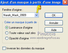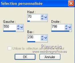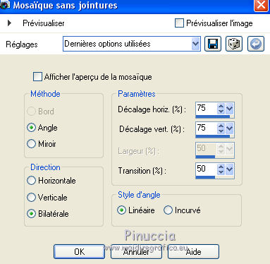Ce tutoriel a été créé avec CorelX6 et traduit avec CorelX12, mais il peut également être exécuté avec les autres versions. Suivant la version utilisée, vous pouvez obtenir des résultats différents. Depuis la version X4, la fonction Image>Miroir a été remplacée par Image>Renverser horizontalement, et Image>Renverser avec Image>Renverser verticalement. Dans les versions X5 et X6, les fonctions ont été améliorées par la mise à disposition du menu Objets. Avec la nouvelle version X7, nous avons encore Image>Miroir et Image>Renverser/Retourner, mais avec nouvelles différences. Voir les détails à ce sujet ici Certaines dénominations ont changées entre les versions de PSP. Les plus frequentes dénominations utilisées: ![]() Traduction en italien ici Vos versions ici Nécessaire pour réaliser ce tutoriel: Matériel ici Pour le matériel merci Mentali et Narah Modules Externes: consulter, si nécessaire, ma section des filtres ici Filters Unlimited 2.0 ici VM Natural - Sparkle ici Flaming Pear - Flood ici Simple - Fur 2 ici Mura's Meister - Copies ici Toadies - What are you ici FM Tile Tools - Warp, Roll image, Blend Emboss ici Filtres Toadies, Simple et VM Natural peuvent être utilisés seuls ou importés dans Filters Unlimited. voir comment le faire ici). Si un filtre est fourni avec cette icône, ![]() en fonction des couleurs utilisées, vous pouvez changer le mode mélange et l'opacité des calques. Ouvrir le masque dans PSP et le minimiser avec le reste du matériel. 1. Ouvrir une nouvelle image transparente 650 x 500 pixels. 2. Placer en avant plan la couleur claire #e92732, et en arrière plan la couleur foncée #0e0808. ![]() 3. Remplir l'image transparente avec la couleur d'arrière plan.4. Calques>Nouveau calque raster. Sélections>Sélectionner tout. 5. Ouvrir le tube mentalioriental12, Édition>Copier. ne pas fermer le tube: on va s'en servir plus tard Revenir sur votre travail et Édition>Coller dans la sélection. Sélections>Désélectionner tout. 6. Effets>Effets d'image>Mosaïque sans jointures, par défaut. ![]() 7. Réglage>Flou>Flou gaussien - rayon 25. ![]() 8. Calques>Fusionner>Fusionner le calque de dessous. 9. Effets>Modules Externes>FM Tile Tools - Roll Image. ![]() 10. Effets>Effets de bords>Accentuer davantage. 11. Sélections>Sélectionner tout. 12. Image>Ajouter des bordures, symétrique décoché, couleur d'arrière plan. ![]() 13. Effets>Effets d'image>Mosaïque sans jointures. ![]() Sélections>Désélectionner tout. 14. Effets>Effets d'image>Mosaïque sans jointures, comme précédemment. 15. Calques>Dupliquer. Effets>Modules Externes>FM Tile Tools - Warp. ![]() 16. Image>Miroir. Placer le calque en mode Lumière douce et réduire l'opacité à 50%. 17. Calques>Fusionner>Fusionner le calque de dessous. 18. Calques>Nouveau calque raster. Remplir le calque avec la couleur d'arrière plan.19. Calques>Nouveau calque de masque>A partir d'une image. Ouvrir le menu deroulant sous la fenêtre d'origine et vous verrez la liste des images ouvertes. Sélectionner le masque Narah_Mask_0909. ![]() Calques>Fusionner>Fusionner le groupe. 20. Calques>Dupliquer. Image>Miroir. Calques>Fusionner>Fusionner le calque de dessous. 21. Image>Ajouter des bordures, symétrique décoché, couleur d'arrière plan. ![]() 22. Calques>Dupliquer. Effets>Modules Externes>Simple - Centre Tile. 23. Placer le calque en mode Écran. Image>Miroir. Calques>Fusionner>Fusionner le calque de dessous. 24. Calques>Nouveau calque raster. Activer l'outil Sélection ![]() (peu importe le type de sélection, parce que avec la sélection personnalisée vous obtenez toujours un rectangle), cliquer sur Sélection personnalisée ![]() et setter ces paramètres. ![]() 25. Effets>Effets 3D>Découpe. ![]() Sélections>Désélectionner tout. 26. Calques>Dupliquer. Image>Miroir. Calques>Fusionner>Fusionner le calque de dessous. 27. Calques>Dupliquer. Effets>Effets de distorsion>Coordonnées polaires. ![]() 28. Calques>Fusionner>Fusionner le calque de dessous. 29. Calques>Dupliquer. Image>Renverser. Calques>Fusionner>Fusionner le calque de dessous. 30. Effets>Effets de distorsion>Coordonnées polaires, comme précédemment. 31. Effets>Modules Externes>Simple - 4 way average. 32. Placer le calque en mode Lumière douce. 33. Ouvrir le tube mds4663_Chinese, Édition>Copier. Revenir sur votre travail et Édition>Coller comme nouveau calque. 34. Placer le calque en mode Lumière douce et réduire l'opacité à 45%. 35. Effets>Modules Externes>FM Tile Tools - Blend Emboss, 2 fois par défaut. ![]() Sélections>Désélectionner tout. 36. Image>Ajouter des bordures, symétrique décoché, comme précédemment. ![]() 37. Sélections>Inverser. Effets>Modules Externes>VM Natural - Sparkle. ![]() Sélections>Désélectionner tout. 38. Effets>Modules Externes>Flaming Pear - Flood. ![]() 39. Calques>Dupliquer. Image>Redimensionner, à 90%, redimensionner tous les calques décoché. 40. Effets>Modules Externes>Flaming Pear - Flood, comme précédemment. Image>Miroir. 41. Vous positionner sur le calque du bas de la pile. Sélection personnalisée ![]() ![]() Sélections>Transformer la sélection en calque. 42. Effets>Effets de bords>Accentuer davantage. Sélections>Désélectionner tout. Calques>Agencer>Déplacer vers le haut. 43. Effets>Effets de réflexion>Résonance. ![]() 44. Placer le calque en mode Assombrir. 45. Ouvrir le tube ME~Olanter~DVDM, Édition>Copier. Revenir sur votre travail et Édition>Coller comme nouveau calque. 46. Effets>Modules Externes>Mura's Meister - Copies. ![]() 47. Effets>Effets 3D>Ombre portée, couleur noire. ![]() 48. Effets>Effets d'image>Décalage. ![]() 49. Ouvrir le tube deco-orientallady, Édition>Copier. Revenir sur votre travail et Édition>Coller comme nouveau calque. 50. Effets>Effets d'image>Décalage. ![]() 51. Sélections>Sélectionner tout. Image>Ajouter des bordures, symétrique décoché, couleur d'arrière plan. ![]() 52. Sélections>Inverser. Effets>Modules E