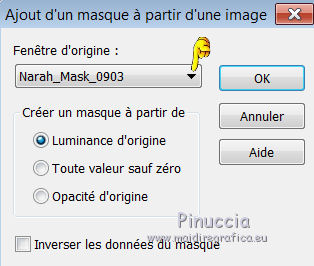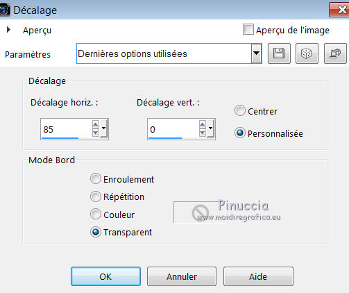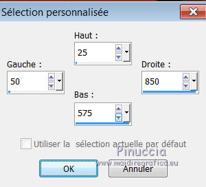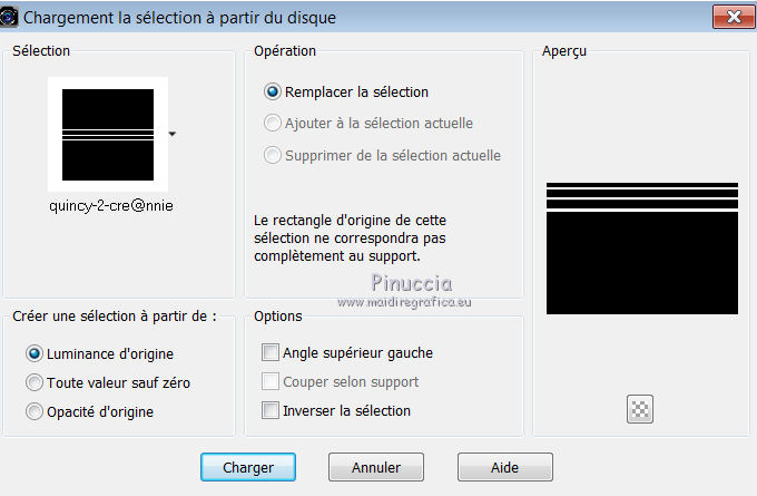 Ce tutoriel a été créé avec CorelX6 et traduit avec CorelX12, mais il peut également être exécuté avec les autres versions. Suivant la version utilisée, vous pouvez obtenir des résultats différents. Depuis la version X4, la fonction Image>Miroir a été remplacée par Image>Renverser horizontalement, et Image>Renverser avec Image>Renverser verticalement. Dans les versions X5 et X6, les fonctions ont été améliorées par la mise à disposition du menu Objets. Avec la nouvelle version X7, nous avons encore Image>Miroir et Image>Renverser/Retourner, mais avec nouvelles différences. Voir les détails à ce sujet ici Certaines dénominations ont changées entre les versions de PSP. Les plus frequentes dénominations utilisées: ![]() Traduction en italien ici Vos versions ici Nécessaire pour réaliser ce tutoriel: Matériel ici Merci: pour le tube Katjoes et pour le masque Narah Modules Externes: consulter, si nécessaire, ma section des filtres ici Filters Unlimited 2.0 ici AP Lines - Lines SilverLining ici VM Instant Art - Tripolis ici VM Distortion - Circulator II ici Mura's Meister - Perspective Tiling ici Filtres VM Instant Art et VM Distortion peuvent être utilisés seuls ou importés dans Filters Unlimited. voir comment le faire ici). Si un filtre est fourni avec cette icône, ![]() en fonction des couleurs utilisées, vous pouvez changer le mode mélange et l'opacité des calques. Placer les sélections dans le dossier Sélections. Ouvrir le masque dans PSP et le minimiser avec le reste du matériel. 1. Ouvrir une nouvelle image transparente 650 x 500 pixels. 2. Placer en avant plan la couleur claire #bd2a1d, et en arrière plan la couleur foncée #040205. ![]() 3. Remplir l'image transparente avec la couleur d'arrière plan.4. Sélections>Sélectionner tout. Ouvrir le tube Katjoes-woman-241 - Édition>Copier. ne pas fermer le tube; on va s'en servir plus tard Revenir sur votre travail et Édition>Coller dans la sélection. Sélections>Désélectionner tout. 5. Effets>Effets d'image>Mosaïque sans jointures, par défaut. ![]() 6. Réglage>Flou>Flou gaussien - rayon 20. ![]() 7. Calques>Dupliquer. 8. Effets>Modules Externes>VM Instant Art - Tripolis. ![]() 9. Effets>Effets de bords>Accentuer davantage. 10. Effets>Effets de bords>Dilater. 11. Effets>Modules Externes>VM Instant - Tripolis - changer seulement Tile Size avec 128. ![]() 12. Image>Redimensionner, à 70%, redimensionner tous les calques décoché. 13. Effets>Effets 3D>Ombre portée, couleur noire, ombre sur le nouveau calque coché. ![]() 14. Rester positionné sur le calque de l'ombre. Calques>Dupliquer. Image>Miroir. Image>Renverser. 15. Image>Ajouter des bordures, simétrique décoché, couleur d'arrière plan. ![]() 16. Calques>Dupliquer. Effets>Modules Externes>VM Distortion - Circulator II. ![]() 17. Activer l'outil Baguette magique ![]() ![]() et cliquer sur le triangle à droite pour le sélectionner. ![]() Presser CANC sur le clavier ![]() Sélections>Modifier la sélection et la zone sélectionnée deviendra rouge. ![]() Image>Miroir. À nouveau Sélections>Modifier la sélection et la zone rouger reviendra normale. ![]() 18. Édition>Couper - le commande coupe et garde en mémoire (et vous devrez garder en mémoire jusqu'à l'étape 28). Sélections>Désélectionner tout. 19. Effets>Effets d'image>Mosaïque sans jointures, comme précédemment. Calques>Fusionner>Fusionner le calque de dessous. 20. Effets>Effets d'image>Mosaïque sans jointures. ![]() 21. Sélections>Charger/Enregistrer une sélection>Charger à partir du disque. Chercher et charger la sélection quincy-1-cre@nnie. ![]() Sélections>Transformer la sélection en calque. Sélections>Désélectionner tout. 22. Effets>Effets de distorsion>Coordonnées polaires. ![]() 23. Effets>Effets 3D>Ombre portée, couleur noire, ombre sur le nouveau calque décoché. ![]() 24. Effets>Effets d'image>Décalage. ![]() 25. Calques>Dupliquer. Image>Renverser. Image>Miroir. Calques>Fusionner>Fusionner le calque de dessous. 26. Calques>Nouveau calque raster. Sélections>Charger/Enregistrer une sélection>Charger à partir du disque. Chercher et charger la sélection quincy-2-cre@nnie. ![]() Remplir la sélection avec la couleur d'arrière plan.27. Calques>Dupliquer. Image>Renverser. Calques>Fusionner>Fusionner le calque de dessous. 28. Calques>Agencer>Déplacer vers le bas. Édition>Coller comme nouveau calque (l'image coupée à l'étape 18 est en mémoire). ![]() 29. Image>Redimensionner, à 60%, redimensionner tous les calques décoché. 30. Effets>Effets d'image>Décalage. ![]() 31. Calques>Dupliquer. Image>Miroir. Réduire l'opacité de ce calque à 60%. Calques>Fusionner>Fusionner le calque de dessous. 32. Effets>Effets 3D>Ombre portée, comme précédemment. 33. Image>Ajouter des bordures, simétrique décoché, couleur d'avant plan. ![]() 34. Calques>Dupliquer. Effets>Effets d'image>Coordonnées polaires. ![]() 35. Activer l'outil Sélection ![]() (peu importe le type de sélection, parce que avec la sélection personnalisée vous obtenez toujours un rectangle), cliquer sur Sélection personnalisée ![]() et setter ces paramètres. ![]() Presser CANC sur le clavier. Sélections>Désélectionner tout. 36. Image>Ajouter des bordures, 25 pixels, simétrique, couleur d'arrière plan. 37. Effets>Effets d'image>Mosaïque sans jointures. ![]() 38. Activer le tube deco-quincy-1 - Édition>Copier. Revenir sur votre travail et Édition>Coller comme nouveau calque. Ne pas déplacer. 39. Calques>Nouveau calque raster. Sélections>Charger/Enregistrer une sélection>Charger à partir du disque. Chercher et charger la sélection quincy-3-cre@nnie. ![]() Remplir la sélection avec la couleur d'arrière plan.Sélections>Désélectionner tout. 40. Activer le tube deco-quincy-2 - Édition>Copier. Revenir sur votre travail et Édition>Coller comme nouveau calque. Ne pas déplacer. 41. Calques>Fusionner>Fusionner le calque de dessous - 2 fois. 42. Calques>Dupliquer. Ef