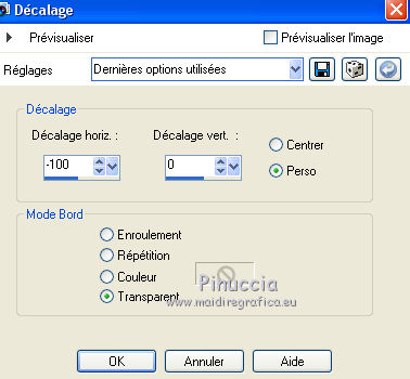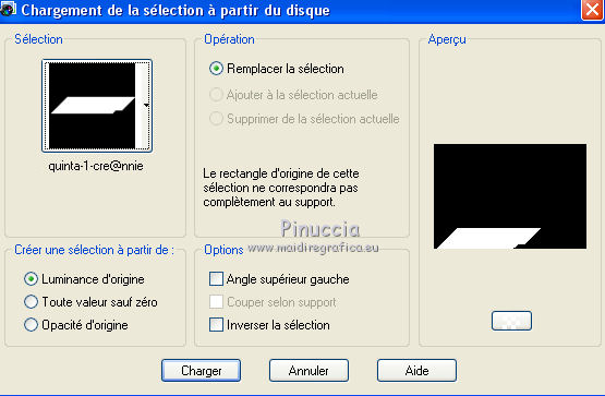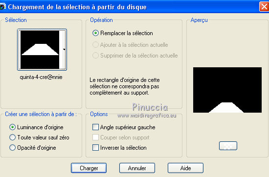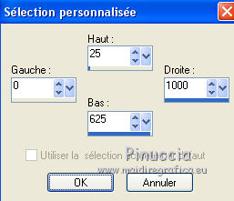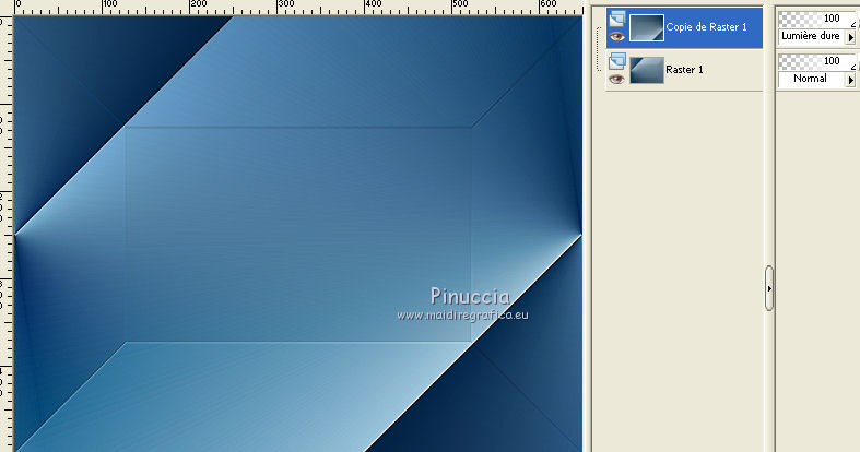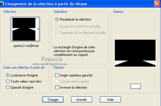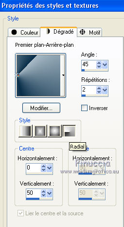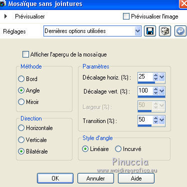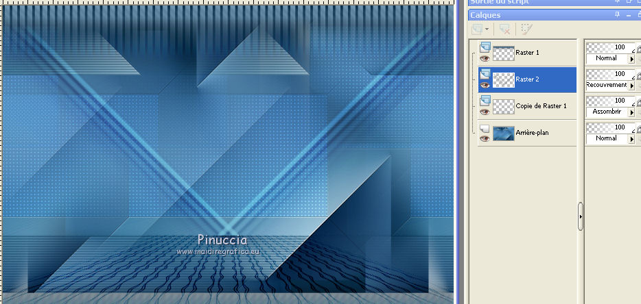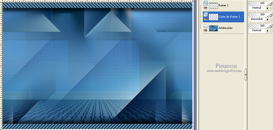 Ce tutoriel a été créé avec CorelX6 et traduit avec CorelX12, mais il peut également être exécuté avec les autres versions. Suivant la version utilisée, vous pouvez obtenir des résultats différents. Depuis la version X4, la fonction Image>Miroir a été remplacée par Image>Renverser horizontalement, et Image>Renverser avec Image>Renverser verticalement. Dans les versions X5 et X6, les fonctions ont été améliorées par la mise à disposition du menu Objets. Avec la nouvelle version X7, nous avons encore Image>Miroir et Image>Renverser/Retourner, mais avec nouvelles différences. Voir les détails à ce sujet ici Certaines dénominations ont changées entre les versions de PSP. Les plus frequentes dénominations utilisées: ![]() Traduction en italien ici Vos versions ici Nécessaire pour réaliser ce tutoriel: Matériel ici Pour le tube merci Min@ Modules Externes: consulter, si nécessaire, ma section des filtres ici Filters Unlimited 2.0 ici Render - Buttonmaker square (à importer dans Unlimited) ici Penta.com - Jeans ici AAA Frames - Foto Frame ici Mura's Meister - Perspective Tiling ici Filtres Penta.com peuvent être utilisés seuls ou importés dans Filters Unlimited. voir comment le faire ici). Si un filtre est fourni avec cette icône, ![]() en fonction des couleurs utilisées, vous pouvez changer le mode mélange et l'opacité des calques. Dans les plus récentes versions de PSP, vous ne trouvez pas le dégradé d'avant plan/arrière plan ou Corel_06_029. Vous pouvez utiliser le dégradé des versions antérieures. Ici le dossier Dégradés de CorelX. Placer les sélections dans le dossier Sélections. 1. Ouvrir une nouvelle image transparente 650 x 500 pixels. 2. Placer en avant plan la couleur claire #a9bbc7, et en arrière plan la couleur foncée #092e49. ![]() 3. Préparer en avant plan un dégradé de premier plan/arrière plan, style Radial. ![]() Remplir l'image transparente du dégradé.4. Effets>Modules Externes>Filters Unlimited 2.0 - Render - Buttonmaker square. ![]() 5. Effets>Effets de bords>Accentuer davantage. 6. Calques>Dupliquer. Image>Miroir. Image>Renverser. Placer le calque en mode Lumière dure. ![]() 7. Image>Ajouter des bordures, symétrique décoché, couleur d'arrière plan. ![]() 8. Effets>Effets d'image>Mosaïque sans jointures. ![]() 9. Activer l'outil Sélection ![]() (peu importe le type de sélection, parce que avec la sélection personnalisée vous obtenez toujours un rectangle), cliquer sur Sélection personnalisée ![]() et setter ces paramètres. ![]() 10. Calques>Nouveau calque raster. Remplir la sélection avec la couleur d'arrière plan.11. Effets>Effets de texture>Textile. Couleur du tissage: couleur d'arrière plan - couleur des interstices: couleur d'avant plan. ![]() Sélections>Désélectionner tout. 12. Effets>Effets d'image>Mosaïque sans jointures, comme précédemment. Placer le calque en mode Éclaircir et réduire l'opacité à 50%. ![]() 13. Vous positionner sur le calque du bas de la pile. Sélections>Charger/Enregistrer une sélection>Charger à partir du disque. Chercher et charger la sélection quinta-1-cre@nnie. ![]() 14. Effets>Effets de textures>Stores, couleur d'arrière plan. ![]() Sélections>Transformer la sélection en calque. Sélections>Désélectionner tout. 15. Effets>Effets d'image>Mosaïque sans jointures, comme précédemment. Image>Renverser. Calques>Agencer>Placer en haut de la pile. 16. Image>Ajouter des bordures, symétrique décoché, couleur d'avant plan. ![]() 17. Effets>Effets d'image>Mosaïque sans jointures. ![]() 18. Sélection personnalisée ![]() ![]() 19. Calques>Nouveau calque raster. Remplir la sélection avec la couleur d'arrière plan.20. Effets>Modules Externes>Penta.com - Jeans. ![]() Effets>Effets de bords>Eroder. Sélections>Désélectionner tout. 21. Effets>Effets 3DOmbre portée, couleur noire. ![]() 22. Calques>Dupliquer. Image>Renverser. Calques>Fusionner>Fusionner le calque de dessous. 23. Calques>Dupliquer. Image>Redimensionner, à 80%, redimensionner tous les calques décoché. 24. Effets>Effets de distorsion>Vagues. ![]() 25. Calques>Dupliquer. Image>Miroir. Calques>Fusionner>Fusionner le calque de dessous. 26. Image>Rotation libre - 90 degrés à droite. ![]() 27. Effets>Effets de distorsion>Miroir déformant. ![]() Calques>Agencer>Déplacer vers le bas. 28. Effets>Modules Externes>Mura's Meister - Perspective Tiling. ![]() Placer le calque en mode Assombrir. ![]() 29. Sélections>Charger/Enregistrer une sélection>Charger à partir du disque. Chercher et charger la sélection quinta-2-cre@nnie. ![]() Presser CANC sur le clavier - on doit cliquer plusieurs fois.Sélections>Désélectionner tout 30. Vous positionner sur le calque du haut de la pile. Image>Rotation à droite. 31. Effets>Effets de distorsion>Vent - vers la gauche, intensité 100. ![]() 32. Image>Rotation à gauche. 33. Calques>Nouveau calque raster. Sélections>Charger/Enregistrer une sélection>Charger à partir du disque. Chercher et charger la sélection quinta-3-cre@nnie. ![]() 34. À nouveau placer en avant plan la Couleur du début, et remplir la sélection avec la couleur d'avant plan.Sélections>Désélectionner tout. 35. Effets>Effets géométriques>Inclinaison. ![]() 36. Effets>Effets d'image>Décalage. ![]() 37. Calques>Dupliquer. Image>Miroir. Calques>Fusionner>Fusionner le calque de dessous. 38. Sélections>Charger/Enregistrer une sélection>Charger à partir du disque. Chercher et charger la sélection quinta-4-cre@nnie. ![]() Presser CANC sur le clavier. Sélections>Désélectionner tout. Calques>Agencer>Déplacer vers le bas. 39. Effets>Effets 3DOmbre portée, comme précédemment. Placer le calque en mode Recouvrement. ![]() 40. Effets>Effets d'image>Mosaïque sans jointures. ![]() 41. Calques>Dupliquer. Image>Renverser. 42. Image>Ajouter des bordures, comme précédemment. ![]() 43. Effets>Effets d'image>Mosaïque sans jointures. ![]() 44. Calques>Nouveau calque raster. Sélections>Ch