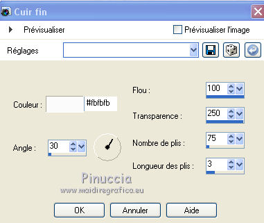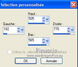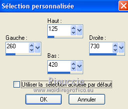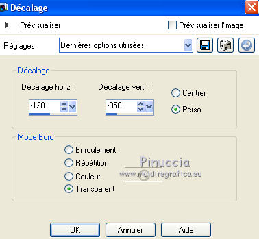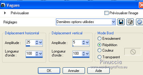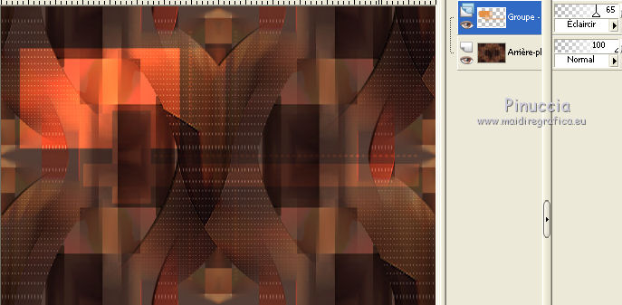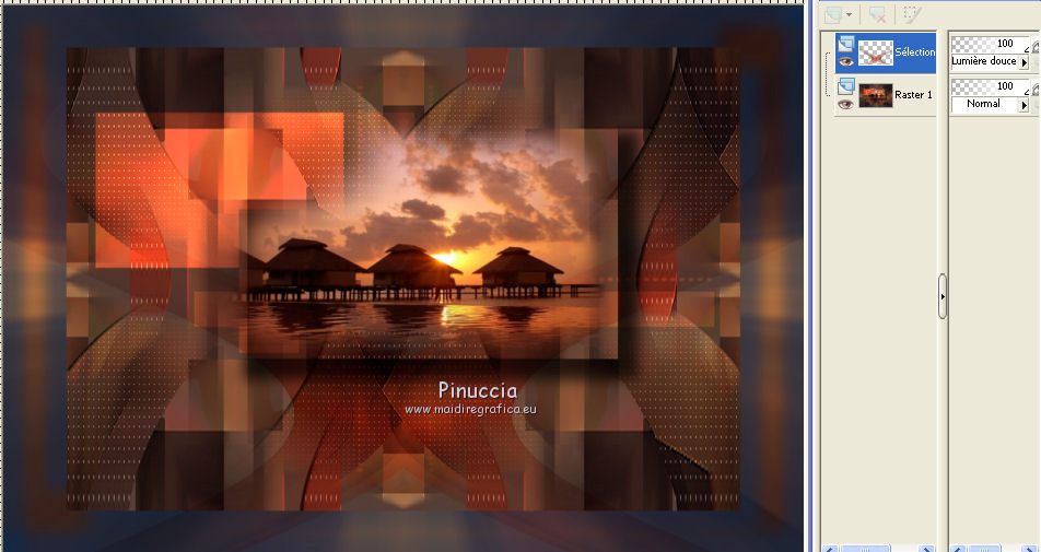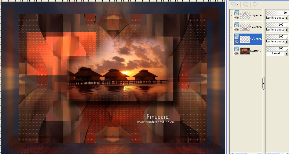 J'ai traduit ce tutoriel avec CorelX12, mais il peut également être exécuté avec les autres versions. Suivant la version utilisée, vous pouvez obtenir des résultats différents. Depuis la version X4, la fonction Image>Miroir a été remplacée par Image>Renverser horizontalement, et Image>Renverser avec Image>Renverser verticalement . Dans les versions X5 et X6, les fonctions ont été améliorées par la mise à disposition du menu Objets. Avec la nouvelle version X7, nous avons à nouveau Miroir/Retourner, mais avec nouvelles différences. Consulter, si vouz voulez, mes notes ici Certaines dénominations ont changées entre les versions de PSP. Les plus frequentes dénominations utilisées: ![]() Traduction en italien ici Vos versions ici Nécessaire pour réaliser ce tutoriel: Matériel ici Pour le masque et les tubes merci Nara, Mds e Cameron. Garder le nom du tube. Le © appartient à l'artiste original. Garder le crédit de ceux qui ont créé le tube. Modules Externes: consulter, si nécessaire, ma section des filtres ici Filters Unlimited 2.0 ici Carolaine and Sensibility CS-LDots ici Mehdi - Sorting Tiles, Weaver ici Mura's Meister - Copies ici Simple - Pizza Slice Mirror ici Toadies - What are you ici VM Extravaganza - Transmission ici Filtres Simple, Toadies et VM Extravaganza peuvent être utilisés seuls ou importés dans Filters Unlimited. voir comment le faire ici). Si un filtre est fourni avec cette icône, ![]() Si vous voulez utiliser vos propres couleurs, n'hésitez pas à changer le mode et l'opacité des calques Placer les sélections dans le dossier Sélections. Ouvrir le masque dans Psp et le minimiser avec le reste du matériel. 1. Ouvrir une nouvelle image transparente 650 x 500 pixels. 2. Placer en avant plan la couleur claire #e59147, et en arrière plan la couleur foncée #553e36. ![]() 3. Remplir l'image transparente avec la couleur d'arrière plan.4. Sélections>Sélectionner tout. Activer le tube TubeNP 1411, Édition>Copier. ne pas fermer le tube; on va s'en servir plus tard Revenir sur votre travail et Édition>Coller dans la sélection. Sélections>Désélectionner tout. 5. Effets>Effets d'image>Mosaïque sans jointures, par défaut. ![]() 6. Réglage>Flou>Flour radial. ![]() 7. Calques>Dupliquer. Image>Miroir. 8. Placer le calque en mode Lumière douce et réduire l'opacité à 50%. Calques>Fusionner>Fusionner le calque de dessous. 9. Effets>Modules Externes>Mehdi - Sorting Tiles. ![]() Effets>Effets de bords>Accentuer. 10. Sélection>Charger/Enregistrer une sélection>Charger à partir du disque. Charger à nouveau la sélection rafiya-1-cre@nnie. ![]() Sélections>Transformer la sélection en calque. 11. Effets>Modules Externes>Mehdi - Sorting Tiles. ![]() Sélections>Désélectionner tout. 12. Effets>Modules Externes>Simple - Pizza slice mirror. 13. Sélection>Charger/Enregistrer une sélection>Charger à partir du disque. Charger à nouveau la sélection rafiya-2-cre@nnie. ![]() Presser CANC sur le clavier ![]() Sélections>Désélectionner tout. 14. Effets>Effets 3D>Ombre portée, couleur noire. ![]() 15. Vous positionner sur le calque du bas de la pile. Effets>Modules Externes>Carolaine and Sensibility - CS-LDots. ![]() 16. Image>Ajouter des bordures, symétrique décoché, couleur d'arrière plan. ![]() 17. Effets>Effets géométriques>Cylindre horizontal. ![]() 18. Effets>Effets d'image>Mosaïque sans jointures, comme précédemment. 19. Calques>Nouveau calque raster. Remplir avec la couleur d'avant plan.20. Calques>Nouveau calque de masque>A partir d'une image. Ouvrir le menu deroulant sous la fenêtre d'origine et vous verrez la liste des images ouverts. Charger le masque maskcameron_plate1. ![]() Calques>Fusionner>Fusionner le groupe. 21. Placer le calque en mode Éclaircir et réduire l'opacité à 65%. ![]() 22. Sélections>Sélectionner tout. Image>Ajouter des bordures, symétrique décoché, couleur d'avant plan. ![]() 23. Effets>Effets d'image>Mosaïque sans jointures, comme précédemment. 24. Sélections>Inverser. Réglage>Flou>Flou radial, comme précédemment. 25. Effets>Effets 3D>Découpe. ![]() Répéter Découpe, mais avec vertical et horizontal à -25. 26. Activer l'outil Sélection ![]() (peu importe le type de sélection, parce que avec la sélection personnalisée vous obtenez toujours un rectangle), cliquer sur Sélection personnalisée ![]() et setter ces paramètres. ![]() 27. Activer le tube mds10076_island, Édition>Copier. Revenir sur votre travail et Édition>Coller dans la sélection. 28. Effets>Effets 3D>Ombre portée, couleur noire. ![]() 29. Sélection personnalisée ![]() ![]() Sélections>Transformer la sélection en calque. Sélections>Désélectionner tout. 30. Effets>Effets d'image>Décalage. ![]() 31. Effets>Modules Externes>Mehdi - Weaver. ![]() 32. Effets>Effets de distorsion>Vagues. ![]() 33. Calques>Dupliquer. Image>Miroir. Calques>Fusionner>Fusionner le calque de dessous. Placer le calque en mode Lumière douce. ![]() 34. Calques>Dupliquer. Image>Renverser. 35. Effets>Effets géométriques>Cylindre horizontal, comme précédemment. 36. Effets>Effets géométriques>Cercle. ![]() Réduire l'opacité de ce calque à 50%. Effets>Effets de bords>Accentuer davantage. 37. Vous positionner sur le calque du bas de la pile. 38. Sélection personnalisée , comme précédemment.![]() Sélections>Transformer la sélection en calque. Sélections>Désélectionner tout. 39. Effets>Effets géométriques>Inclinaison. ![]() 40. Effets>Effets d'image>Décalage. ![]() 41. Calques>Dupliquer. Image>Miroir. Calques>Fusionner>Fusionner le calque de dessous. 42. Effets>Modules Externes>Toadies - What are you. ![]() 43. Effets>Effets de bords>Accentuer davantage. 44. Effets>Effets géométriques>Cylindre horizontal, comme précédemment. 45. Effets>Modules Externes>Mura's Meister - Copies. ![]() Placer le calque en mode Lumière douce. ![]() 46. Calques>Nouveau calque raster. Calques>Agencer>Placer en haut de la pile. 47. Sé