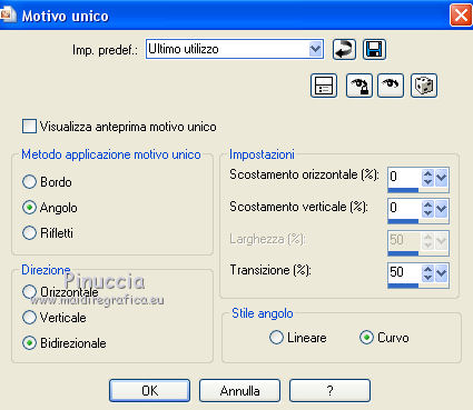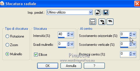 qui puoi trovare qualche risposta ai tuoi dubbi. Se l'argomento che ti interessa non è presente, ti prego di segnalarmelo. Questo tutorial è stato creato con PSP X2 e tradotto con PSP X, ma può essere eseguito anche con le altre versioni di PSP. Dalla versione X4, il comando Immagine>Rifletti è stato sostituito con Immagine>Capovolgi in orizzontale, e il comando Immagine>Capovolgi con Immagine>Capovolgi in verticale. Nelle versioni X5 e X6, le funzioni sono state migliorate rendendo disponibile il menu Oggetti. Con la versione X7 sono tornati i comandi Immagine>Rifletti e Immagine>Capovolgi, ma con nuove funzioni. Vedi la scheda sull'argomento qui Le vostre versioni qui Occorrente: Materiale qui ![]() se stai usando altri colori, sperimenta le modalità di miscelatura e opacità più adatte ai tuoi colori 1. Imposta il colore di primo piano con il colore chiaro #f68600, e il colore di sfondo con il colore scuro #020000. ![]() 2. Apri una nuova immagine trasparente 650 x 450 pixels, e riempila con il colore di sfondo.3. Apri il tube Hw-SpookyNights-tracie04-top header e vai a Modifica>Copia. non chiuderlo perchè ti servirà ancora. Torna al tuo lavoro e vai a Modifica>Incolla come nuovo livello. 4. Effetti>Effetti di immagine>Motivo unico. ![]() 5. Regola>Sfocatura>Sfocatura radiale. ![]() 6. Apri il tube halloween_witch e vai a Modifica>Copia. Torna al tuo lavoro e vai a Modifica>incolla come nuovo livello. Spostalo un po' più in alto.7. Livelli>Unisci>Unisci visibile. 8. Immagine>Ridimensiona, al 70%, tutti i livelli non selezionato. Sposta l'immagine un po' più in basso.9. Apri il tube BDR Scarecow_vsc e vai a Modifica>Copia. Torna al tuo lavoro e vai a Modifica>Incolla come nuovo livello. Immagine>Ridimensiona, al 60%, tutti i livelli non selezionato. 10. Effetti>Effetti 3D>Sfalsa ombra. ![]() Spostalo a sinistra.![]() 11. Apri il tube CornerBatWeb_Nicole e vai a Modifica>Copia. Torna al tuo lavoro e vai a Modifica>Incolla come nuovo livello. Immagine>Ridimensiona, al 60%, tutti i livelli non selezionato. Immagine>Rifletti. Spostalo in alto a destra.12. Attiva lo strumento Gomma ![]() ![]() e cancella la parte del tube sopra lo spaventapasseri. ![]() Regola>Messa a fuoco>Accentua messa a fuoco. 13. Attiva nuovamente il tube Hw-SpookyNights-etc.... e vai a Modifica>Copia. Torna al tuo lavoro e vai a Modifica>Incolla come nuovo livello. Immagine>Ridimensiona, al 70%, tutti i livelli non selezionato. Spostalo in basso, come nel mio esempio.14. Effetti>Effetti 3D>Sfalsa ombra, con i settaggi precedenti. 15. Apri il tube halloCornGar2Shea e vai a Modifica>Copia. Torna al tuo lavoro e vai a Modifica>Incolla come nuovo livello. Spostalo a destra, come nel mio esempio.16. Effetti>Effetti 3D>Sfalsa ombra, con i settaggi precedenti. 17. Aggiungi il tuo nome e/o il tuo watermark su un nuovo livello (non posizionarlo a destra). 18. Livelli>Unisci>Unisci visibile, e salva in formato png per conservare la trasparenza dello sfondo. ![]() Se hai problemi o dubbi, o trovi un link non funzionante, o anche soltanto per un saluto, scrivimi. 15 Ottobre 2013 |