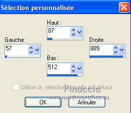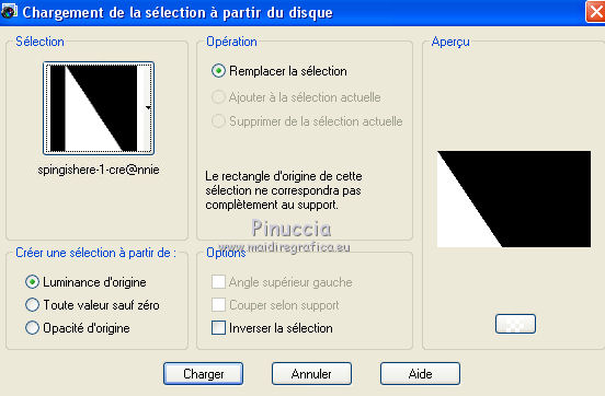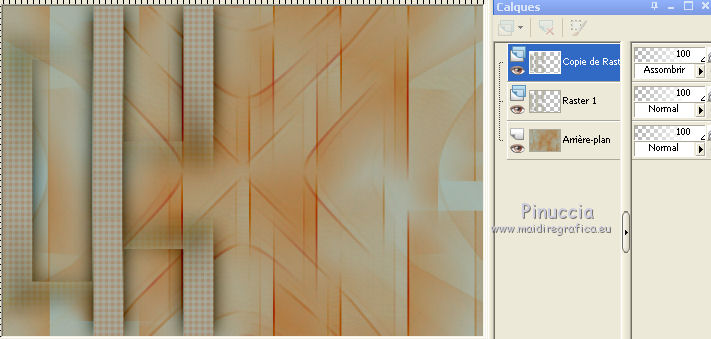 Ce tutoriel a été créé avec CorelX6 et traduit avec CorelX12, mais il peut également être exécuté avec les autres versions. Suivant la version utilisée, vous pouvez obtenir des résultats différents. Depuis la version X4, la fonction Image>Miroir a été remplacée par Image>Renverser horizontalement, et Image>Renverser avec Image>Renverser verticalement. Dans les versions X5 et X6, les fonctions ont été améliorées par la mise à disposition du menu Objets. Avec la nouvelle version X7, nous avons encore Image>Miroir et Image>Renverser/Retourner, mais avec nouvelles différences. Voir les détails à ce sujet ici Certaines dénominations ont changées entre les versions de PSP. Les plus frequentes dénominations utilisées: ![]() Traduction en italien ici Vos versions ici Nécessaire pour réaliser ce tutoriel: Matériel ici Pour les tubes merci Shanna Garder le nom du tube. Le © appartient à l'artiste original. Garder le crédit de ceux qui ont créé le tube. Modules Externes: consulter, si nécessaire, ma section des filtres ici Filters Unlimited 2.0 ici Simple - Pizza Slice Mirror ici DSB Flux - Linear Transmission, Center Mirror ici Mura's Meister - Perspective Tiling ici Filtres Simple peuvent être utilisés seuls ou importés dans Filters Unlimited. voir comment le faire ici). Si un filtre est fourni avec cette icône, ![]() en fonction des couleurs utilisées, vous pouvez changer le mode mélange et l'opacité des calques. Placer les sélections dans le dossier Sélections. 1. Ouvrir une nouvelle image transparente 650 x 500 pixels. 2. Placer en avant plan la couleur claire #bcccc7, et en arrière plan la couleur foncée #c29057. ![]() 3. Préparer un dégradé de premier plan/arrière plan, style Halo. ![]() 4. Remplir l'image transparente du dégradé.5. Effets>Modules Externes>DSB Flux - Linear Transmission. ![]() Effets>Effets de bords>Accentuer davantage. 6. Calques>Dupliquer. Image>Miroir. Placer le calque en mode Lumière douce et réduire l'opacité à 50%. 7. Calques>Fusionner>Fusionner le calque de dessous. Effets>Effets de bords>Eroder. 8. Image>Ajouter des bordures, symétrique décoché, couleur d'avant plan. ![]() 9. Effets>Effets d'image>Mosaïque sans jointures. ![]() 10. Calques>Dupliquer. Effets>Modules Externes>DSB Flux - Center Mirror. ![]() 11. Placer le calque en mode Multiplier et réduire l'opacité à 50%. ![]() 12. Effets>Effets de bords>Eroder. Calques>Fusionner>Fusionner le calque de dessous. 13. Placer en avant plan la couleur du début. ![]() Calques>Nouveau calque raster. Activer l'outil Sélection ![]() (peu importe le type de sélection, parce que avec la sélection personnalisée vous obtenez toujours un rectangle), cliquer sur Sélection personnalisée ![]() et setter ces paramètres. ![]() Remplir la sélection avec le couleur d'avant plan.14. Sélections>Modifier>Contracter - 50 pixels. Presser CANC sur le clavier ![]() Sélections>Désélectionner tout. 15. Effets>Effets d'image>Mosaïque sans jointures, comme précédemment. 16. Effets>Effets d'image>Décalage. ![]() 17. Effets>Effets de textures>Textile. Couleur du tissage: couleur d'avant plan - Couleur des interstices: couleur d'arrière plan. ![]() 18. Effets>Effets 3D>Ombre portée, couleur noire. ![]() 19. Calques>Dupliquer. Placer le calque en mode Assombrir. ![]() Calques>Fusionner>Fusionner le calque de dessous. 20. Effets>Modules Externes>Simple - Pizza Slice Mirror. 21. Placer le calque en mode Lumière douce. ![]() Réglage>Netteté>Netteté. 22. Image>Ajouter des bordures, symétrique décoché, comme précédemment. ![]() 23. Image>Miroir. Effets>Effets d'image>Mosaïque sans jointures, comme précédemment. 24. Calques>Nouveau calque raster. Sélections>Charger/Enregistrer une sélection>Charger à partir du disque. Chercher et charger la sélection springishere-1-cre@nnie. ![]() 25. Effets>Effets 3D>Ombre portée, couleur noire. ![]() Sélections>Désélectionner tout. 26. Calques>Dupliquer. Image>Miroir. Image>Renverser. Calques>Fusionner>Fusionner le calque de dessous. 27. Calques>Dupliquer. Image>Miroir. Calques>Fusionner>Fusionner le calque de dessous. 28. Sélections personnalisée ![]() ![]() Presser CANC sur le clavier ![]() Garder sélectionné. 29. Calques>Nouveau calque raster. Effets>Effets 3D>Ombre portée, comme précédemment. Sélections>Désélectionner tout. 30. Calques>Dupliquer. Image>Renverser. Calques>Fusionner>Fusionner le calque de dessous. 31. Effets>Effets de distorsion>Vagues. ![]() 32. Placer le calque en mode Recouvrement. ![]() 33. Calques>Nouveau calque raster. Sélections>Charger/Enregistrer une sélection>Charger à partir du disque. Chercher et charger la sélection springishere-2-cre@nnie. ![]() 34. Activer l'image de fond "spring", Édition>Copier. Revenir sur votre travail et Édition>Coller dans la sélection. Réduire l'opacité de ce calque à 40%. ![]() 35. Sélections>Sélectionner tout. Image>Ajouter des bordures, 25 pixels, symétrique, couleur d'arrière plan. Image>Ajouter des bordures, 25 pixels, symétrique, couleur d'avant plan. 36. Effets>Effets d'image>Mosaïque sans jointures, comme précédemment. Effets>Effets 3D>Ombre portée, comme précédemment. 37. Sélections>Sélectionner tout. Édition>Copier. 38. Image>Ajouter des bordures, symétrique décoché, couleur d'avant plan. ![]() 39. Sélections>Inverser. Édition>Coller dans la sélection. 40. Effets>Effets 3D>Ombre portée, couleur noire. ![]() Sélections>Désélectionner tout. 41. Calques>Dupliquer. Effets>Modules Externes>Mura's Meister - Perspective Tiling. ![]() 42. Effets>Effets 3D>Ombre portée, comme précédemment. 43. Activer le cadre spring is here!. Fenêtre>Dupliquer, ou sur le clavier shift+D pour faire une copie. Fermer l'original. Sur la copie: activer l'outil Sélection au lasso ou Sélection ![]() et sélectionner le watermark ![]() Presser CANC sur le clavier. Sélections>Désélectionner tout. 44. Activer à nouveau l'image de fond S