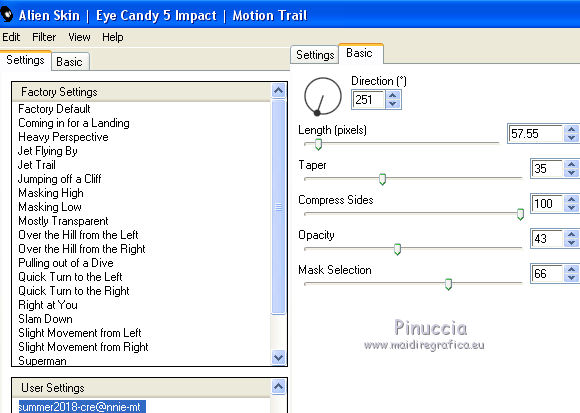 Effetti>Plugins>Alien Skin Eye Candy 5 Impact - Motion Trail, con i settaggi precedenti.