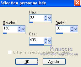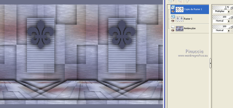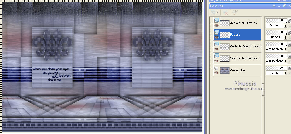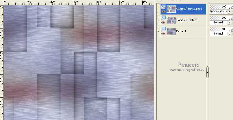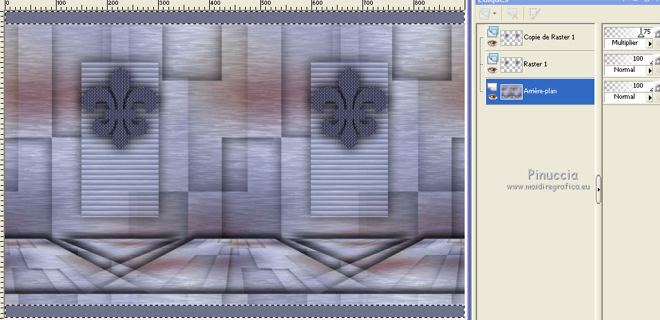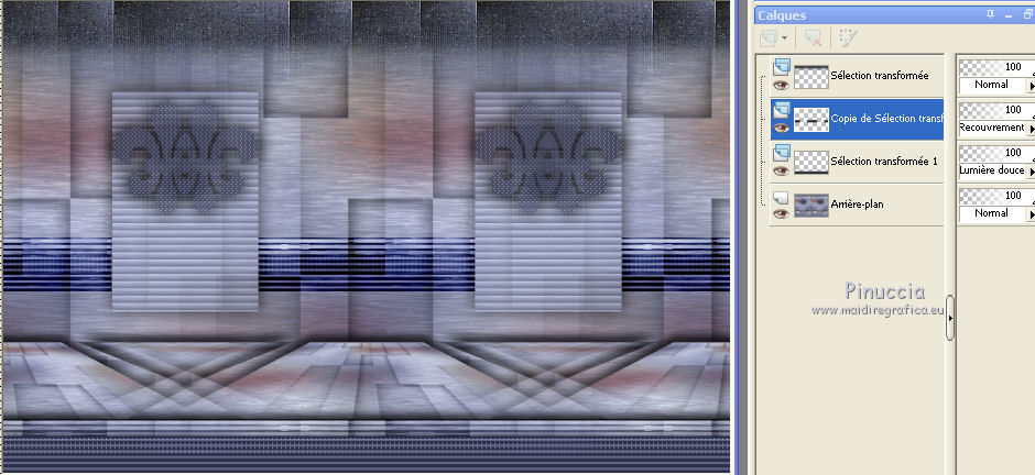 Ce tutoriel a été créé avec CorelX6 et traduit avec CorelX12, mais il peut également être exécuté avec les autres versions. Suivant la version utilisée, vous pouvez obtenir des résultats différents. Depuis la version X4, la fonction Image>Miroir a été remplacée par Image>Renverser horizontalement, et Image>Renverser avec Image>Renverser verticalement. Dans les versions X5 et X6, les fonctions ont été améliorées par la mise à disposition du menu Objets. Avec la nouvelle version X7, nous avons encore Image>Miroir et Image>Renverser/Retourner, mais avec nouvelles différences. Voir les détails à ce sujet ici Certaines dénominations ont changées entre les versions de PSP. Les plus frequentes dénominations utilisées: ![]() Traduction en italien ici Vos versions ici Nécessaire pour réaliser ce tutoriel: Matériel ici Merci pour le tube Syl Modules Externes: consulter, si nécessaire, ma section des filtres ici Filters Unlimited 2.0 ici Carolaine and Sensibility - CS-LDots ici VM Experimental ici Mura's Meister - Perspective Tiling ici Filtres VM Experimental peuvent être utilisés seuls ou importés dans Filters Unlimited. voir comment le faire ici). Si un filtre est fourni avec cette icône, ![]() en fonction des couleurs utilisées, vous pouvez changer le mode mélange et l'opacité des calques. Placer les sélections dans le dossier Sélections. 1. Ouvrir une nouvelle image transparente 650 x 500 pixels. 2. Placer en avant plan la couleur claire #e6edfe, et en arrière plan la couleur foncée #6d718a. ![]() 3. Remplir l'image transparente avec la couleur d'avant plan.4. Sélections>Sélectionner tout. Activer le tube SvB(929)Beauty, effacer le watermark, Édition>Copier. ne pas fermer le tube; on va s'en servir plus tard Revenir sur votre travail et Édition>Coller dans la sélection. Sélections>Désélectionner tout. 5. Effets>Effets d'image>Mosaïque sans jointures, par défaut. ![]() 6. Réglage>Flou>Flou gaussien - rayon 25. ![]() 7. Calques>Dupliquer. Effets>Modules Externes>VM Experimental - Needles and pins. ![]() 8. Calques>Fusionner>Fusionner le calque de dessous. 9. Calques>Dupliquer. Effets>Modules Externes>VM Experimental - Guess what? ![]() 10. Effets>Effets 3D>Ombre portée, couleur noire. ![]() 11. Calques>Dupliquer. Image>Miroir. Image>Renverser. Placer le calque en mode Lumière douce. ![]() 12. Calques>Fusionner>Calques visibles. 13. Édition>Copier. 14. Image>Ajouter des bordures, symétrique décoché, couleur d'arrière plan. ![]() 15. Effets>Modules Externes>Mura's Meister - Perspective Tiling. ![]() 16. Activer l'outil Sélection ![]() (peu importe le type de sélection, parce que avec la sélection personnalisée vous obtenez toujours un rectangle), cliquer sur Sélection personnalisée ![]() et setter ces paramètres. ![]() Presser CANC sur le clavier ![]() 17. Activer l'outil Baguette magique ![]() ![]() cliquer sur la couleur unie pour la sélectionner. ![]() 18. Édition>Coller dans la sélection. 19. Effets>Effets 3D>Ombre portée, couleur noire. ![]() 20. Sélections>Inverser. Effets>Effets 3D>Ombre portée, comme précédemment. Sélections>Désélectionner tout. 21. Image>Ajouter des bordures, symétrique décoché, couleur d'arrière plan. ![]() 22. Effets>Effets d'image>Mosaïque sans jointures. ![]() 23. Sélection personnalisée ![]() ![]() Remplir la sélection avec la couleur d'avant plan.Réduire l'opacité de ce calque à 50%. 24. Effets>Effets de textures>Stores, couleur d'arrière plan. ![]() 25. Effets>Effets 3D>Ombre portée, couleur noire. ![]() Sélections>Désélectionner tout. 26. Calques>Dupliquer. Image>Miroir. Calques>Fusionner>Fusionner le calque de dessous. 27. Calques>Nouveau calque raster. Sélections>Charger/Enregistrer une sélection>Charger à partir du disque. Chercher et charger la sélection syl-1-cre@nnie. ![]() Remplir la sélection avec la couleur d'arrière plan.28. Effets>Modules Externes>Carolaine and Sensibility - CS-LDots. ![]() 29. Effets>Effets 3D>Ombre portée, comme précédemment. Sélections>Désélectionner tout. 30. Effets>Modules Externes>Carolaine and Sensibility - CS-LDots, comme précédemment. 31. Calques>Fusionner>Fusionner le calque de dessous. 32. Calques>Dupliquer. Placer le calque en mode Multiplier et réduire l'opacité à 75%. ![]() 33. Vous positionner sur le calque du bas de la pile. Activer l'outil Baguette magique ![]() et cliquer sur le bords en haut et en bas pour les sélectionner. ![]() 34. Effets>Modules Externes>Carolaine and Sensibility - CS-LDots, comme précédemment. Effets>Effets 3D>Ombre portée, comme précédemment. Sélections>Désélectionner tout. 35. Image>Ajouter des bordures, symétrique décoché, couleur d'arrière plan. ![]() 36. Effets>Effets d'image>Mosaïque sans jointures, comme précédemment. 37. Sélection personnalisée ![]() ![]() Sélections>Transformer la sélection en calque. 38. Effets>Modules Externes>VM Experimental - Needles and pins. ![]() Sélections>Désélectionner tout. 39. Image>Rotation à droite. 40. Effets>Effets de distorsion>Vent - vers la gauche, intensité 100. ![]() 41. Image>Rotation à gauche. 42. Effets>Effets d'image>Mosaïque sans jointures, comme précédemment. Effets>Effets de bords>Accentuer davantage. 43. Réglage>Ajouter/Supprimer du bruit>Ajouter du bruit. ![]() 44. Vous positionner sur le calque du bas de la pile. Sélection personnalisée ![]() ![]() Sélections>Transformer la sélection en calque. 45. Effets>Modules Externes>VM Experimental - Teewee. ![]() 46. Placer le calque en mode Lumière douce. ![]() Sélections>Désélectionner tout. 47. Calques>Dupliquer. Effets>Effets d'image>Décalage. ![]() 48. Sélections>Charger/Enregistrer une sélection>Charger à partir du disque. Chercher et charger la sélection syl-2-cre@nnie. ![]() Presser CANC sur le clavier .Sélections>Désélectionner tout. 49. Placer le calque en mode Recouvrement. ![]() 50. Activer le tube 21245. Activer l'outil Sélection ![](