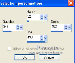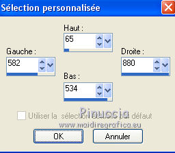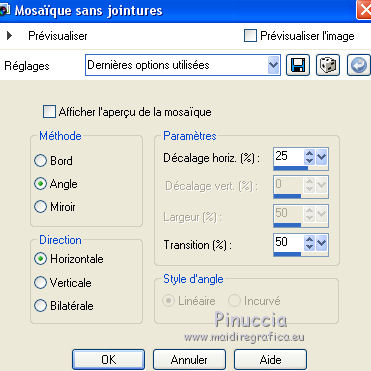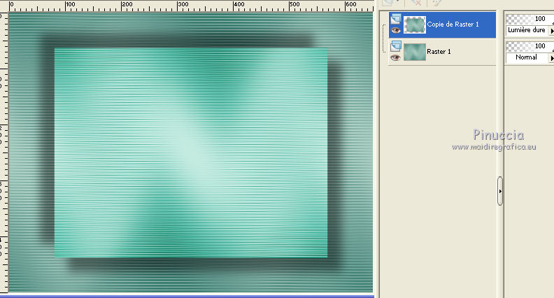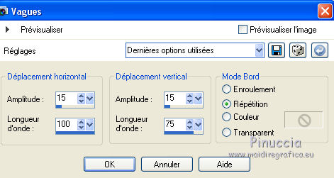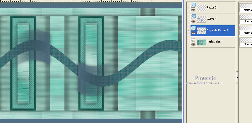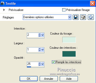 Ce tutoriel a été créé avec CorelX6 et traduit avec CorelX12, mais il peut également être exécuté avec les autres versions. Suivant la version utilisée, vous pouvez obtenir des résultats différents. Depuis la version X4, la fonction Image>Miroir a été remplacée par Image>Renverser horizontalement, et Image>Renverser avec Image>Renverser verticalement. Dans les versions X5 et X6, les fonctions ont été améliorées par la mise à disposition du menu Objets. Avec la nouvelle version X7, nous avons encore Image>Miroir et Image>Renverser/Retourner, mais avec nouvelles différences. Voir les détails à ce sujet ici Certaines dénominations ont changées entre les versions de PSP. Les plus frequentes dénominations utilisées: ![]() Traduction en italien ici Vos versions ici Nécessaire pour réaliser ce tutoriel: Matériel ici Pour le tube merci Luz Cristina Modules Externes: consulter, si nécessaire, ma section des filtres ici Filters Unlimited 2.0 ici Alien Skin Eye Candy 5 Impact - Glass ici L&K's - L&K's - Frederiek ici L&K's - L&K's - Zitah ici Simple - Half Wrap, Zoom out and flip ici VanDerLee - Unplugged-X ici Filtres Toadies, Simple et VM Natural peuvent être utilisés seuls ou importés dans Filters Unlimited. voir comment le faire ici). Si un filtre est fourni avec cette icône, ![]() en fonction des couleurs utilisées, vous pouvez changer le mode mélange et l'opacité des calques. Dans les plus récentes versions de PSP, vous ne trouvez pas le dégradé d'avant plan/arrière plan ou Corel_06_029. Vous pouvez utiliser le dégradé des versions antérieures. Ici le dossier Dégradés de CorelX. Placer le preset En cliquant sur le preset une ou deux fois (selon vos réglages) automatiquement il se placera directement dans le dossier Settings de Alien Skin Eye Candy. pourquoi un ou deux clic voir ici Placer les sélections dans le dossier Sélections. 1. Ouvrir une nouvelle image transparente 650 x 500 pixels. 2. Placer en avant plan la couleur claire #dbf1e5, et en arrière plan la couleur foncée #1f675c. ![]() 3. Préparer un dégradé de premier plan/arrière plan, style Halo. ![]() 4. Remplir l'image transparente du dégradé.5. Réglage>Flou>Flou gaussien - rayon 30. ![]() 6. Effets>Modules Externes>VanDerLee - Unplugged-X - Wavemaker. ![]() 7. Calques>Dupliquer. Image>Redimensionner, à 75%, redimensionner tous les calques décoché. 8. Effets>Effets 3D>Ombre portée, couleur noire. ![]() Répéter Ombre portée, mais vertical et horizontal -25. 9. Placer le calque en mode Lumière dure. ![]() 10. Image>Ajouter des bordures, symétrique décoché, couleur d'arrière plan. ![]() 11. Effets>Modules Externes>VanDerLee - Unplugged-X - Vertical Tile. ![]() 12. Calques>Dupliquer. Effets>Modules Externes>Simple - Half Wrap. 13. Image>Redimensionner, à 85%, redimensionner tous les calques décoché. 14. Effets>Effets 3D>Ombre portée, couleur noire. ![]() 15. Activer l'outil Sélection ![]() (peu importe le type de sélection, parce que avec la sélection personnalisée vous obtenez toujours un rectangle), cliquer sur Sélection personnalisée ![]() et setter ces paramètres. ![]() 16. Effets>Modules Externes>L&K's - L&K's landksiteofwonders - L&K's Frederiek. ![]() 17. Effets>Effets 3D>Ombre portée, comme précédemment. 18. Sélections>Modifier>Contracter - 25 pixels. Presser CANC sur le clavier ![]() 19. Effets>Effets 3D>Ombre portée, comme précédemment. Sélections>Désélectionner tout. 20. Vous positionner sur le calque du bas de la pile. Effets>Modules Externes>L&K's - L&K's landksiteofwonders - L&K's Zitah. ![]() 21. Image>Ajouter des bordures, symétrique décoché, couleur d'avant plan. ![]() 22. Effets>Effets d'image>Mosaïque sans jointures. ![]() 23. Placer en avant plan une couleur contrastante: #526e84. ![]() 24. Calques>Nouveau calque raster. Sélections>Charger/Enregistrer une sélection>Charger à partir du disque. Chercher et charger la sélection trisha-2-cre@nnie. ![]() Remplir la sélection avec la couleur d'avant plan(cliquer 3 fois pour remplir). Sélections>Désélectionner tout. 25. Effets>Effets 3D>Ombre portée, comme précédemment. 26. Calques>Nouveau calque raster. Sélections>Charger/Enregistrer une sélection>Charger à partir du disque. Chercher et charger la sélection trisha-2-cre@nnie. ![]() Remplir la sélection avec la couleur d'avant plan.Sélections>Désélectionner tout. 27. Calques>Dupliquer. Effets>Modules Externes>Simple - Half Wrap. 28. Effets>Effets de distorsion>Vagues. ![]() 29. Effets>Effets de textures>Textile. Couleur du tissage la couleur d'avant plan du début #dbf1e5. Couleur des interstices: couleur d'arrière plan. ![]() 30. Calques>Fusionner>Agencer>Déplacer vers le bas - 2 fois. ![]() 31. Vous positionner sur le calque du bas de la pile. Sélection personnalisée ![]() ![]() Sélections>Transformer la sélection en calque. Calques>Agencer>Placer en haut de la pile. 32. Sélections>Modifier>Contracter - 25 pixels. Calques>Nouveau calque raster. Remplir avec la couleur d'avant plan.Sélections>Modifier>Contracter - 25 pixels. Presser CANC sur le clavier. Sélections>Désélectionner tout. 33. Effets>Effets 3D>Ombre portée, comme précédemment. 34. Calques>Dupliquer. Effets>Modules Externes>VanDerLee - Unplugged-x - Vertical Tile, comme précédemment. ![]() 35. Vous positionner sur le calque Raster 2 (le calque avec la couleur unie). ![]() 36. Effets>Modules Externes>L&K's - L&K's landksiteofwonders - L&K's Zitah, comme précédemment. 37. Effets>Effets 3D>Ombre portée, comme précédemment. 38. Sélections>Sélectionner tout. Image>Ajouter des bordures, symétrique décoché, couleur d'arrière plan. ![]() 39. Sélections>Inverser. Effets>Modules Externes>L&K's - L&K's landksiteofwonders - L&K's Frederiek, comme précédemment. 40. Image>Miroir. Sélections>Transformer la sélection en calque. Sélections>Désélectionner tout. 41. Effets>Modules Externes>VanDerLee - Unplugged-X - Defocus. ![]() Rég