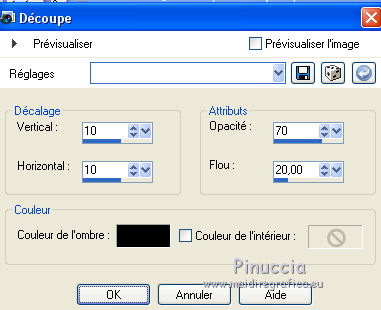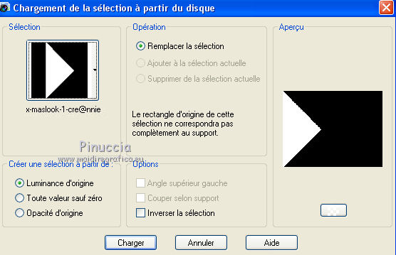 Ce tutoriel a été créé avec CorelX6 et traduit avec CorelX12, mais peut également être exécuté avec les autres versions. Suivant la version utilisée, vous pouvez obtenir des résultats différents. Depuis la version X4, la fonction Image>Miroir a été remplacée par Image>Renverser horizontalement, et Image>Renverser avec Image>Renverser verticalement. Dans les versions X5 et X6, les fonctions ont été améliorées par la mise à disposition du menu Objets. Avec la nouvelle version X7, nous avons encore Image>Miroir et Image>Renverser/Retourner, mais avec nouvelles différences. Voir les détails à ce sujet ici Certaines dénominations ont changées entre les versions de PSP. Les plus frequentes dénominations utilisées: ![]() Traduction en italien ici Vos versions ici Nécessaire pour réaliser ce tutoriel: Matériel ici Le tube utilisé pour la traduction en français est de Mentali. Le tube utilisé pour l'ancienne version du tutoriel est de Mary Modules Externes: consulter, si nécessaire, ma section des filtres ici Filters Unlimited ici Simple ici Toadies ici Two Moon ici Filtres Simple, Toadies et Two Moon peuvent être utilisés seuls ou importés dans Filters Unlimited. voir comment le faire ici). Si un filtre est fourni avec cette icône, Animation Shop ici ![]() en fonction des couleurs utilisées, vous pouvez changer le mode mélange et l'opacité des calques. Placer les sélections dans le dossier Sélections. 1. Ouvrir une nouvelle image transparente 650 x 500 pixels. 2. Placer en avant plan la couleur claire #f9f9f7, et en arrière plan la couleur foncée #0b020b. ![]() Remplir l'image transparente avec la couleur d'avant plan.3. Sélections>Sélectionner tout. Sélections>Modifier>Contracter - 25 pixels. Remplir la sélection avec la couleur d'arrière plan.4. Sélections>Modifier>Contracter - 25 pixels. Remplir la sélection avec la couleur d'avant plan.5. Sélections>Modifier>Contracter - 25 pixels. Remplir la sélection avec la couleur d'arrière plan.6. Sélections>Modifier>Contracter - 25 pixels. Remplir la sélection avec la couleur d'avant plan.Sélections>Désélectionner tout. 7. Effets>Modules Externes>Simple - Pizza Slice Mirror. 8. Calques>Dupliquer. Image>Miroir. Réduire l'opacité de ce calque à 50%. Calques>Fusionner>Fusionner le calque de dessous. 9. Activer l'outil Baguette magique ![]() ![]() cliquer dans le rectangle à droite pour le sélectionner. ![]() 10. Effets>Effets de textures>Stores, couleur d'arrière plan. ![]() Sélections>Transformer la sélection en calque. 11. Effets>Effets de textures>Stores, horizontal décoché. ![]() Sélections>Désélectionner tout. 12. Image>Miroir. Calques>Fusionner>Fusionner le calque de dessous. 13. Calques>Dupliquer. Image>Rotation libre - 90 degrés à droite. ![]() 14. Effets>Modules Externes>Two Moon - Emboston. ![]() Réduire l'opacité de ce calque à 50%. Calques>Fusionner>Fusionner le calque de dessous. 15. Calques>Dupliquer. Effets>Modules Externes>Simple - Blintz. Réduire l'opacité de ce calque à 50%. Calques>Fusionner>Fusionner le calque de dessous. 16. Sélections>Charger/Enregistrer une sélection>Charger à partir du disque. Chercher et charger la sélection x-maslook-1-cre@nnie. ![]() Édition>Copier (attention: vous devrez tenir en mémoire l'image jusqu'à l'étape 22). Sélections>Désélectionner tout. 17. Image>Redimensionner, à 50%, redimensionner tous les calques décoché. Réglage>Netteté>Davantage de netteté. 18. Image>Ajouter des bordures, 2 pixels, symétrique, couleur d'arrière plan. Image>Ajouter des bordures, symétrique décoché, couleur d'avant plan. ![]() 19. Image>Ajouter des bordures, 10 pixels, symétrique, couleur d'arrière plan. Image>Ajouter des bordures, 75 pixels, symétrique, couleur d'avant plan. 20. Sélectionner le bord de 10 pixels avec la baguette magique ![]() Sélections>Transformer la sélection en calque. Sélections>Désélectionner tout. 21. Effets>Modules Externes>Toadies - What are you, par défaut. ![]() 22. Édition>Coller comme nouveau calque. 23. Effets>Effets d'image>Décalage. ![]() 24. Réglage>Flou>Flou radial. ![]() 25. Effets>Modules Externes>Two Moon - Emboston, 2 times, comme précédemment. 26. Calques>Dupliquer. Image>Miroir. Calques>Fusionner>Fusionner le calque de dessous. 27. Sélections>Charger/Enregistrer une sélection>Charger à partir du disque. Chercher et charger la sélection x-maslook-2-cre@nnie. ![]() Presser CANC sur le clavier ![]() 28. Sélections>Inverser. Calques>Nouveau calque raster. Effets>Effets 3D>Découpe. ![]() 29. Calques>Nouveau calque raster. Répéter l'Effet Découpe, mais vertical et horizontal -10. ![]() Sélections>Désélectionner tout. 30. Image>Ajouter des bordures, 75 pixels, symétrique, couleur d'arrière plan. 31. Activer le tube fin-annee14-verocreation - Édition>Copier. Revenir sur votre travail et Édition>Coller comme nouveau calque. Image>Redimensionner, à 60%, redimensionner tous les calques décoché. 32. Effets>Effets 3D>Ombre portée, couleur noire. ![]() 33. Déplacer le tube à gauche.34. Activer le tube Mary 0912-23 - Édition>Copier. Revenir sur votre travail et Édition>Coller comme nouveau calque. Image>Redimensionner, à 75%, redimensionner tous les calques décoché. 35. Effets>Effets 3D>Ombre portée, comme précédemment. Déplacer le tube à droite.36. Signer votre travail sur un nouveau calque (attention: ne pas écrire sur le bord). 37. Activer le testo x-maslook - Édition>Copier. Revenir sur votre travail et Édition>Coller comme nouveau calque. Positionner le texte en haut, voir mon exemple.38. Vous positionner sur le calque du bas de la pile. Sélectionner le bord avec la baguette magique ![]() ![]() Sélections>Transformer la sélection en calque. Calques>Agencer>Placer en haut de la pile. 39. Effets>Modules Externes>VM Natural - Sparkle. ![]() Sélections>Désélectionner tout. 40. Édition>Copie Spéciale>Copier avec fusion. Ouvrir Animation Shop et É
