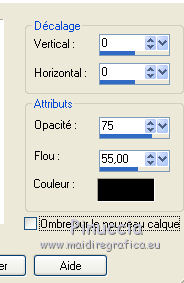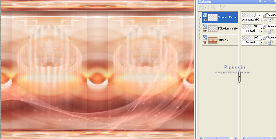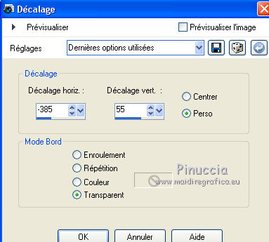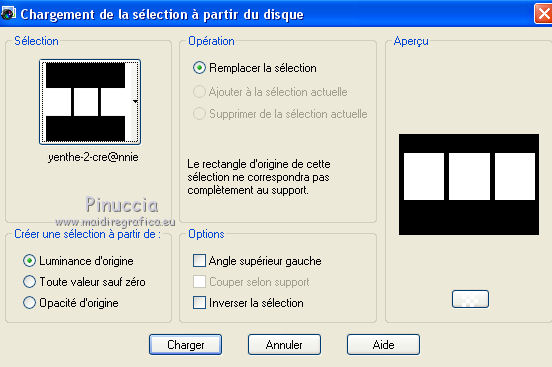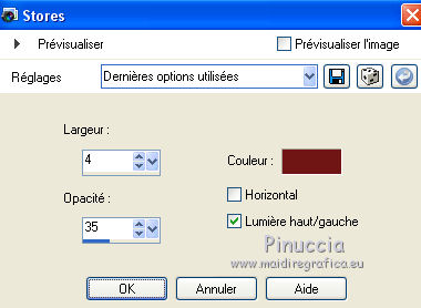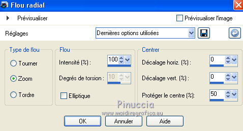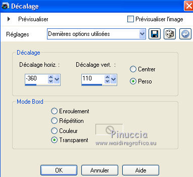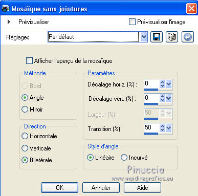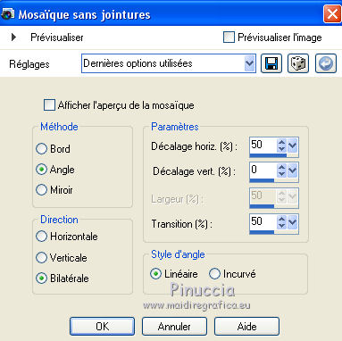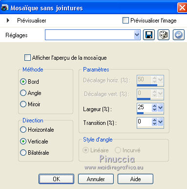 Ce tutoriel a été créé avec CorelX6 et traduit avec CorelX12, mais il peut également être exécuté avec les autres versions. Suivant la version utilisée, vous pouvez obtenir des résultats différents. Depuis la version X4, la fonction Image>Miroir a été remplacée par Image>Renverser horizontalement, et Image>Renverser avec Image>Renverser verticalement. Dans les versions X5 et X6, les fonctions ont été améliorées par la mise à disposition du menu Objets. Avec la nouvelle version X7, nous avons encore Image>Miroir et Image>Renverser/Retourner, mais avec nouvelles différences. Voir les détails à ce sujet ici Certaines dénominations ont changées entre les versions de PSP. Les plus frequentes dénominations utilisées: ![]() Traduction en italien ici Vos versions ici Nécessaire pour réaliser ce tutoriel: Matériel ici Merci pour le tube Annelies et pour le masque Occhiblu Modules Externes: consulter, si nécessaire, ma section des filtres ici Filters Unlimited 2.0 qui Mehdi - Weaver qui Alien Skin Eye Candy 5 Impact - Motion Trail, Glass qui RCS Filter pack 1.0 qui Toadies - What are you qui Mura's Meister - Perspective Tiling qui Filtres RCS et Toadies peuvent être utilisés seuls ou importés dans Filters Unlimited. voir comment le faire ici) mais ils peuvent obtenir des résultats différents. ![]() en fonction des couleurs utilisées, vous pouvez changer le mode mélange et l'opacité des calques. Placer les presets En cliquant sur le preset une ou deux fois (selon vos réglages) automatiquement il se placera directement dans le dossier Settings de Alien Skin Eye Candy. pourquoi un ou deux clic voir ici Placer les sélections dans le dossier Sélections. Ouvrir le masque dans PSP et le minimiser avec le reste du matériel. 1. Ouvrir une nouvelle image transparente 650 x 500 pixels. 2. Placer en avant plan la couleur claire #fcfbf7, et en arrière plan la couleur foncée #701714. ![]() 3. Remplir l'image transparente avec la couleur d'avant plan.4. Calques>Nouveau calque raster. Sélections>Sélectionner tout. 5. Activer le tube Alies 1-2VR267-woman-10052015, Édition>Copier. ne pas fermer le tube: on va s'en servir plus tard Revenir sur votre travail et Édition>Coller dans la sélection. Sélections>Désélectionner tout. 6. Effets>Effets d'image>Mosaïque sans jointures. ![]() 7. Calques>Fusionner>Fusionner le calque de dessous. 8. Réglage>Flou>Flou radial. ![]() 9. Calques>Dupliquer. Image>Miroir. Placer le calque en mode Multiplier. 10. Calques>Fusionner>Fusionner le calque de dessous. 11. Calques>Dupliquer. Effets>Modules Externes>RCS Filter Pack 1.0 - RCS Digi-Lens - Atomic Split. ![]() Placer le calque en mode Lumière dure. 12. Image>Ajouter des bordures, symétrique décoché, couleur d'avant plan. ![]() 13. Effets>Modules Externes>RCS Filter Pack 1.0 - RCS Digi-Lens - Atomic Split, comme précédemment. 14. Effets>Effets d'image>Mosaïque sans jointures. ![]() 15. Calques>Nouveau calque raster. Sélections>Charger/Enregistrer une sélection>Charger à partir du disque. Chercher et charger la sélection yenthe-1-cre@nnie. ![]() Remplir la sélection avec la couleur d'avant plan.Sélections>Désélectionner tout. 16. Effets>Modules Externes>Alien Skin Eye Candy 5 Impact - Motion Trail. Sélectionner le preset yenthe-cre@nnie et ok. En cas de problèmes avec le preset, vous pouvez copier les règlages dans capture. ![]() 17. Effets>Effets de textures>Stores, couleur d'arrière plan. ![]() 18. Calques>Dupliquer. Image>Redimensionner, à 60%, redimensionner tous les calques décoché. 19. Sélections>Charger/Enregistrer une sélection>Charger à partir du disque. Charger à nouveau la sélection yenthe-1-cre@nnie. ![]() Presser CANC sur le clavier ![]() Sélections>Désélectionner tout. 20. Calques>Fusionner>Fusionner le calque de dessous. Placer le calque en mode Luminance (héritée). 21. Vous positionner sur le calque du bas de la pile. Activer l'outil Sélection ![]() (peu importe le type de sélection, parce que avec la sélection personnalisée vous obtenez toujours un rectangle), cliquer sur Sélection personnalisée ![]() et setter ces paramètres. ![]() Sélections>Transformer la sélection en calque. Sélections>Désélectionner tout. 22. Effets>Effets Géométriques>Cercle. ![]() 23. Effets>Modules Externes>Mehdi - Weaver. ![]() Placer le calque en mode Éclaircir. 24. Effets>Effets d'image>Mosaïque sans jointures. ![]() 25. Calques>Fusionner>Calques visibles. 26. Édition>Copier. 27. Image>Ajouter des bordures, 50 pixels, symétrique, couleur d'arrière plan. 28. Effets>Effets d'image>Mosaïque sans jointures, comme précédemment. 29. Activer l'outil Baguette magique ![]() ![]() et cliquer sur le bord supérieur pour le sélectionner. 30. Édition>Coller dans la sélection. 31. Effets>Effets 3D>Ombre portée, couleur noire. ![]() Sélections>Transformer la sélection en calque. Sélections>Désélectionner tout. 32. Image>Renverser. Calques>Nouveau calque raster. Remplir avec la couleur d'avant plan.33. Calques>Nouveau calque de masque>A partir d'une image. Ouvrir le menu deroulant sous la fenêtre d'origine et vous verrez la liste des images ouverts. Sélectionner le masque OBG_Mask_18. ![]() Calques>Fusionner>Fusionner le groupe. Placer le calque en mode Luminance (héritée) et réduire l'opacité à 65%. ![]() 34. Calques>Fusionner>Calques visibles. 35. Édition>Copier. 36. Sélections>Charger/Enregistrer une sélection>Charger à partir du disque. Chercher et charger la sélection yenthe-2-cre@nnie. ![]() 37. Édition>Coller dans la sélection. 38. Effets>Modules Externes>Alien Skin Eye Candy 5 Impact - Glass. Seleziona il preset yenthe-cre@nnie-glass e ok. ![]() Voici les règlages en cas de problèmes avec le preset. ![]() Sélections>Désélectionner tout. 39. Image>Miroir. Effets>Effets 3D>Ombre portée, comme précédemment. 40. Sélections>Sélectionner tout. Image>Ajouter des bordures, symétrique décoché, couleur d'avant plan. 