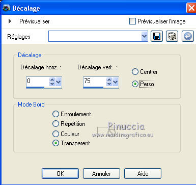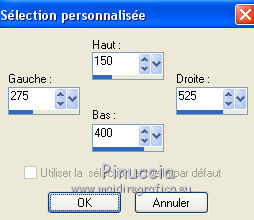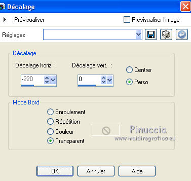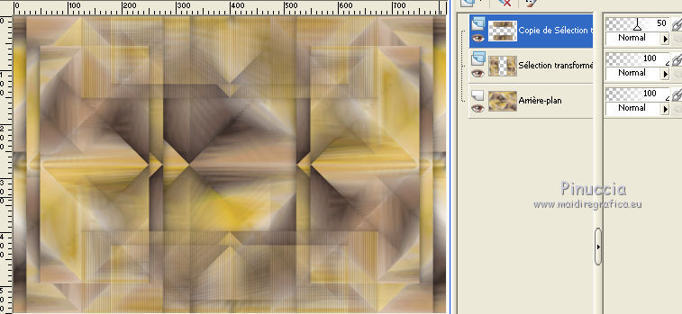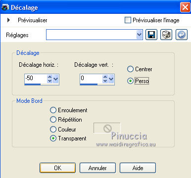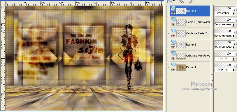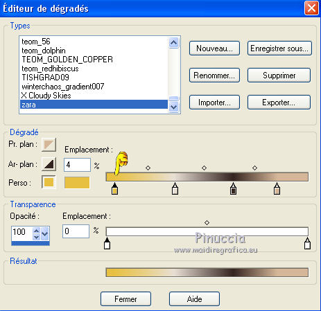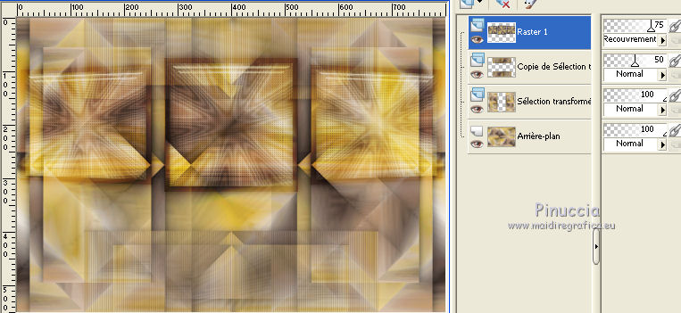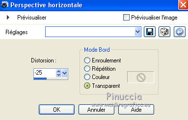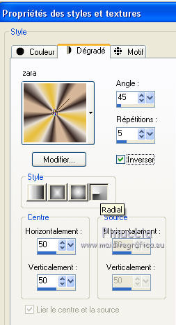 Ce tutoriel a été créé avec CorelX6 et traduit avec CorelX12, mais il peut également être exécuté avec les autres versions. Suivant la version utilisée, vous pouvez obtenir des résultats différents. Depuis la version X4, la fonction Image>Miroir a été remplacée par Image>Renverser horizontalement, et Image>Renverser avec Image>Renverser verticalement. Dans les versions X5 et X6, les fonctions ont été améliorées par la mise à disposition du menu Objets. Avec la nouvelle version X7, nous avons encore Image>Miroir et Image>Renverser/Retourner, mais avec nouvelles différences. Voir les détails à ce sujet ici Certaines dénominations ont changées entre les versions de PSP. Les plus frequentes dénominations utilisées: ![]() Traduction en italien ici Vos versions ici Nécessaire pour réaliser ce tutoriel: Matériel ici Merci pour le tube Tocha Modules Externes: consulter, si nécessaire, ma section des filtres ici Mehdi - Sorting Tiles qui Alien Skin Eye Candy 5 Impact - Perspective Tiling, Glass qui Xero - Titanium qui Ap Lines - Lines SilverLining qui Mura's Meister - Perspective Tiling qui ![]() en fonction des couleurs utilisées, vous pouvez changer le mode mélange et l'opacité des calques. Placer les presets En cliquant sur le preset une ou deux fois (selon vos réglages) automatiquement il se placera directement dans le dossier Settings de Alien Skin Eye Candy. pourquoi un ou deux clic voir ici Placer le dégradé dans le dossier Dégradés. 1. Ouvrir une nouvelle image transparente 650 x 500 pixels. 2. Placer en avant plan la couleur claire #e7dfd4, et en arrière plan la couleur foncée #352420. ![]() 3. Placer en avant plan Dégradé et sélectionner le dégradé Zara, style Radial. ![]() si vous voulez modifier le dégradé, clic sur Modifier, ensuit clic sur l'"encrier" et sur la palette de la couleur perso eet choisir votre couleur. ![]() Fermer la fenêtre et réponder oui à la question si vous voulez enregistrer les modifications Remplir l'image transparente du dégradé.4. Réglage>Flou>Flou gaussien - rayon 10. ![]() 5. Effets>Modules Externes>Xero - Titanium ![]() 6. Effets>Effets d'image>Mosaïque sans jointures. ![]() 7. Édition>Copier. 8. Effets>Modules Externes>Mehdi - Sorting Tiles. ![]() 9. Sélections>Sélectionner tout. Image>Ajouter des bordures, symétrique décoché, couleur d'avant plan. ![]() Sélections>Inverser. 10. Édition>Coller dans la sélection. Sélections>Transformer la sélection en calque. Sélections>Désélectionner tout. 11. Effets>Effets 3D>Découpe. ![]() Résultat ![]() 12. Calques>Fusionner>Fusionner le calque de dessous. 13. Effets>Effets d'image>Mosaïque sans jointures. ![]() 14. Activer l'outil Sélection ![]() (peu importe le type de sélection, parce que avec la sélection personnalisée vous obtenez toujours un rectangle), cliquer sur Sélection personnalisée ![]() et setter ces paramètres. ![]() Sélections>Transformer la sélection en calque. 15. Effets>Effets 3D>Ombre portée, couleur noire. ![]() Sélections>Désélectionner tout. 16. Effets>Effets d'image>Décalage. ![]() Image>Renverser. 17. Calques>Dupliquer. Image>Redimensionner, all'80%, redimensionner tous les calques décoché. Image>Renverser. 18. Effets>Effets d'image>Décalage, comme précédemment. ![]() Calques>Fusionner>Fusionner le calque de dessous. 19. Calques>Dupliquer. Image>Miroir. Image>Renverser. Calques>Fusionner>Fusionner le calque de dessous. 20. Calques>Dupliquer. Image>Rotation libre - 90 degrés à gauche. ![]() 21. Effets>Effets de textures>Stores, couleur d'arrière plan. ![]() 22. Réduire l'opacité de ce calque à 50%. ![]() 23. Calques>Nouveau calque raster. Sélection personnalisée ![]() ![]() Remplir la sélection du dégradé.24. Réglage>Flou>Flou gaussien - rayon 10. ![]() 25. Effets>Modules Externes>Xero - Titanium, comme précédemment. Garder sélectionné. 26. Calques>Nouveau calque raster. Remplir la sélection avec la couleur d'arrière plan.27. Sélections>Modifier>Contracter - 10 pixels. Presser CANC sur le clavier ![]() 28. Garder toujours sélectionné. Calques>Fusionner>Fusionner le calque de dessous. 29. Effets>Modules Externes>AP lines - Lines SilverLining. Si vous voulez utiliser AP 01 Innovation - Lines SilverLining, le résultat ne change pas ![]() 30. Effets>Modules Externes>Alien Skin Eye Candy 5 Impact - Glass. Sélectionner le preset zara-cre@nnie et ok. ![]() Ci-dessous les paramètres, en cas de problèmes avec le preset. ![]() Sélections>Désélectionner tout. 41. Calques>Dupliquer. Effets>Effets géométriques>Perspective horizontale. ![]() 42. Effets>Effets d'image>Décalage. ![]() 43. Calques>Dupliquer. Image>Miroir. Calques>Fusionner>Fusionner le calque de dessous - 2 fois. 44. Effets>Effets d'image>Décalage. ![]() 45. Effets>Effets 3D>Ombre portée, comme précédemment. 46. Placer le calque en mode Recouvrement et réduire l'opacité à 75%. ![]() 47. Sélections>Sélectionner tout. Image>Ajouter des bordures, symétrique décoché, couleur d'arrière plan. ![]() 48. Effets>Effets d'image>Mosaïque sans jointures, comme précédemment. Sélections>Inverser. Réglage>Flou>Flou gaussien, comme précédemment. 49. Effets>Modules Externes>AP Lines - Lines SilverLining, comme précédemment. 50. Sélections>Inverser. Effets>Effets 3D>Ombre portée, comme précédemment. 51. Sélections>Transformer la sélection en calque. Sélections>Désélectionner tout. 52. Effets>Modules Externes>Mura's Meister - Perspective Tiling. ![]() Résultat ![]() 53. Effets>Effets 3D>Ombre portée, comme précédemment. 54. Ouvrir le tube wa-fashion-cre@nnie, - Édition>Copier. Revenir sur votre travail et ´dition>Coller comme nouveau calque. Image>Redimensionner, à 60%, redimensionner tous les calques décoché. 54. Déplacer le tube un peu plus en haut, sur le cadre.Placer le calque en mode Recouvrement. ![]() 55. Calques>Dupliquer. Réglage>Flou>Flou gaussien - rayon 5. ![]() 56. Effets>Effets géométriqu
