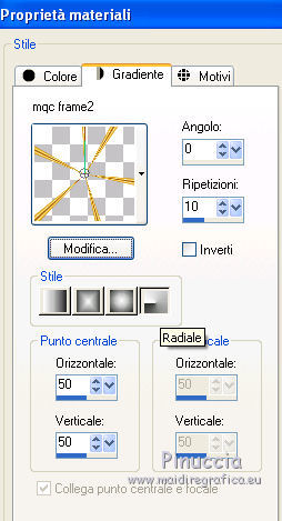 Passa il colore di primo piano a Gradiente, e seleziona il gradiente mqcFrame2, con i seguenti settaggi.