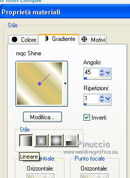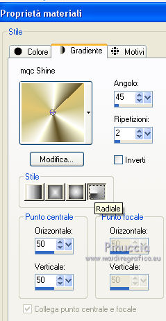 1. Passa il colore di primo piano a Gradiente, e seleziona il gradiente mqc Shine, con i seguenti settaggi.