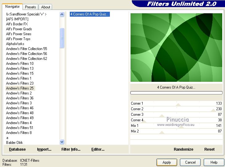 3. Effetti>Plugins>Filters Unlimited 2.0 - Andrew's Filter 25 - 4 Corners of A Pop Quiz