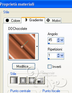 1. Passa il colore di primo piano a Gradiente, e seleziona il gradiente "DDChocolate", con i seguenti settaggi.