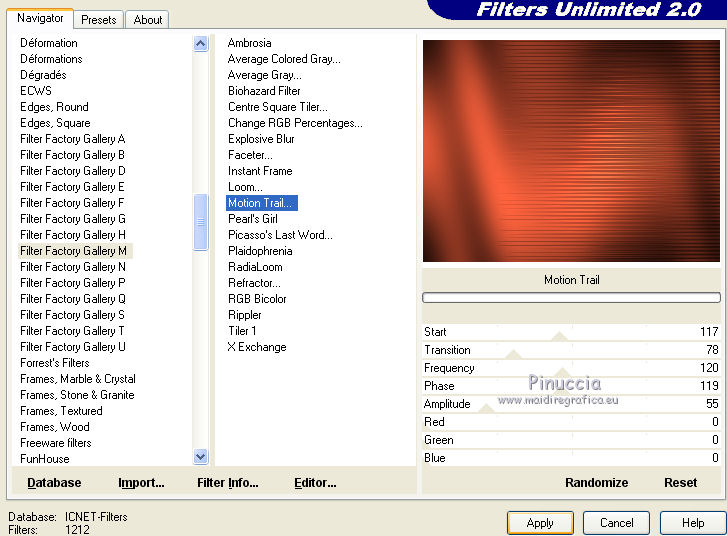 4. Effetti>Plugins>Filters Unlimited 2.0 - Filter Factory Gallery M - Motion Trail, con i settaggi standard.