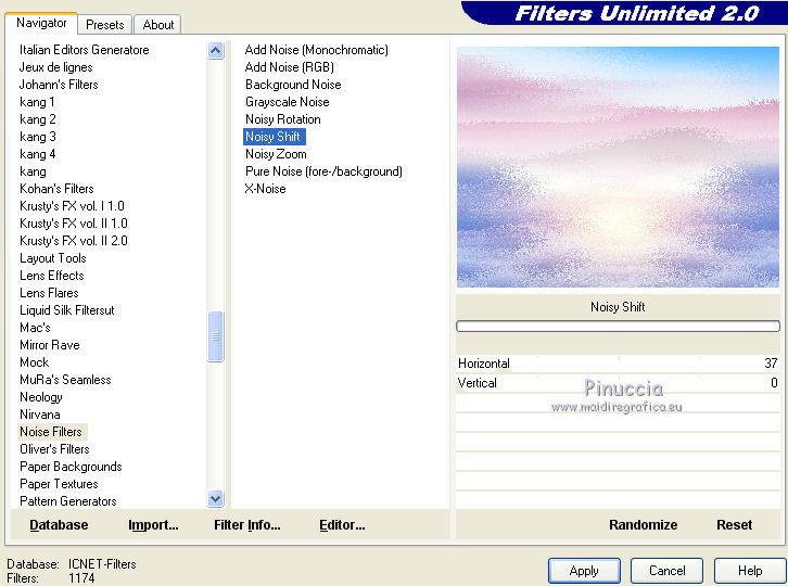 3. Effetti>Plugins>Filters Unlimited 2.0 - Noise Filters - Noisy Shift, con i settaggi standard.
