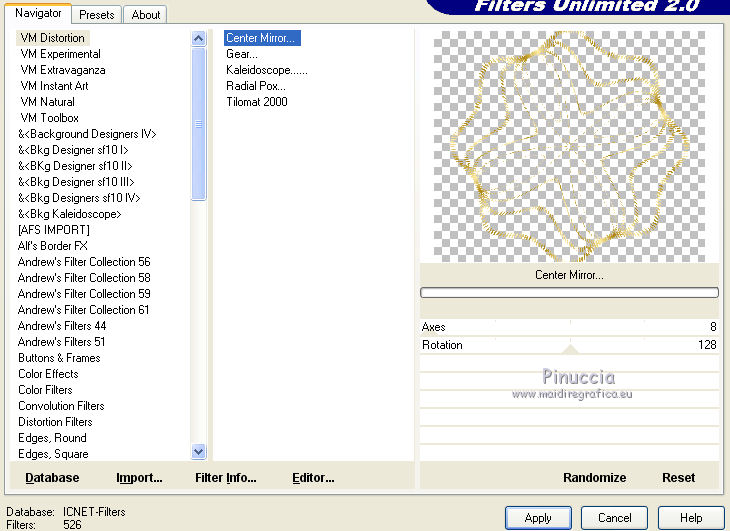 18. Effetti>Plugins>Filters Unlimited 2.0 - VM Distortion - Center Mirror, con i settaggi standard.