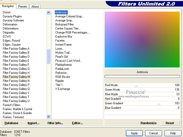 2. Effetti>Plugins>Filters Unlimited 2.0 - Filter Factory Gallery M - Ambrosia, con i settaggi standard.