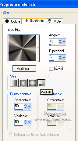 Passa il colore di primo piano a Gradiente, e seleziona il gradiente mqc Pity, con i seguenti settaggi.