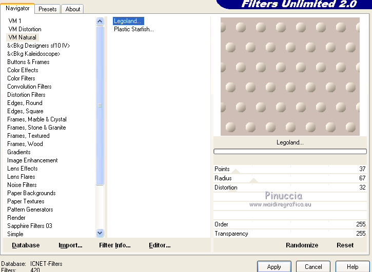 6. Effetti>Plugins>Filters Unlimited 2.0 - VM Natural - Legoland, con i settaggi precedenti.