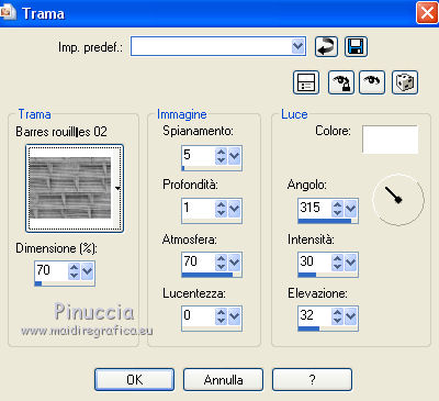 3. Effetti>Effetti di trama>Trama - seleziona la trama Barres rouillées02, con i seguenti settaggi.
