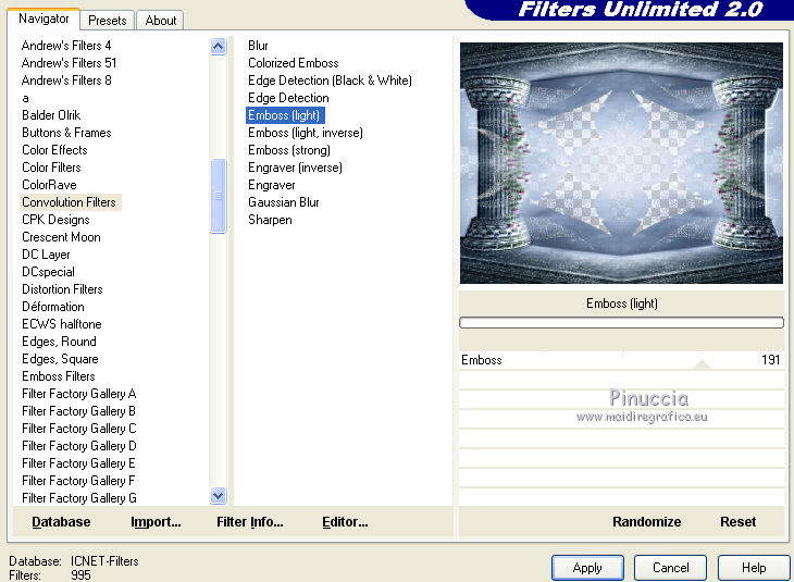 6. Effetti>Plugins>Filters Unlimited 2.0 - Convolution Filters - Emboss Light