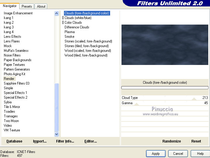 15. Effetti>Plugins>Filters Unlimited 2.0 - Render - Clouds (fore-/background color).